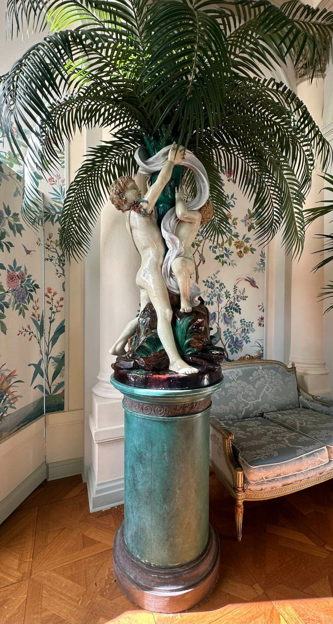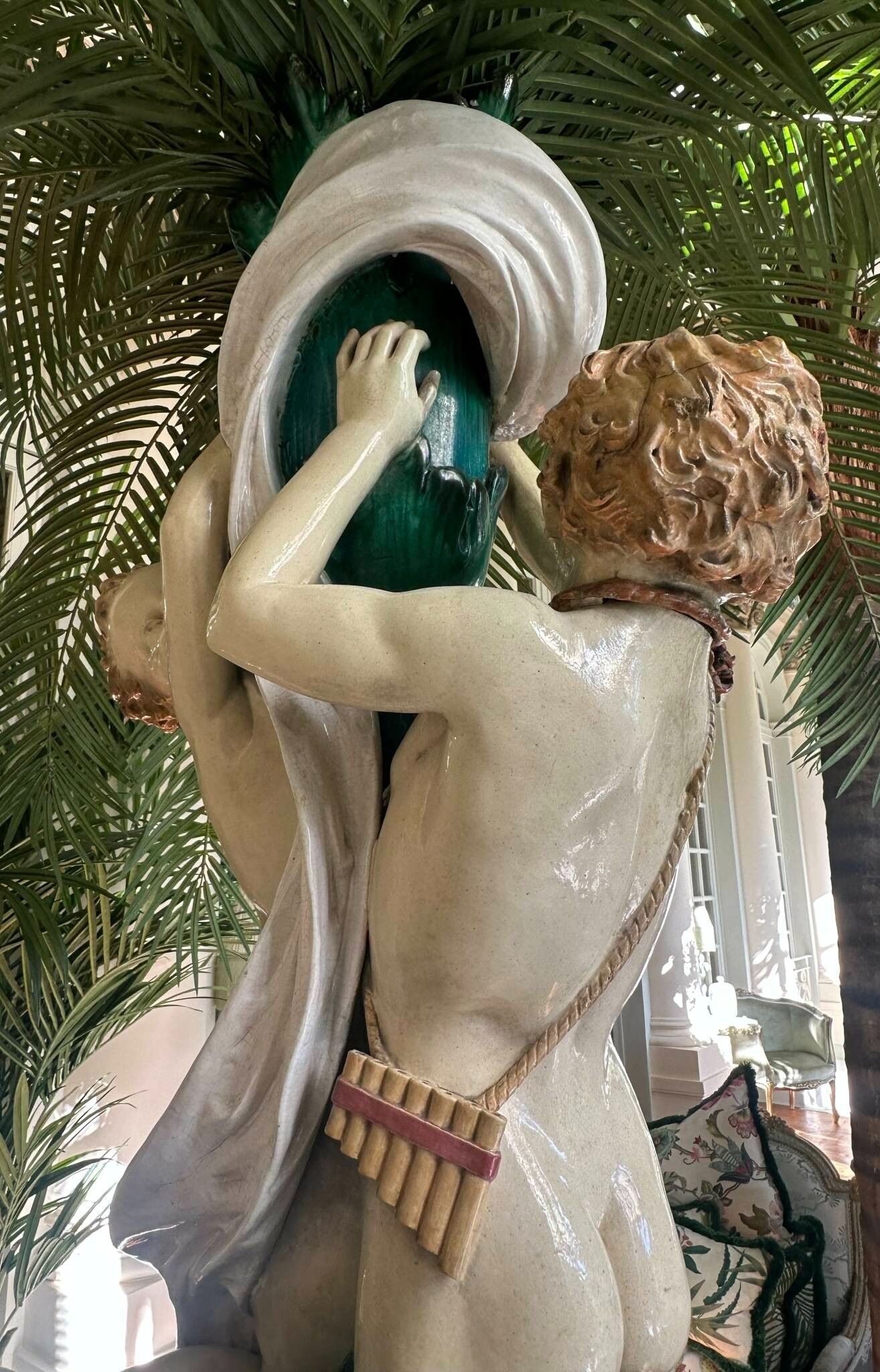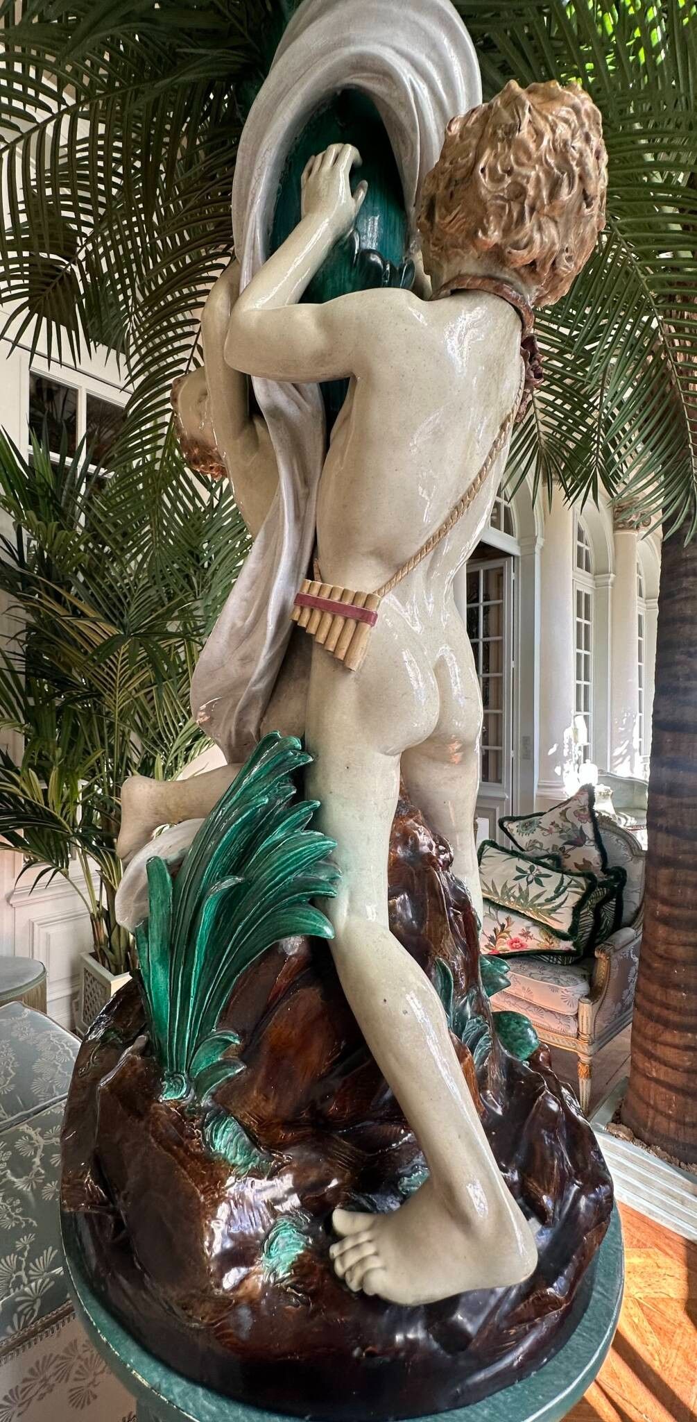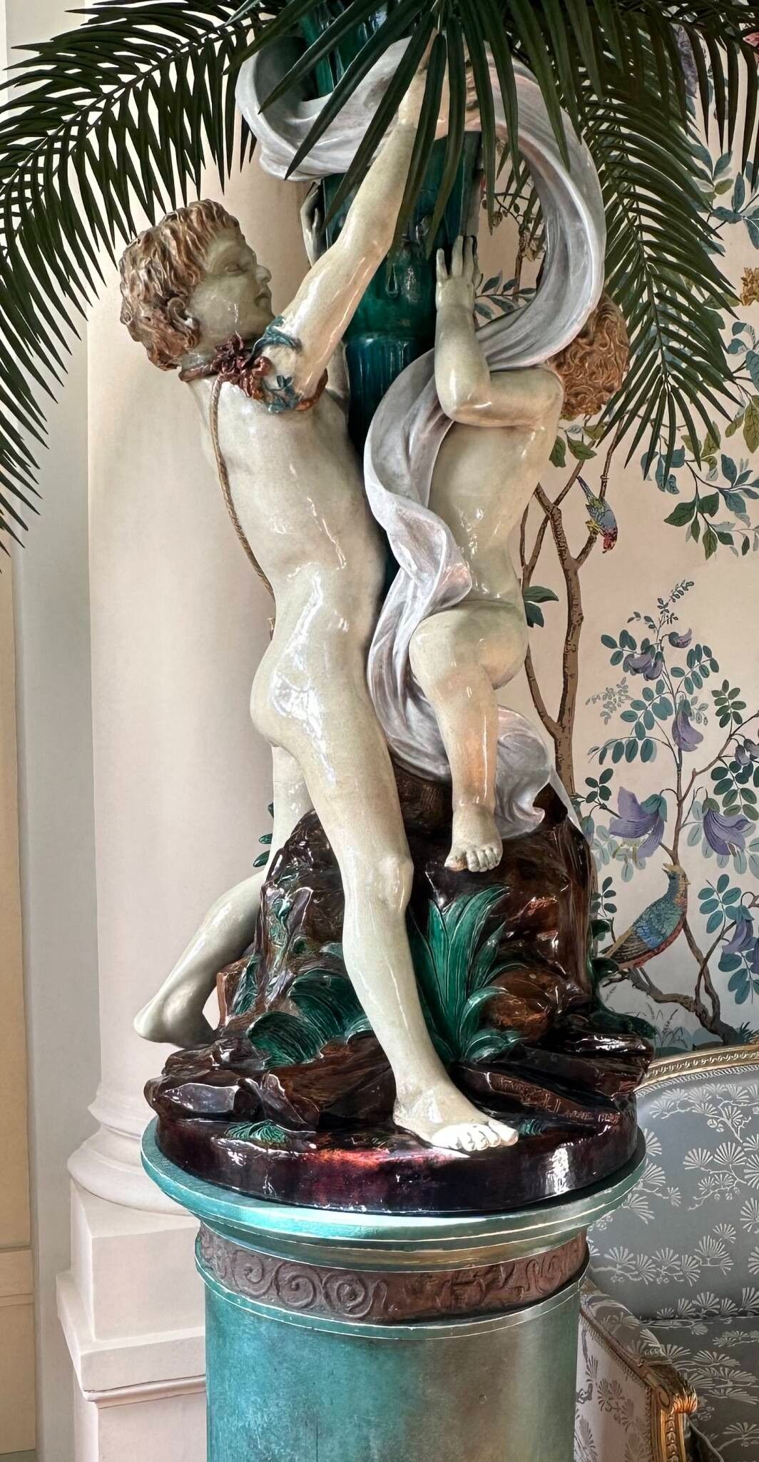 A large polychrome enamelled earthenware and barbotine vase decorated with two putti embracing a plant and supporting a bouffant drape.