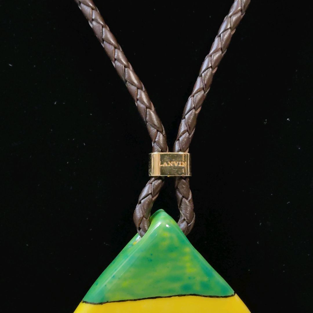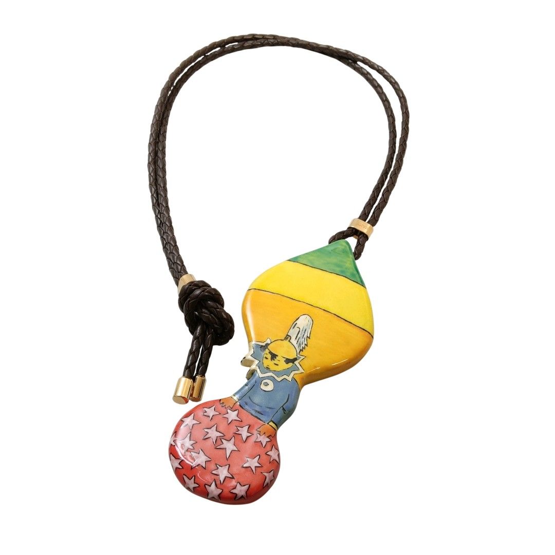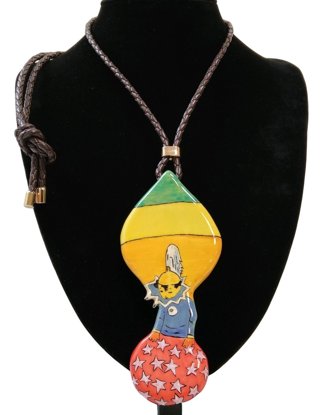 LANVIN. Painted porcelain pendant featuring a cartoon character mounted on a brown braided leather cord with gold trim. Cord length: 42 cm, adjustable height. Perfect condition, never worn.