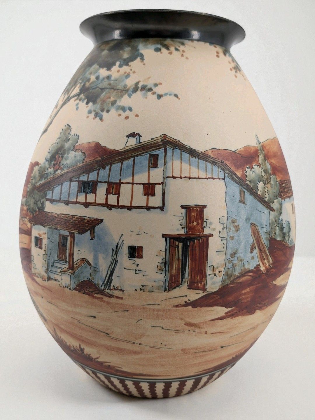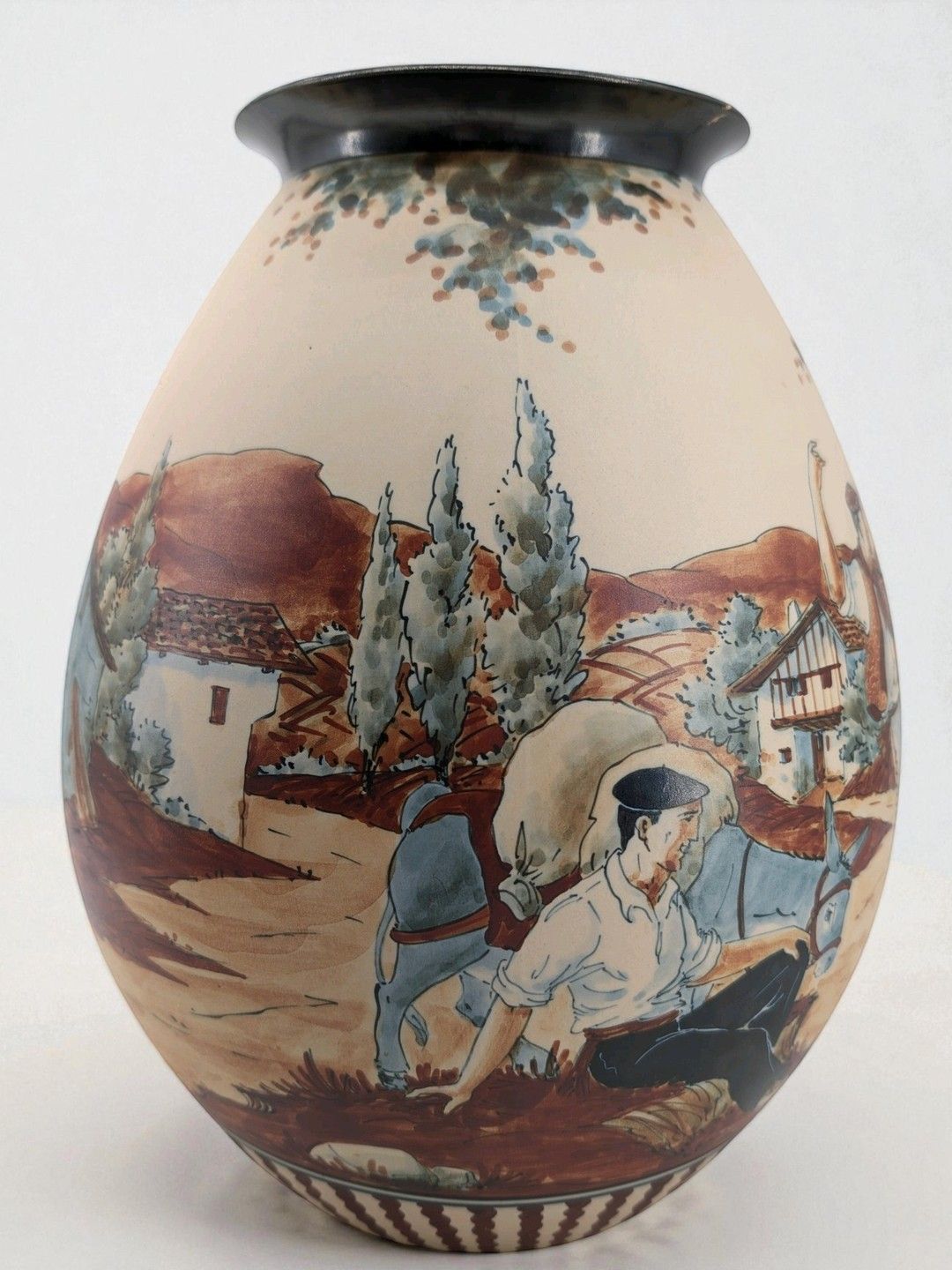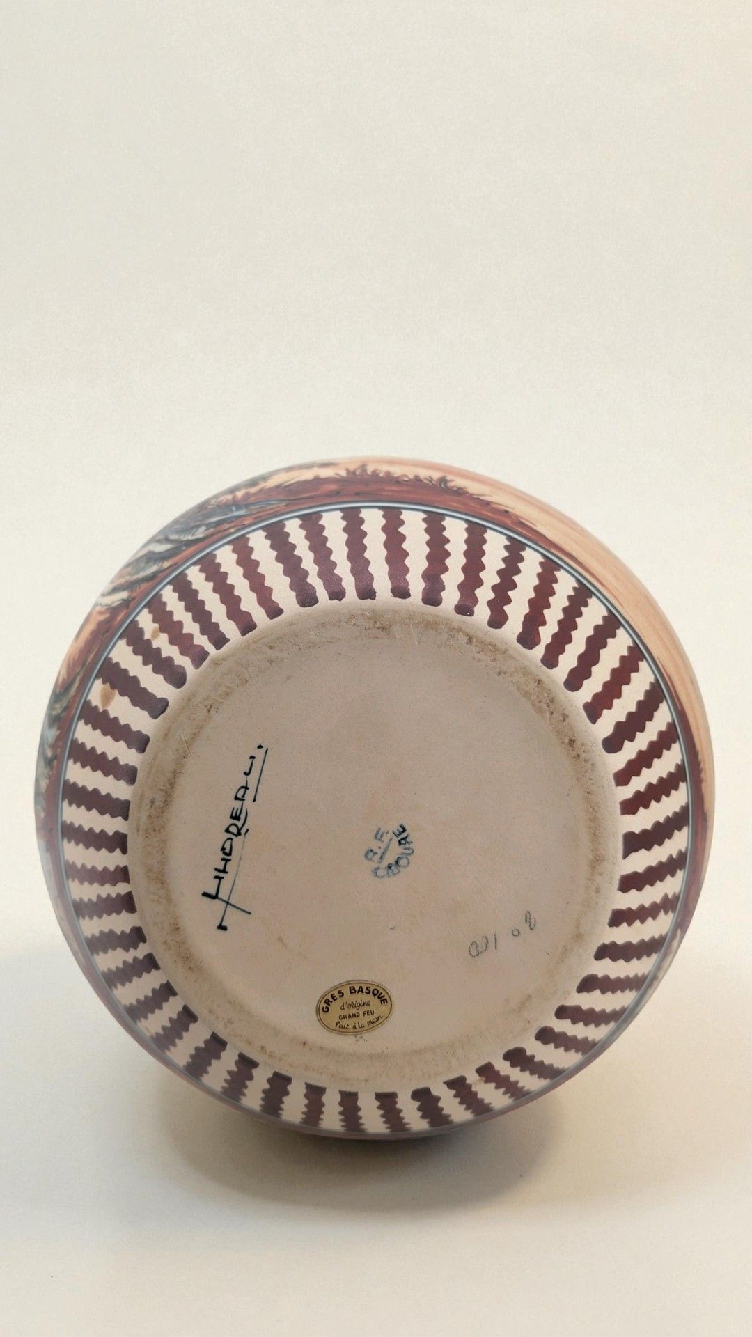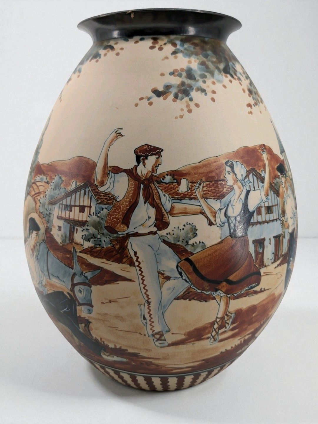 CIBOURE. Fischer period. Large stoneware vase with polychrome decoration of dancers and musicians in a Basque landscape. Stamp of the manufacture R.F.Ciboure. Signed under the base M.Moreau. Height 31 cm. Diameter at the base: 12 cm - This lot available everywhere in France from €17.40 - This lot available everywhere in Europe from €32.52