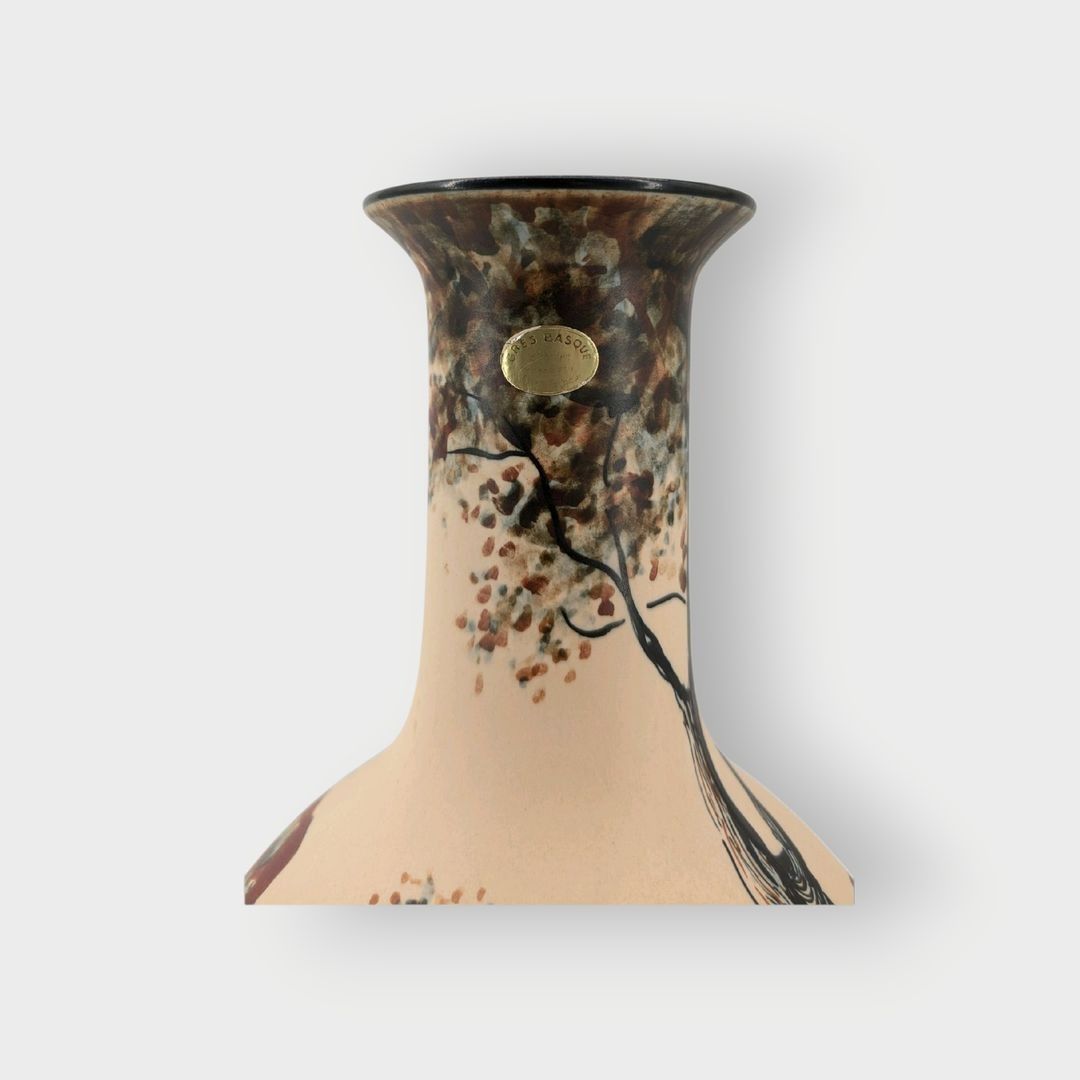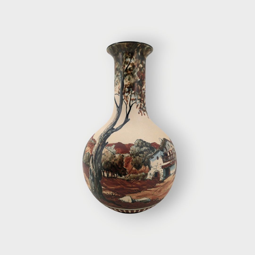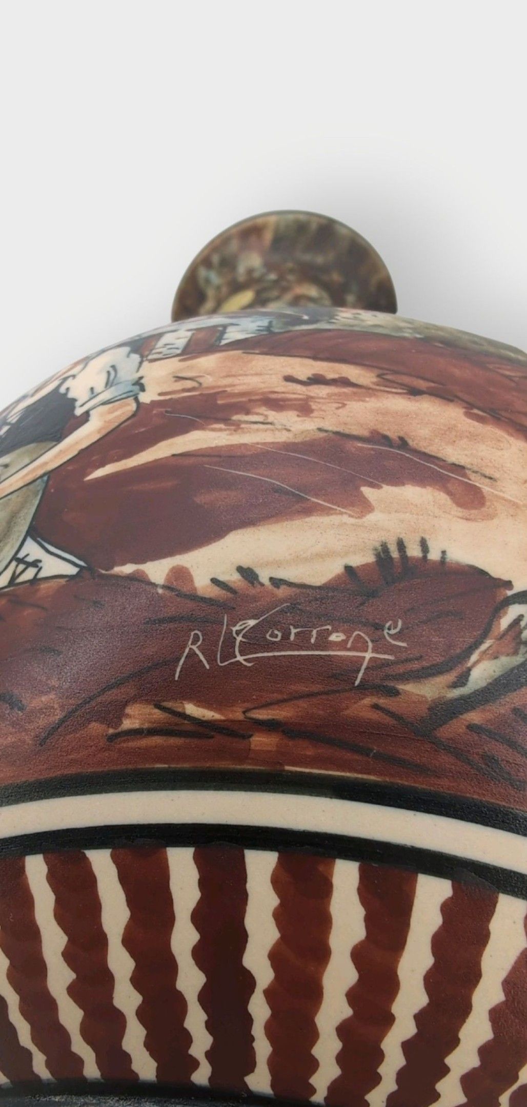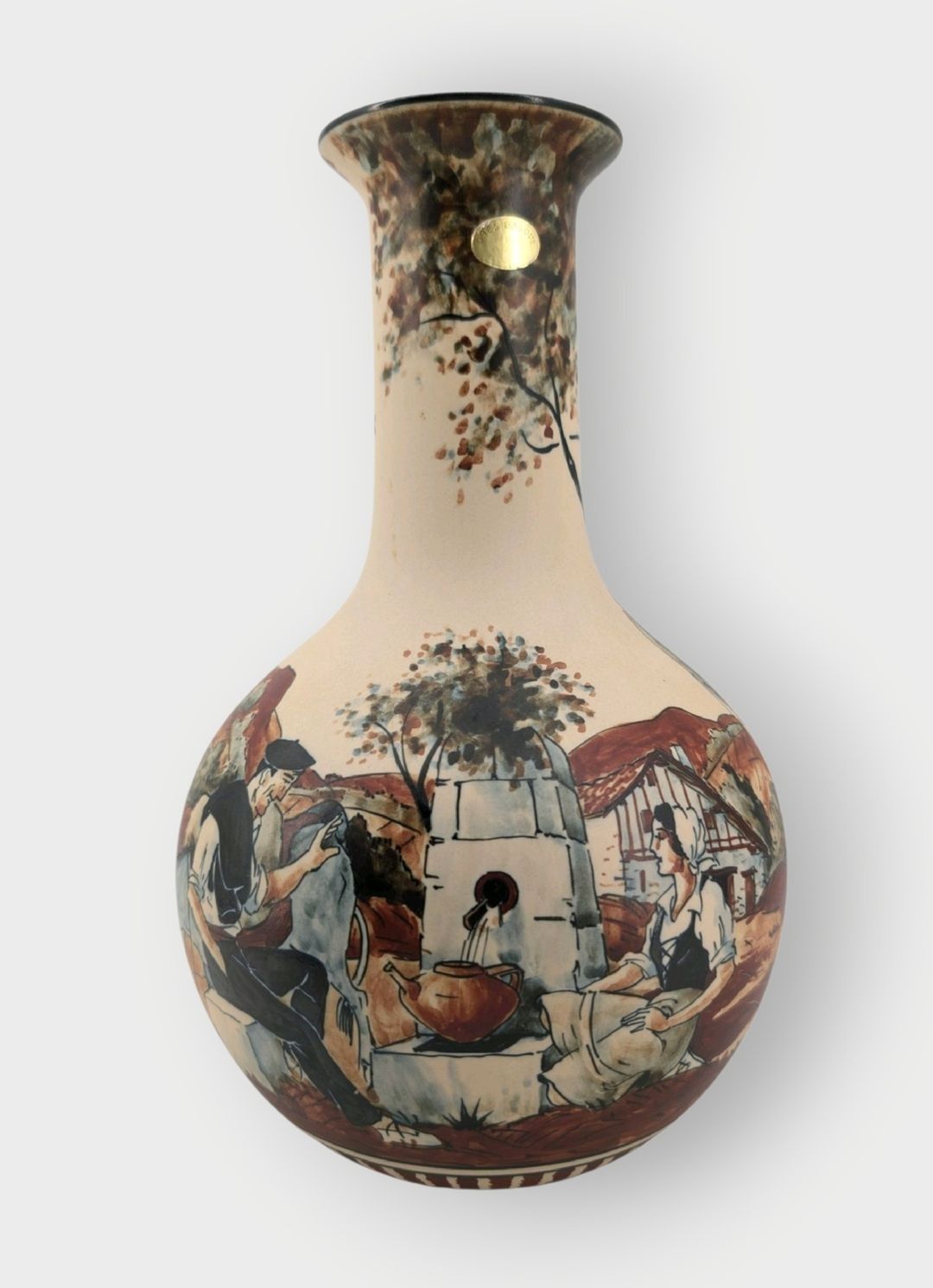 CIBOURE. Stoneware vase with polychrome decoration of a scene of life in a Basque landscape. Stamp of the manufacture R.F.Ciboure. Signed R.Le Corrone. Height 31 cm. Diameter at the base: 9.5 cm - This lot is available anywhere in France from €15.72 - This lot is available anywhere in Europe from €30.00