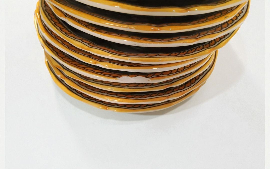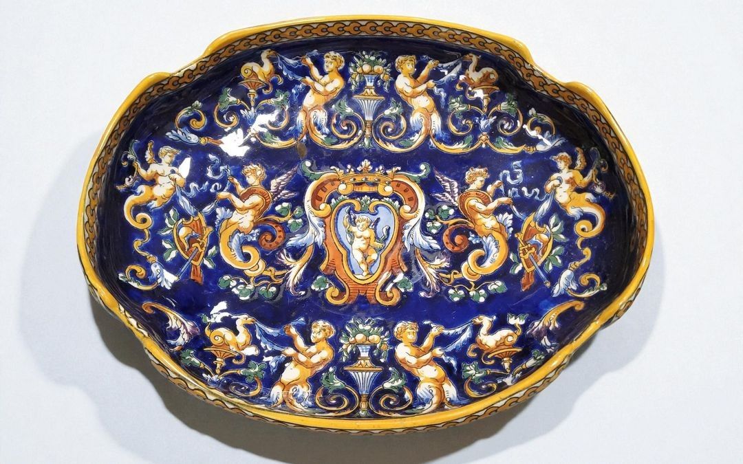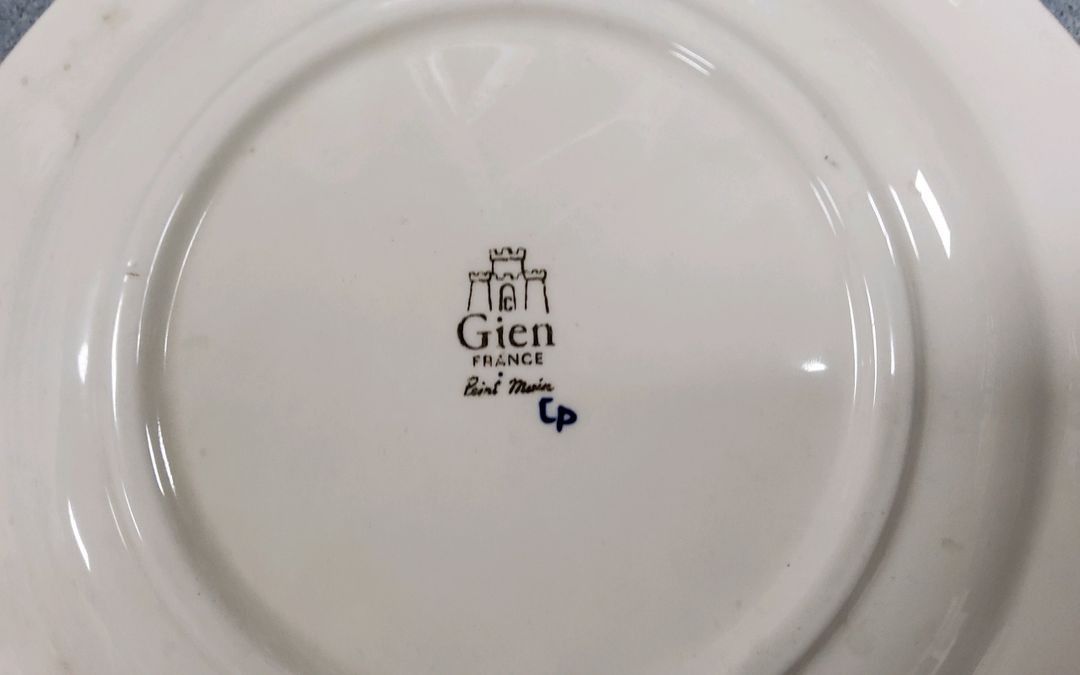 GIEN. Renaissance earthenware service including : - 10 coffee saucers - 12 coffee cups - 2 chocolate cups - 2 chocolate saucers - 1 round presentation dish - 1 large oval dish - 1 ravier - 1 milk jug - 1 large coffee pot - 1 jug - a sugar pot - 1 torch. 1 chip on a saucer. - Can be shipped on pallet
