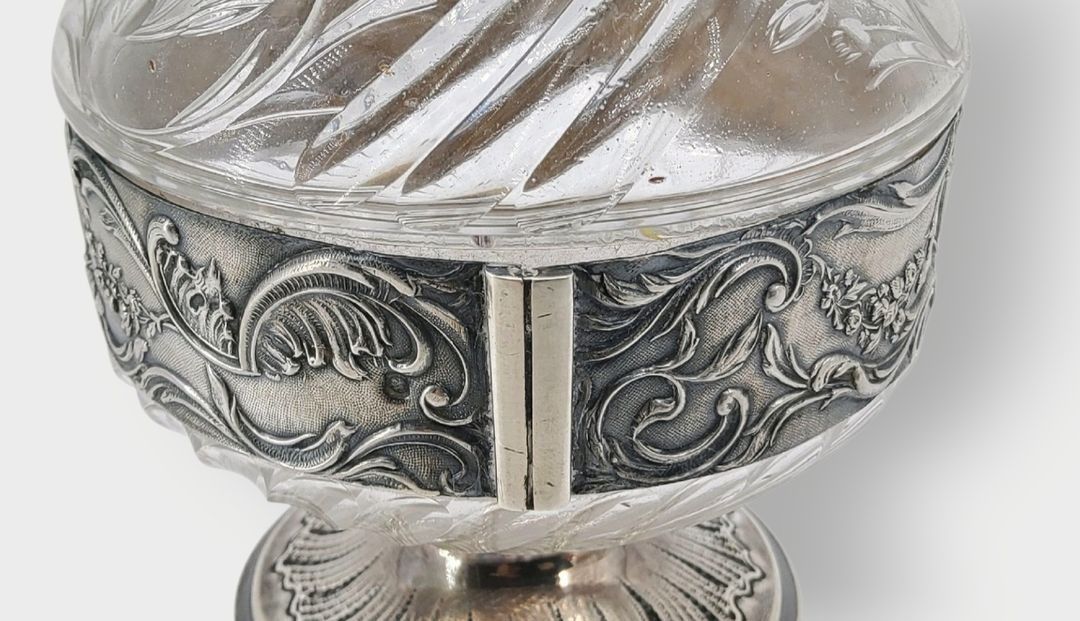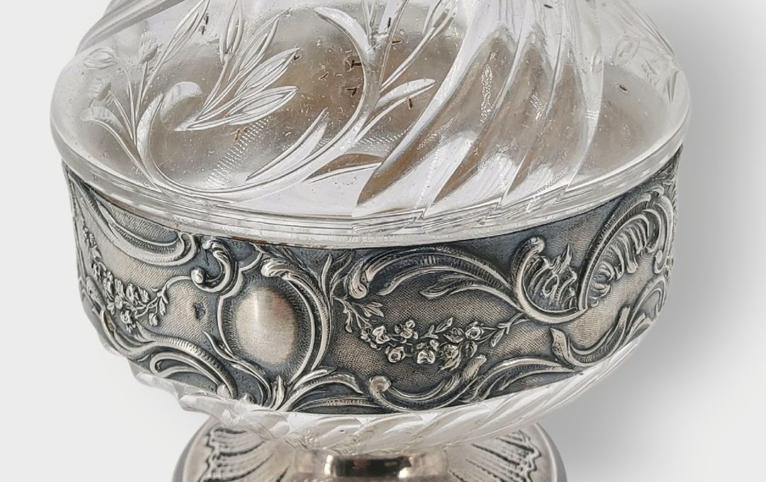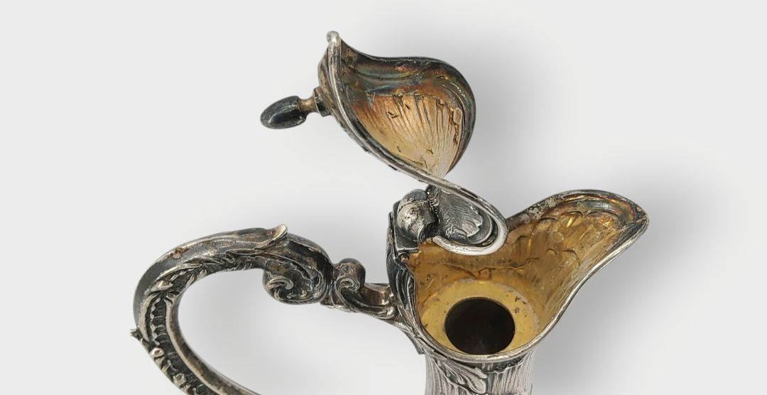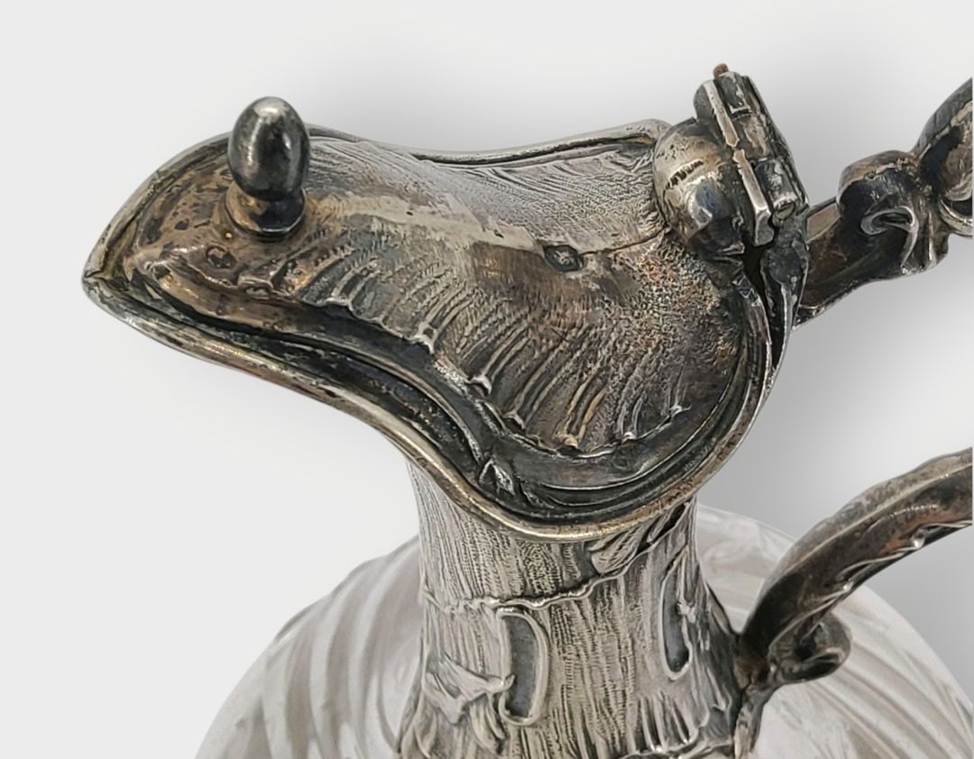 Silver ewer 950 thousandths with Rocaille decoration, the body in cut crystal. Diamond goldsmith's hallmark comprising two Ss separated by a scale. The hinged spout reveals a vermeil part. Gross weight: 504 grams. Height 24 cm. Marked Minerve 1st title. - This lot available anywhere in France from €12.24 - This lot available anywhere in Europe from €18.00