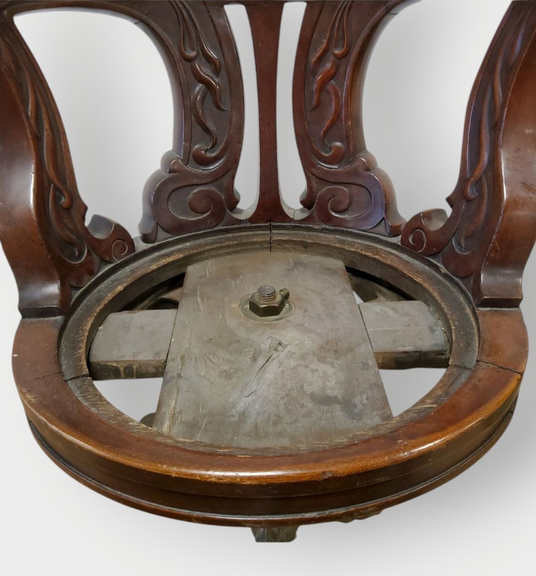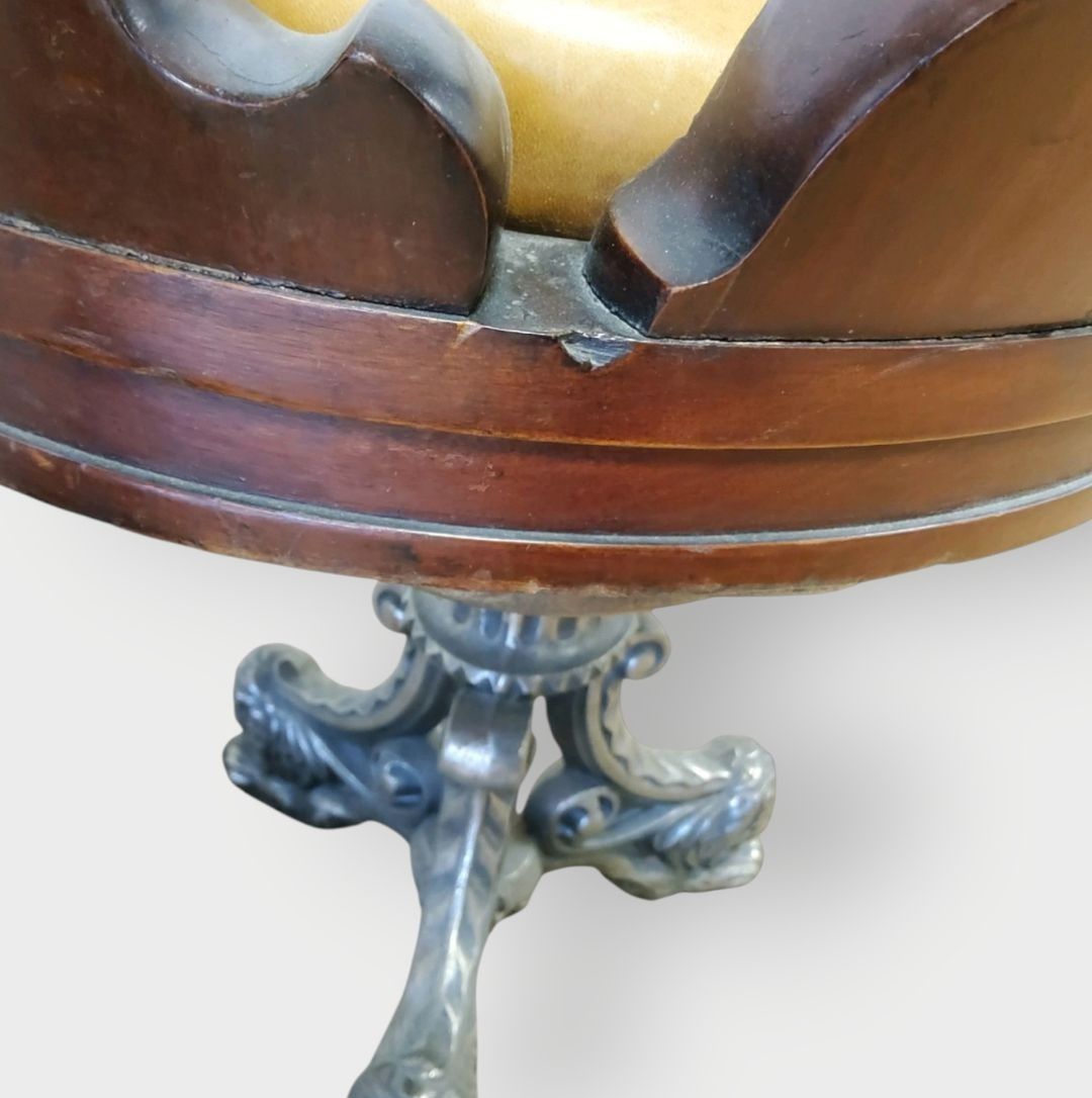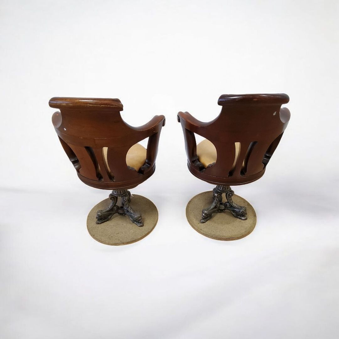 Pair of swivel marine armchairs in turned, moulded and carved mahogany. Cast iron tripod zoomorphic legs. One leather seat damaged. Late 19th century. H.90 cm - Can be shipped on pallet