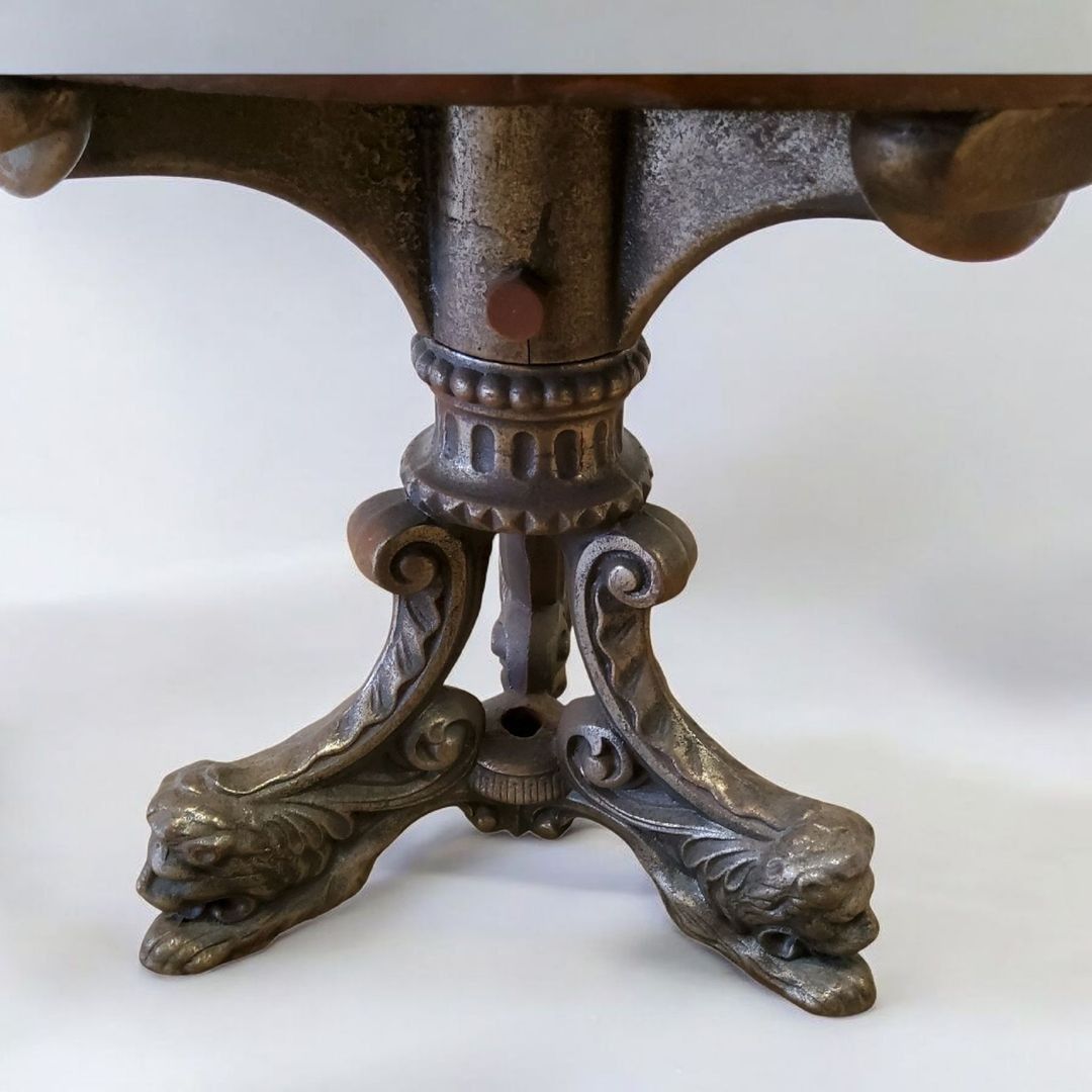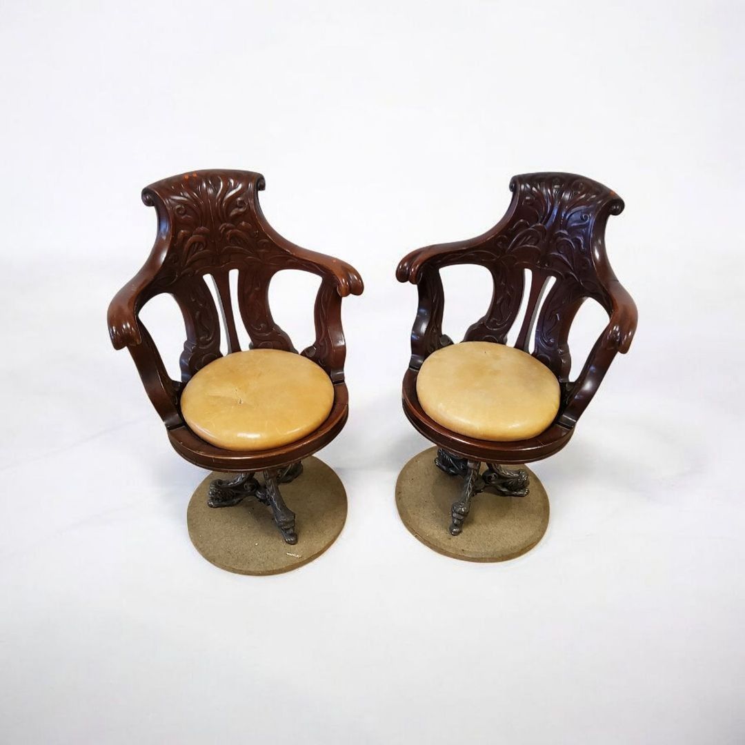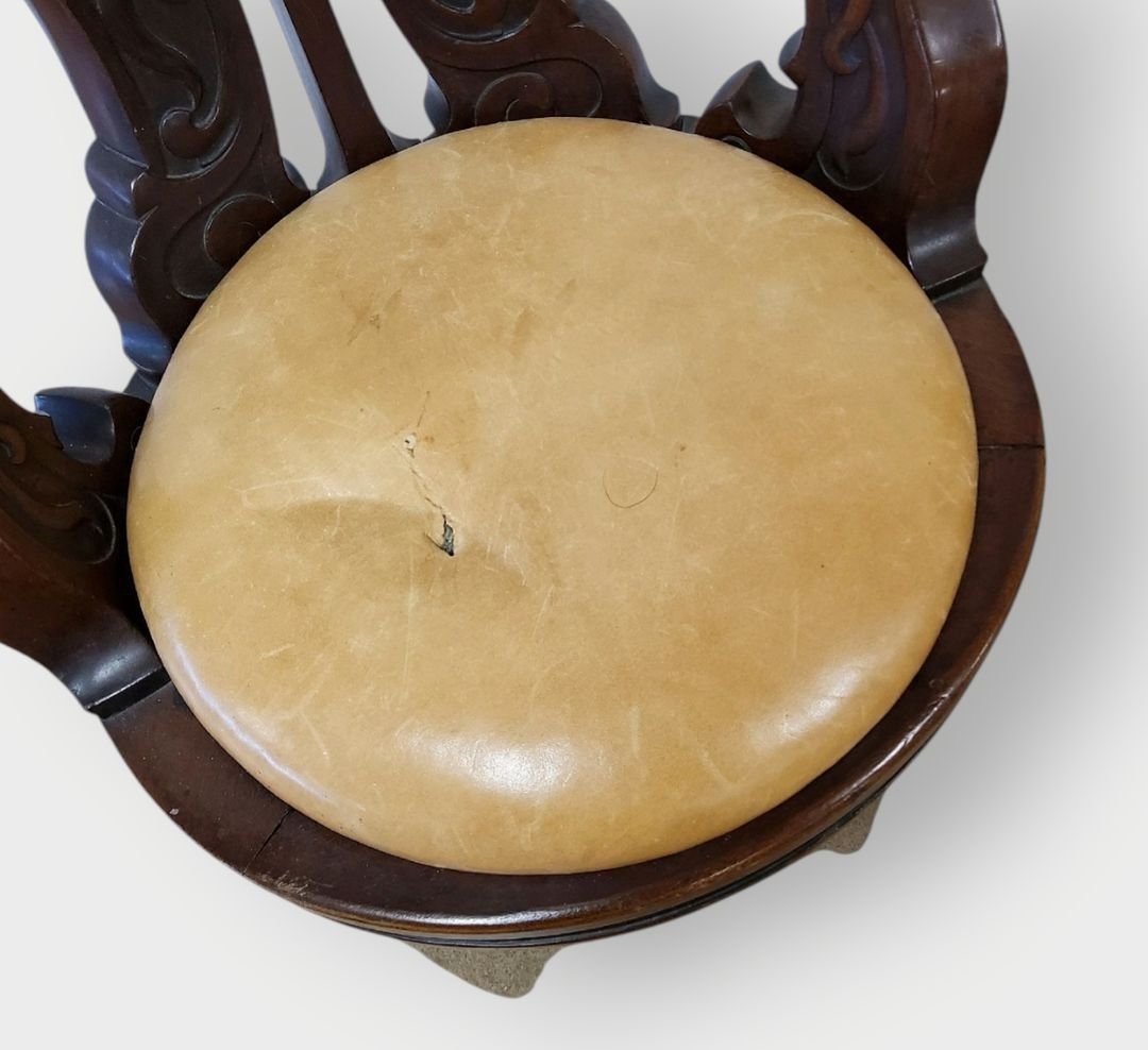 Pair of swivel marine armchairs in turned, moulded and carved mahogany. Cast iron tripod zoomorphic legs. One leather seat damaged. Late 19th century. H.90 cm - Can be shipped on pallet