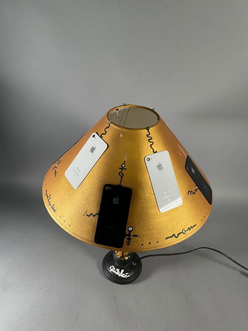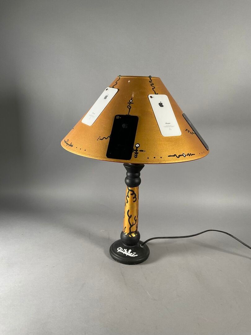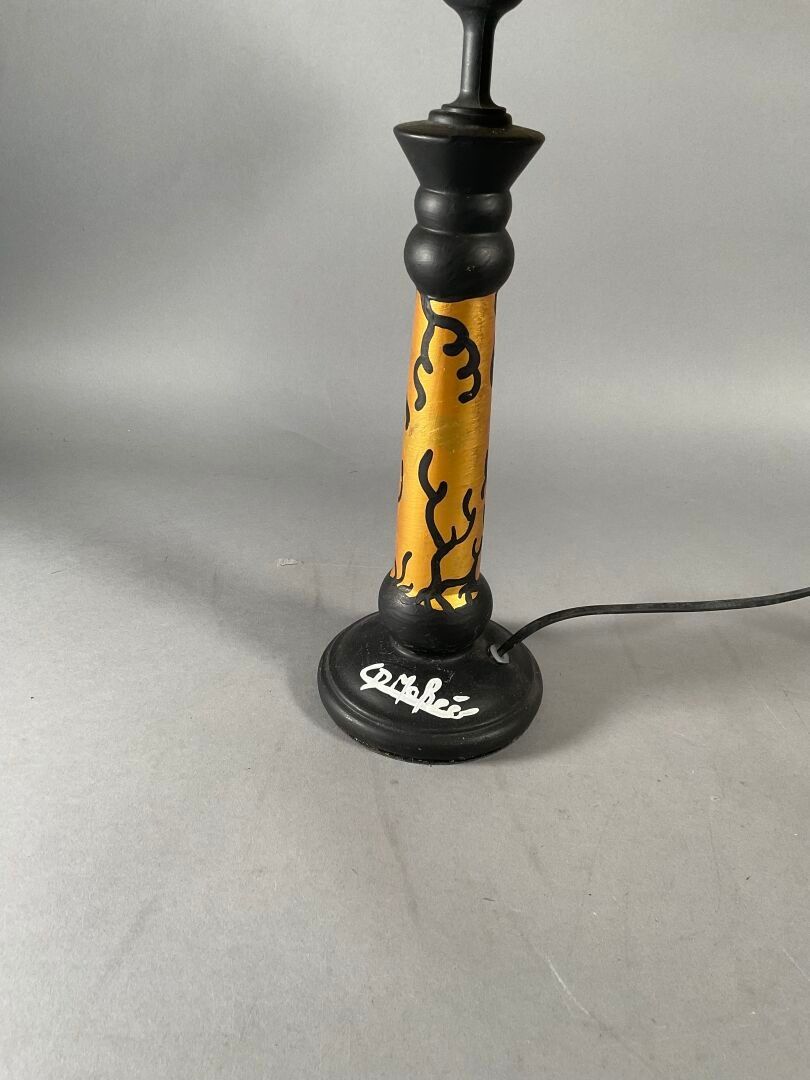 Table lamp, the black and gold painted ceramic base topped by a painted fabric shade with stylised painted shapes and Iphone back windows. Signed on the base.