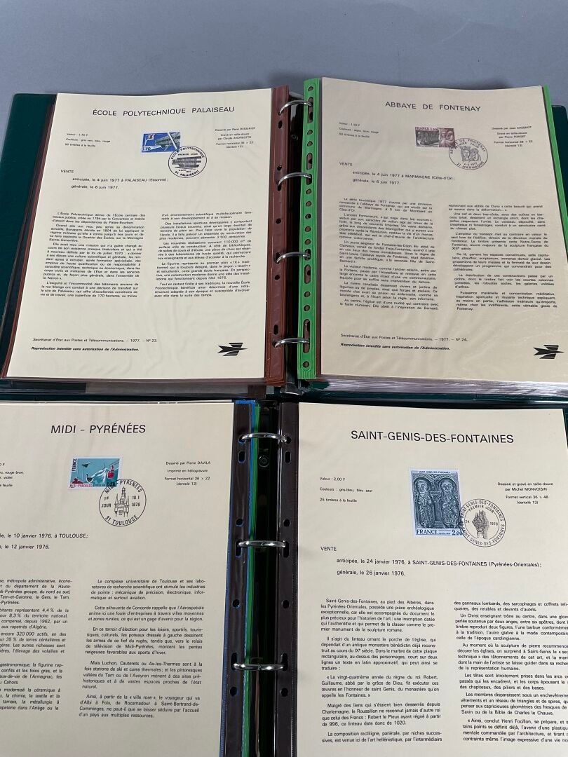 2 albums of First Day cancelled stamps on their detailed sheets from the Secrétariat d'Etat aux Postes et Télécommunications, comprising :