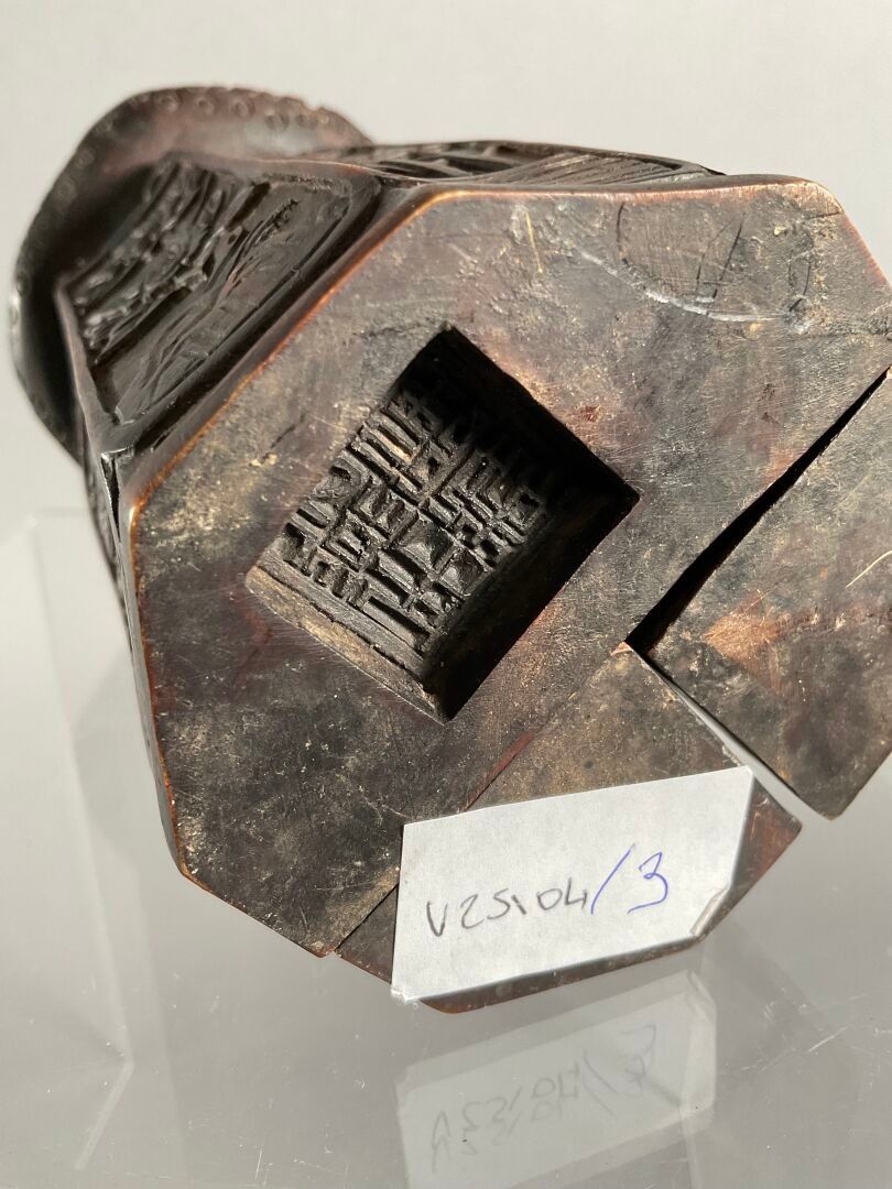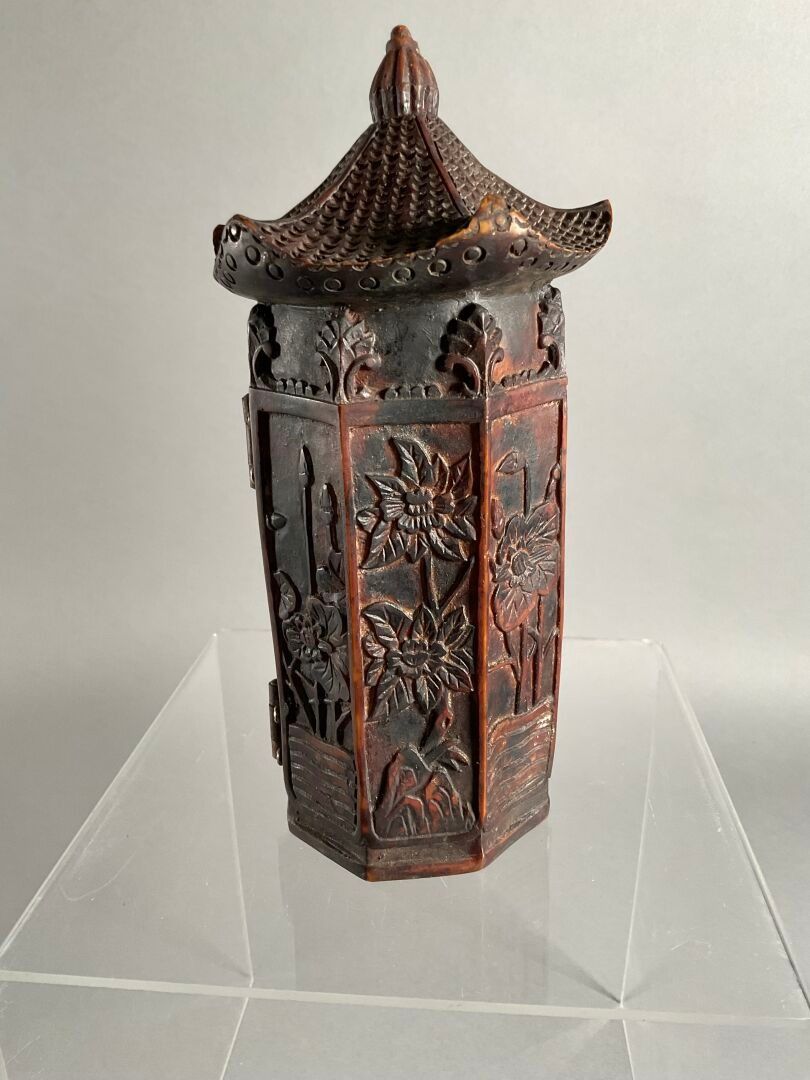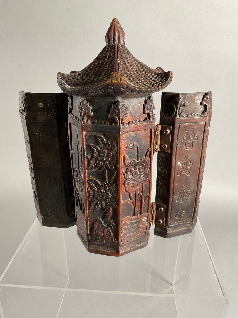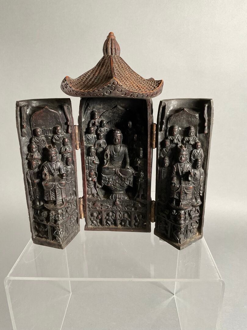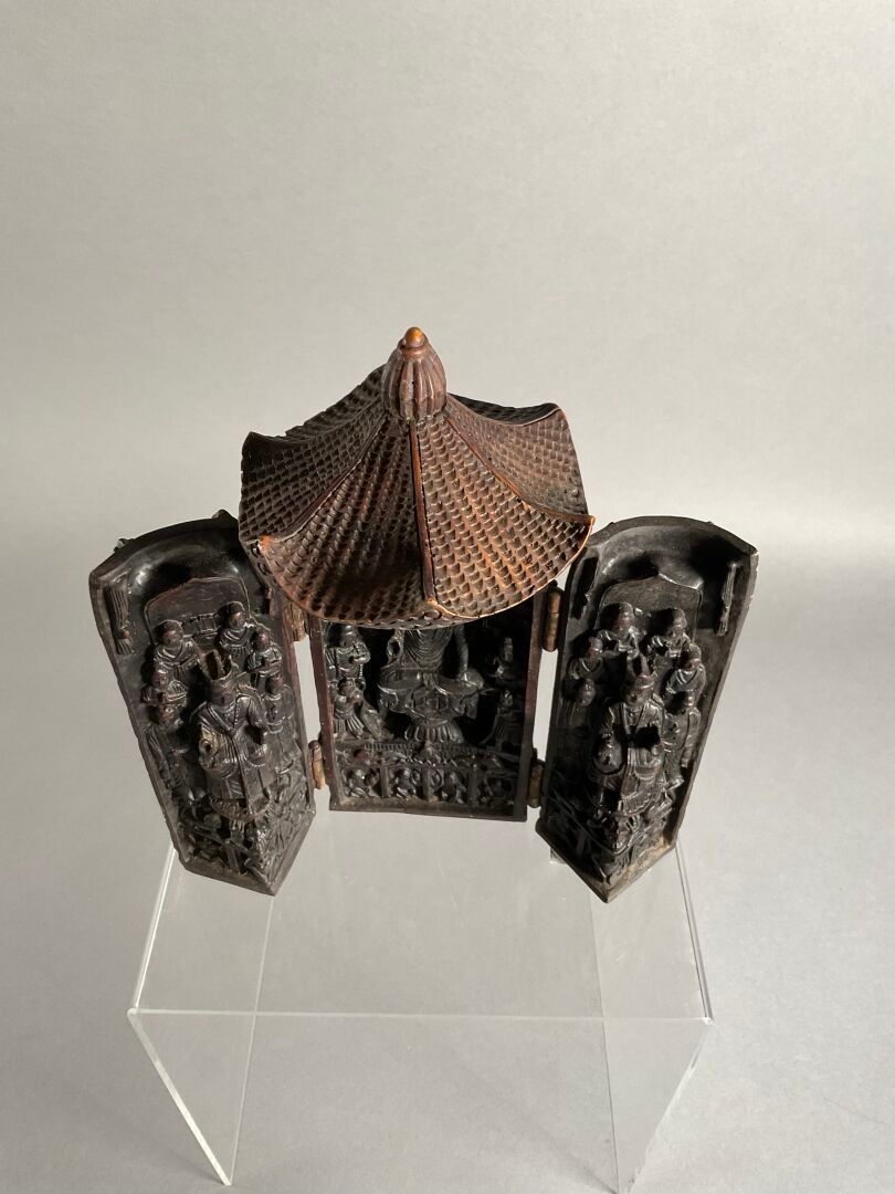 Octagonal Asian portable altar in carved blackened resin revealing an interior richly carved with a scene of monks and Buddha, topped with a roof.
