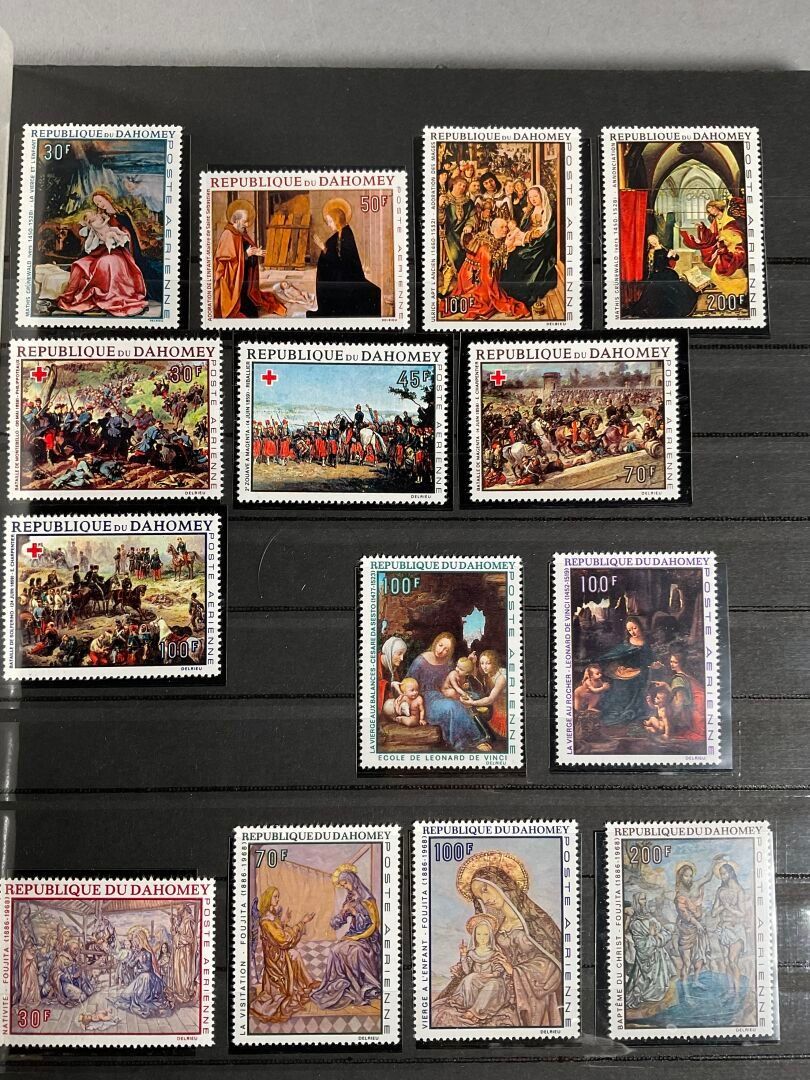 Set of 4 albums and one box of stamps, some mint, including France, Soviet Union, Israel, Poland, Hungary, Switzerland, Spain, Romania, United States, Algeria, West Africa, Congo, Republic of Dahomey, Republic of Upper Volta, Vietnam, Laos, Niger and others.