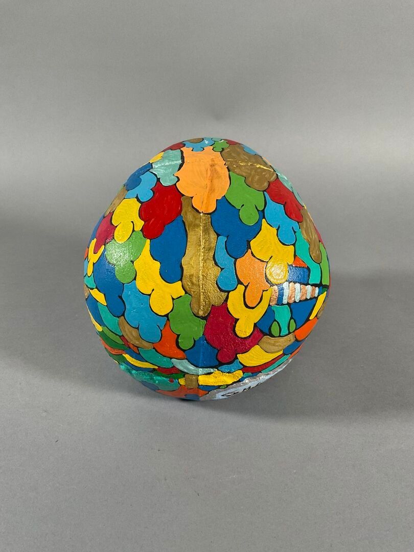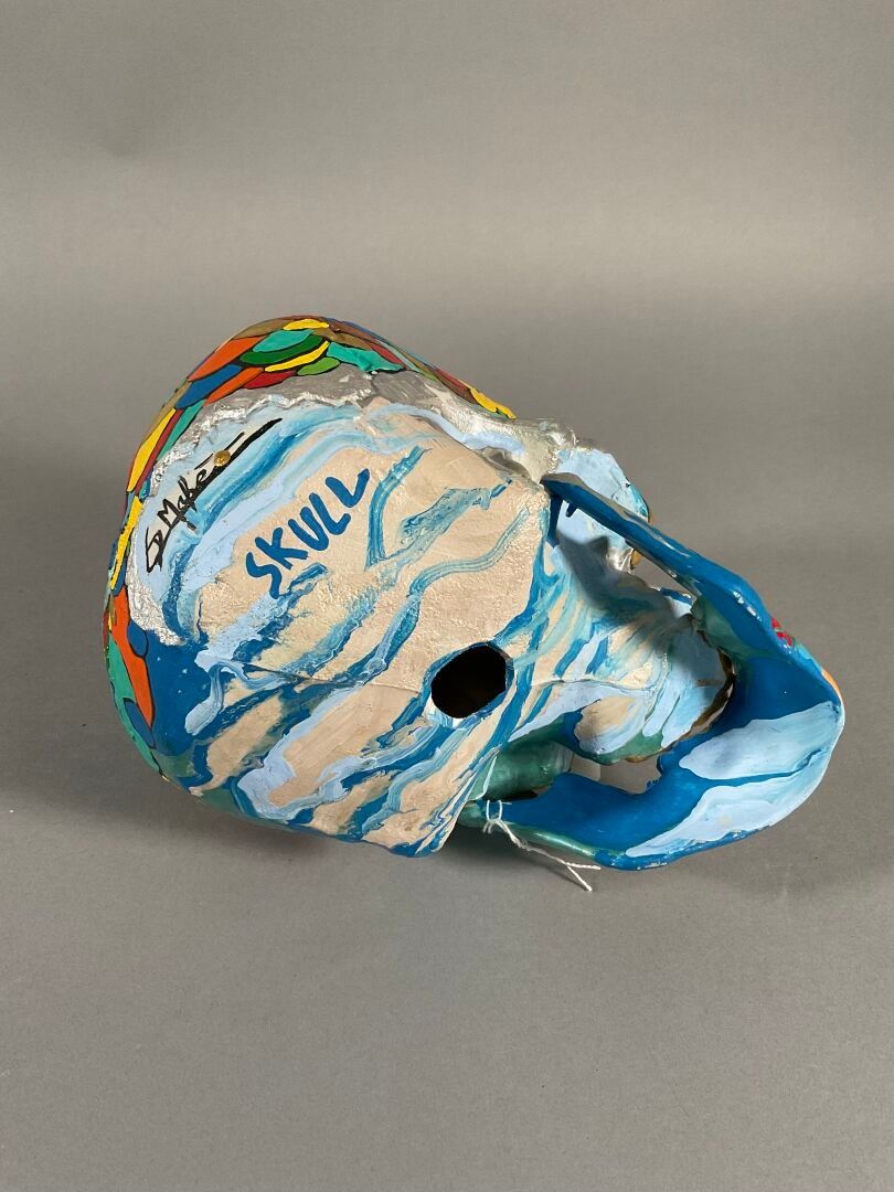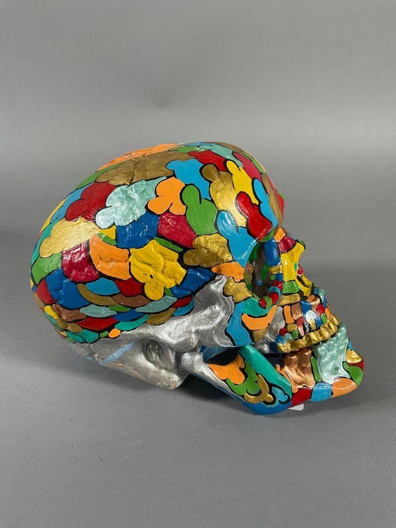 "Skull" in resin painted with polychrome acrylic, the eyes inlaid with buttons. Signed and titled on the back.