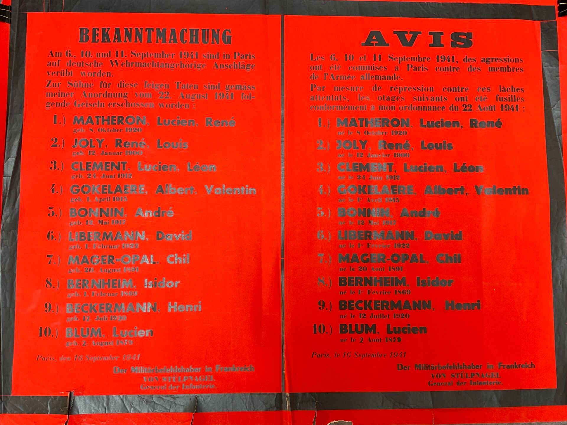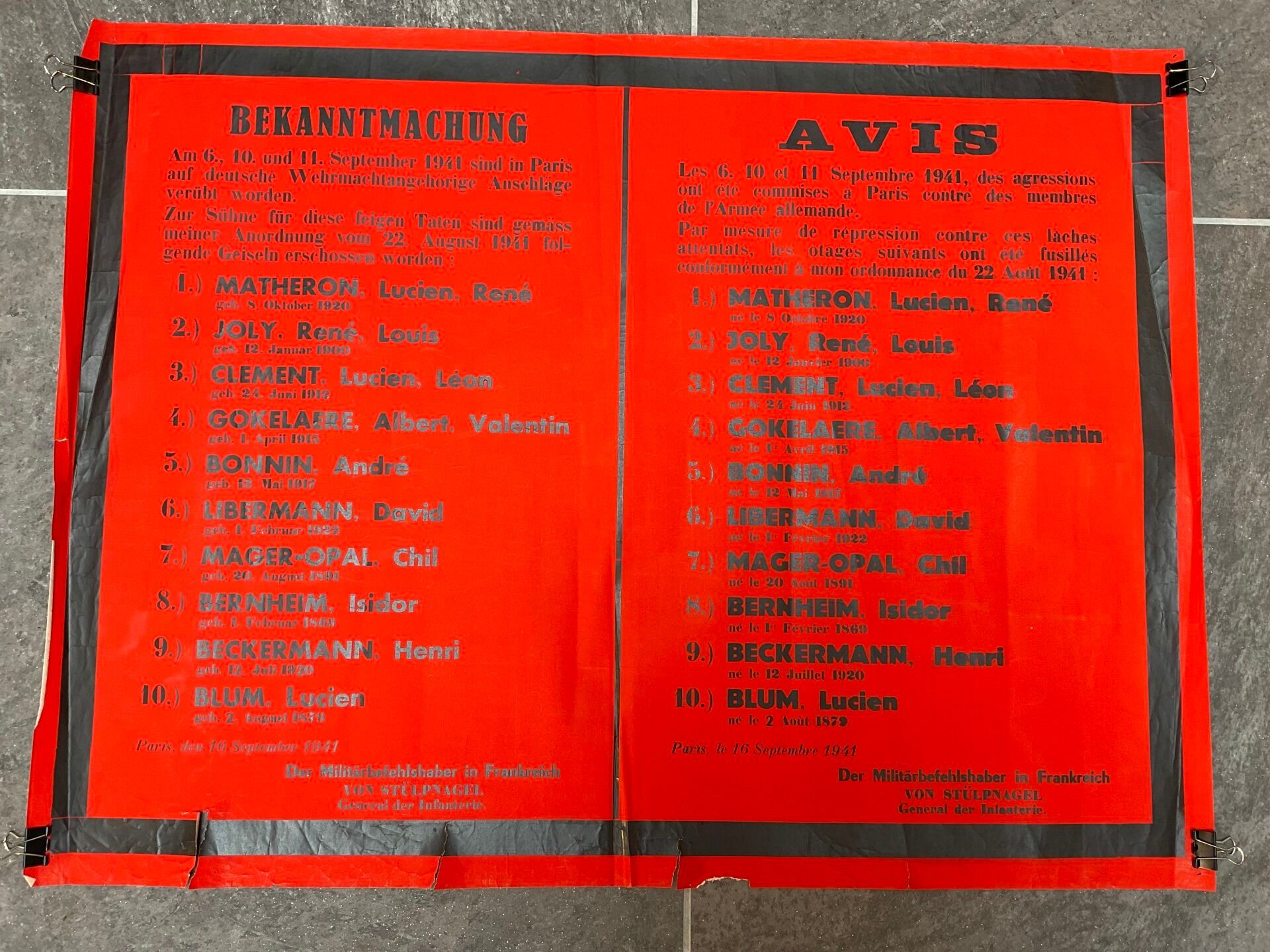 Placard from 1941 in German and French showing the list of hostages