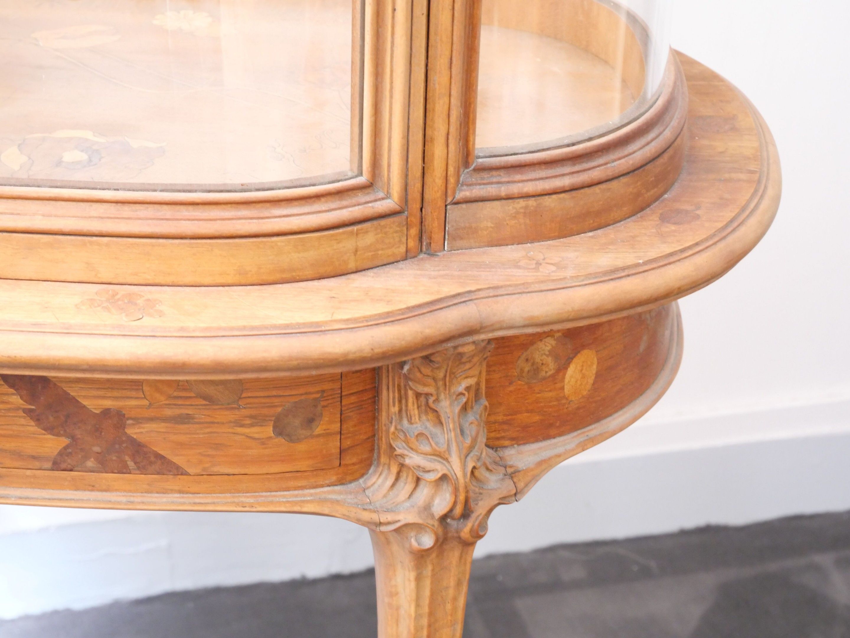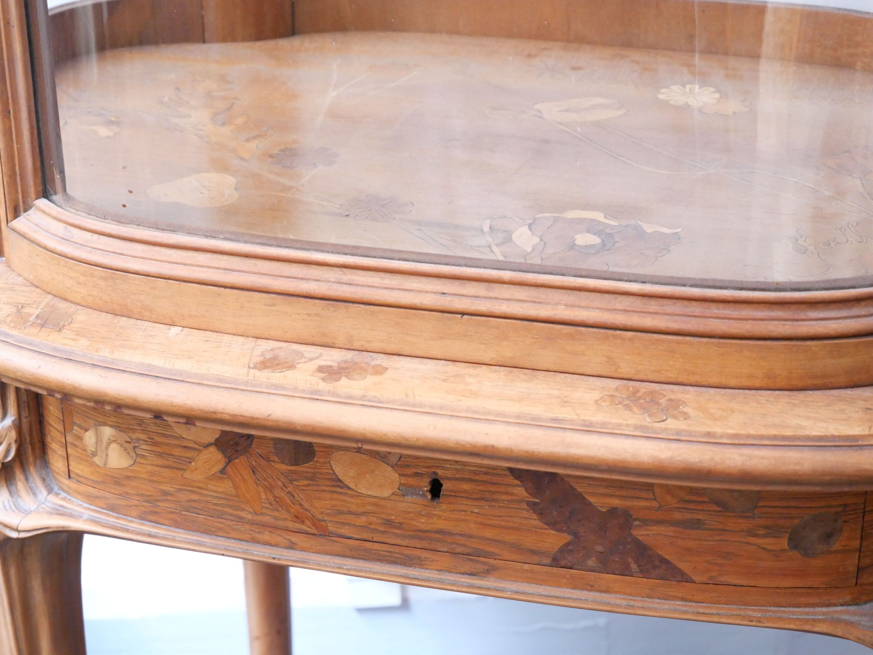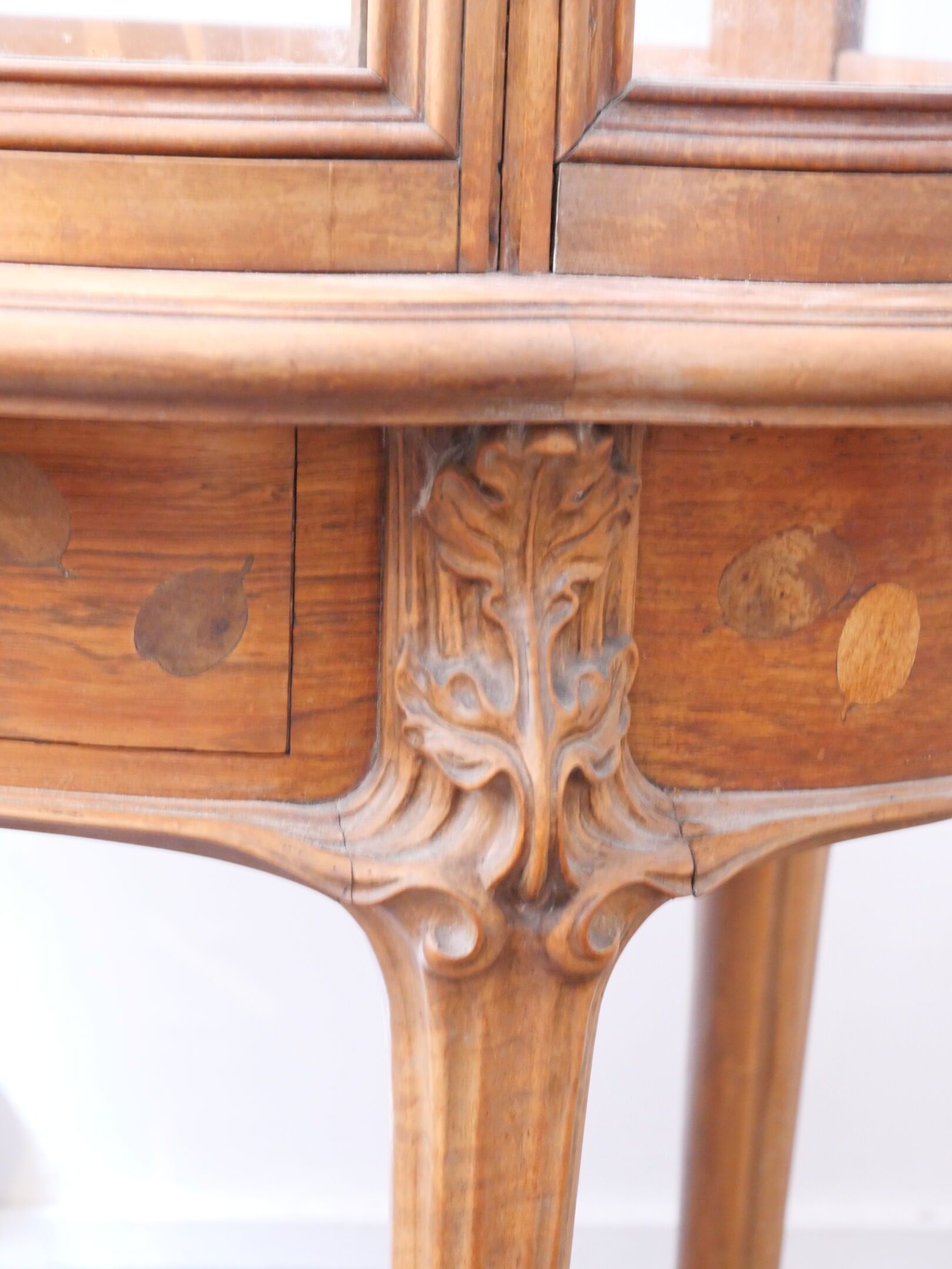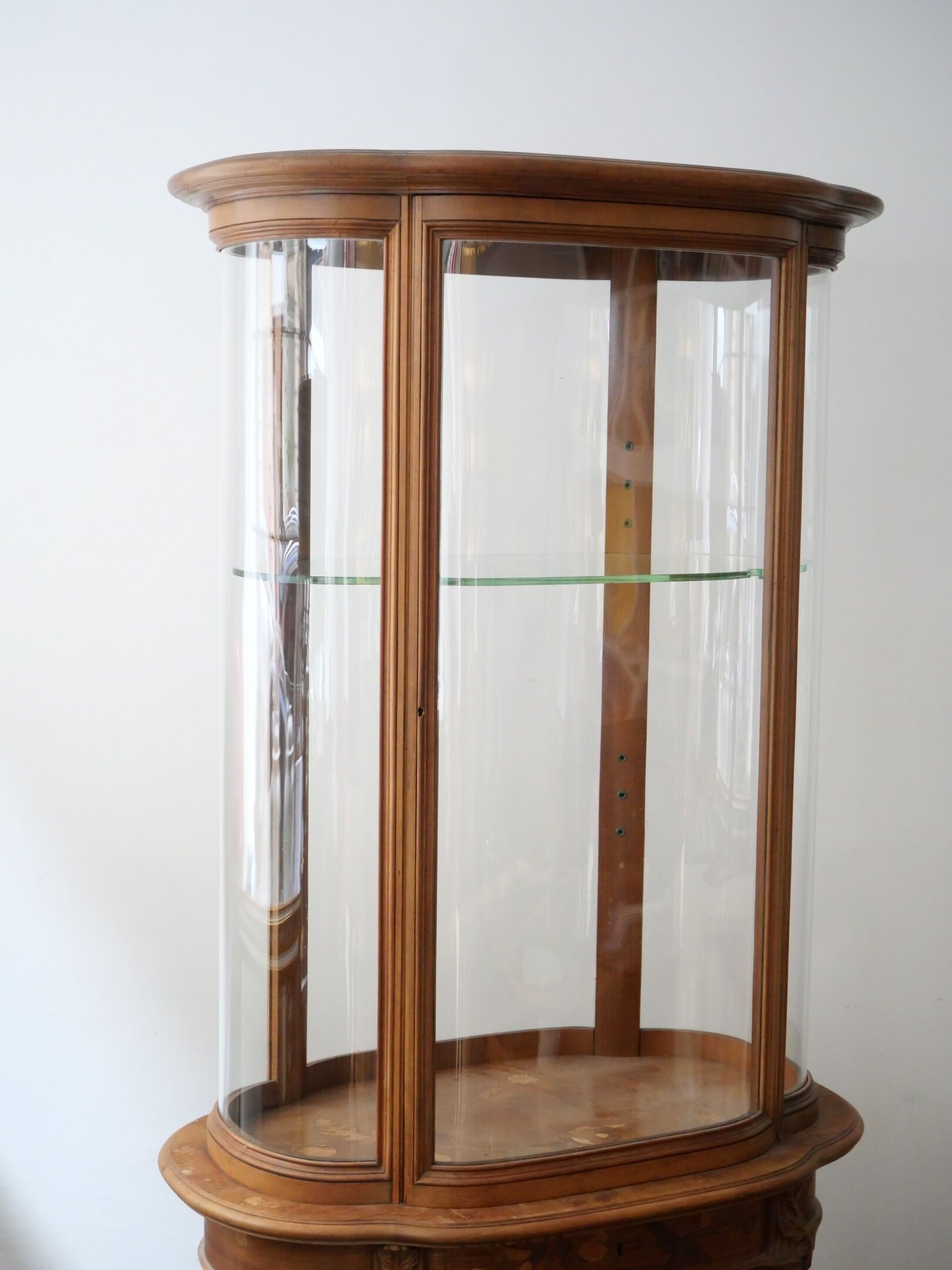 Carved and moulded mahogany display cabinet with a quadrangular poly-lobed body and inlaid wood of different species. The top is glazed and opens onto an interior with a glass shelf with adjustable height and a curved drawer at the waist. The lower shelf of the display cabinet is decorated with poppy flower marquetry and the poly-lobed belt is decorated with papal coins and birds. Recessed corner base with curved legs carved at the top with leaves and entirely grooved with a lower cross brace that is curved and grooved (small cracks, accidents, insolate wood, one shelf missing).