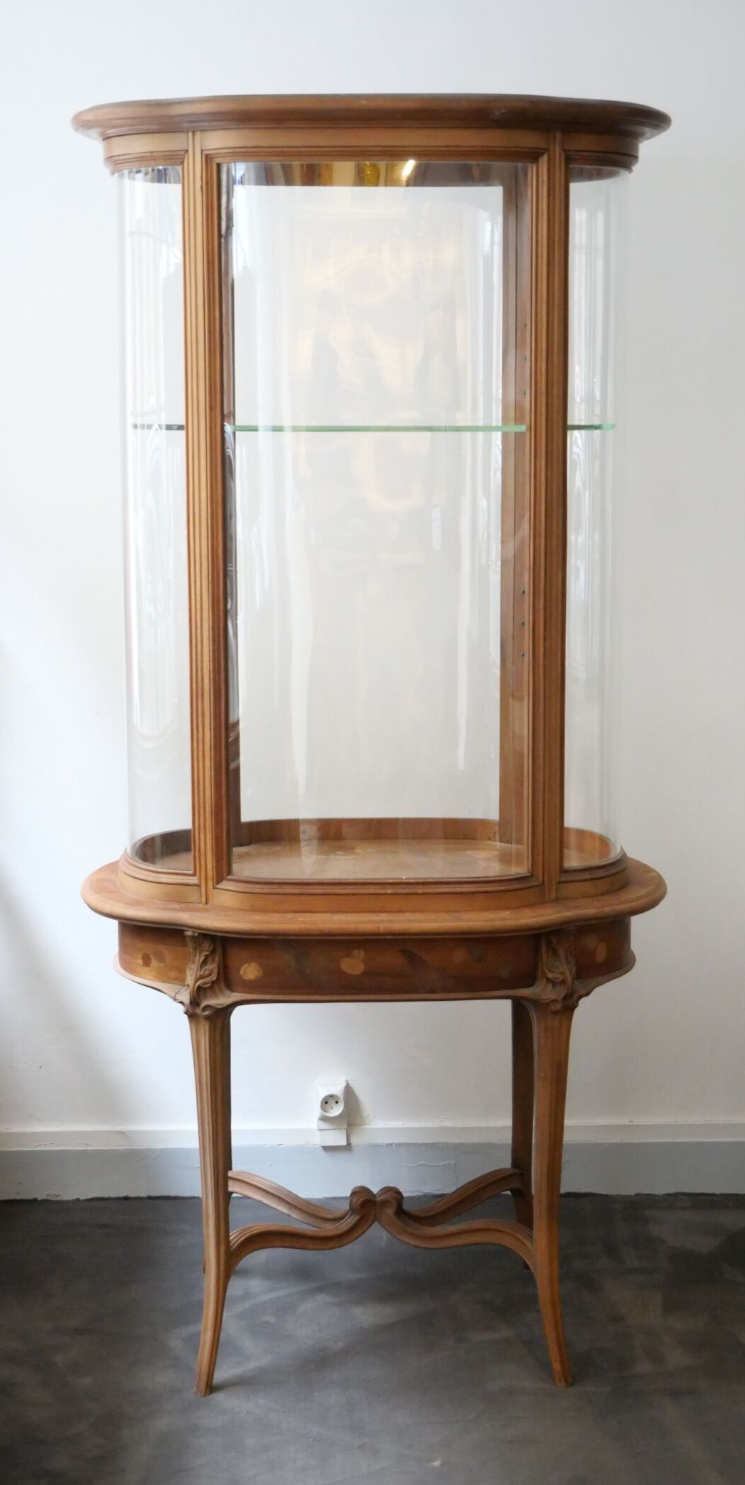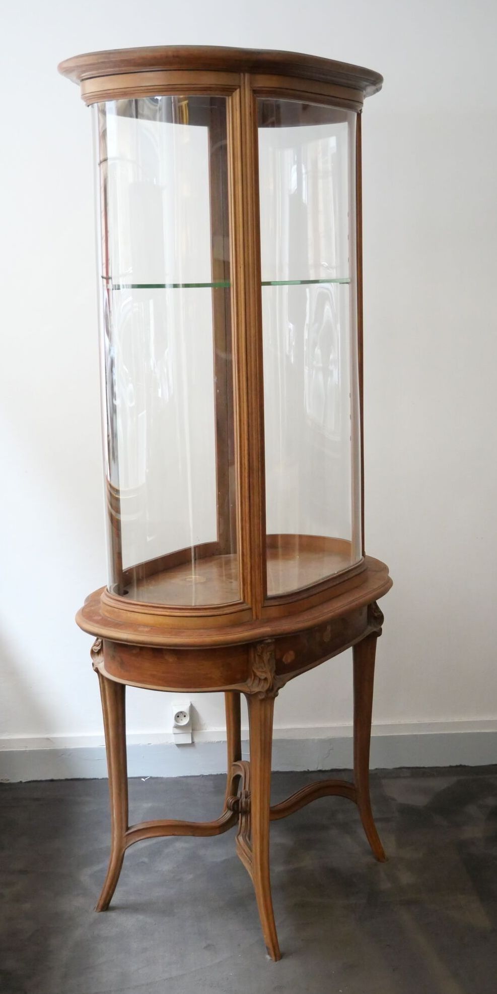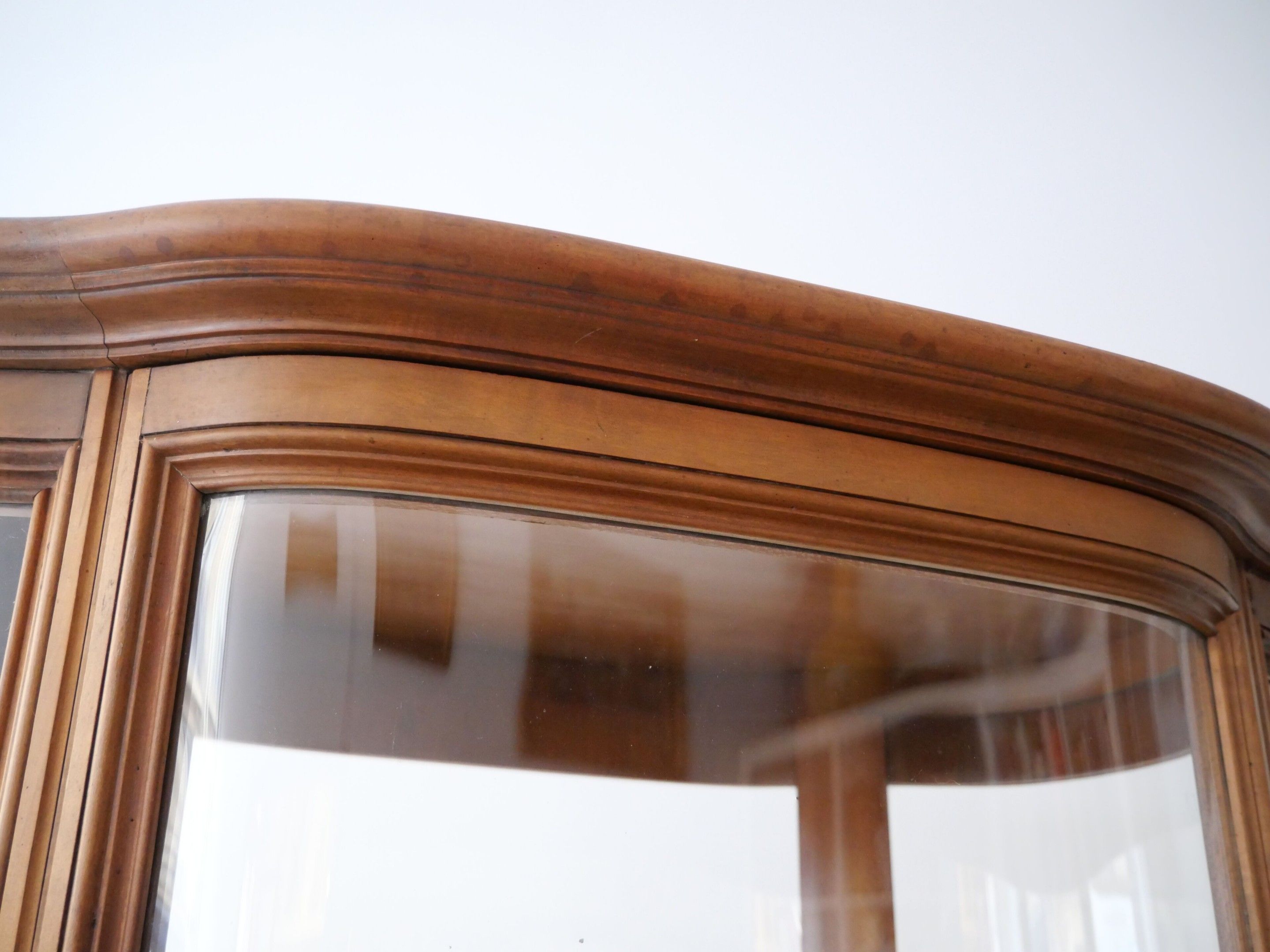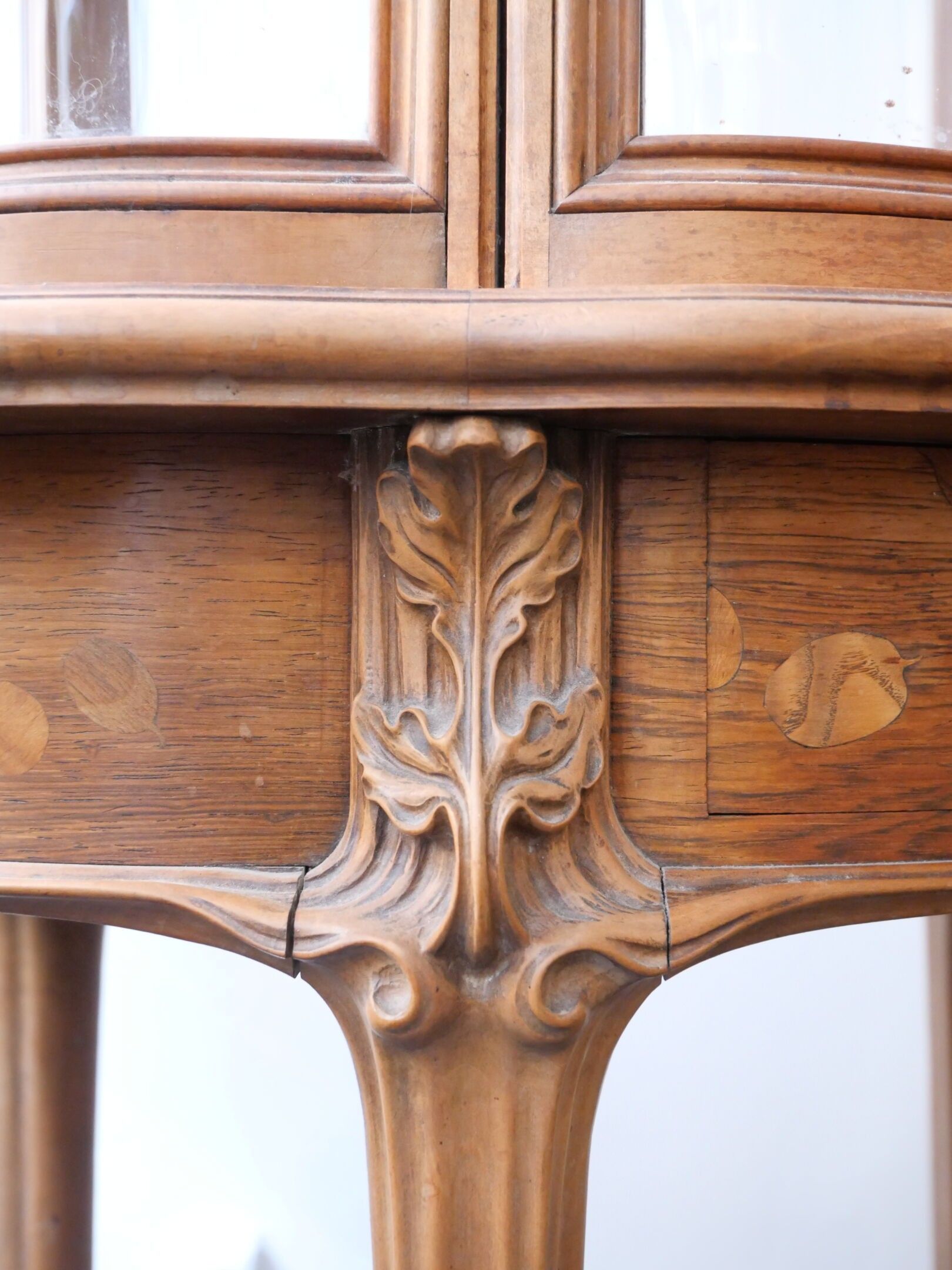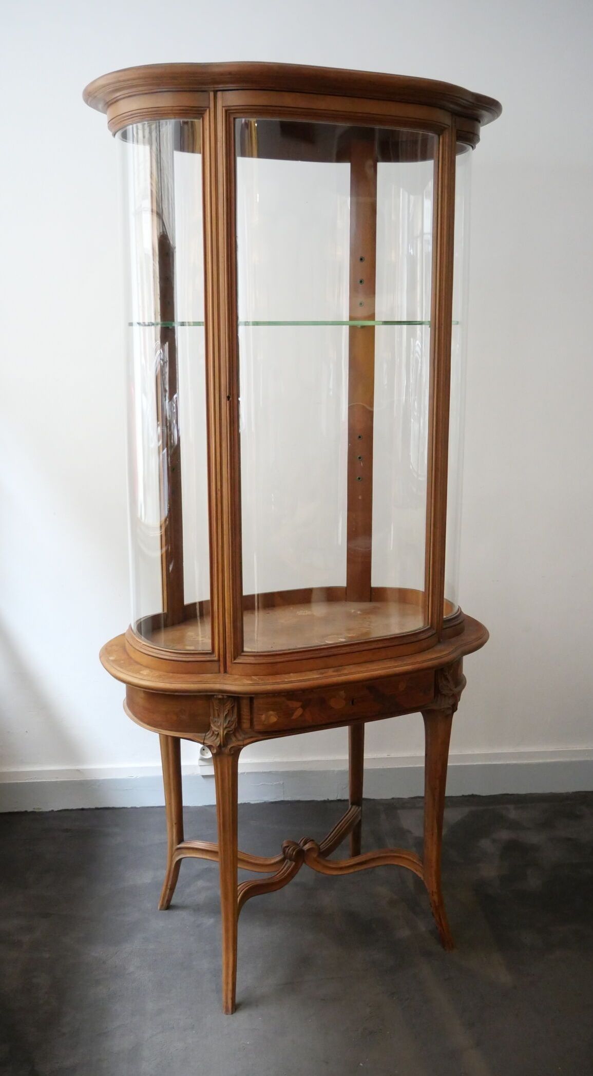 Carved and moulded mahogany display cabinet with a quadrangular poly-lobed body and inlaid wood of different species. The top is glazed and opens onto an interior with a glass shelf with adjustable height and a curved drawer at the waist. The lower shelf of the display cabinet is decorated with poppy flower marquetry and the poly-lobed belt is decorated with papal coins and birds. Recessed corner base with curved legs carved at the top with leaves and entirely grooved with a lower cross brace that is curved and grooved (small cracks, accidents, insolate wood, one shelf missing).