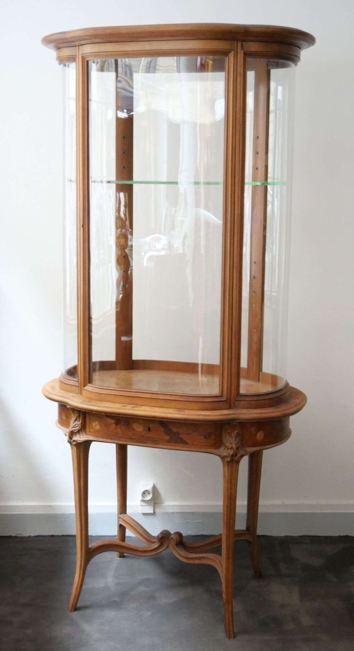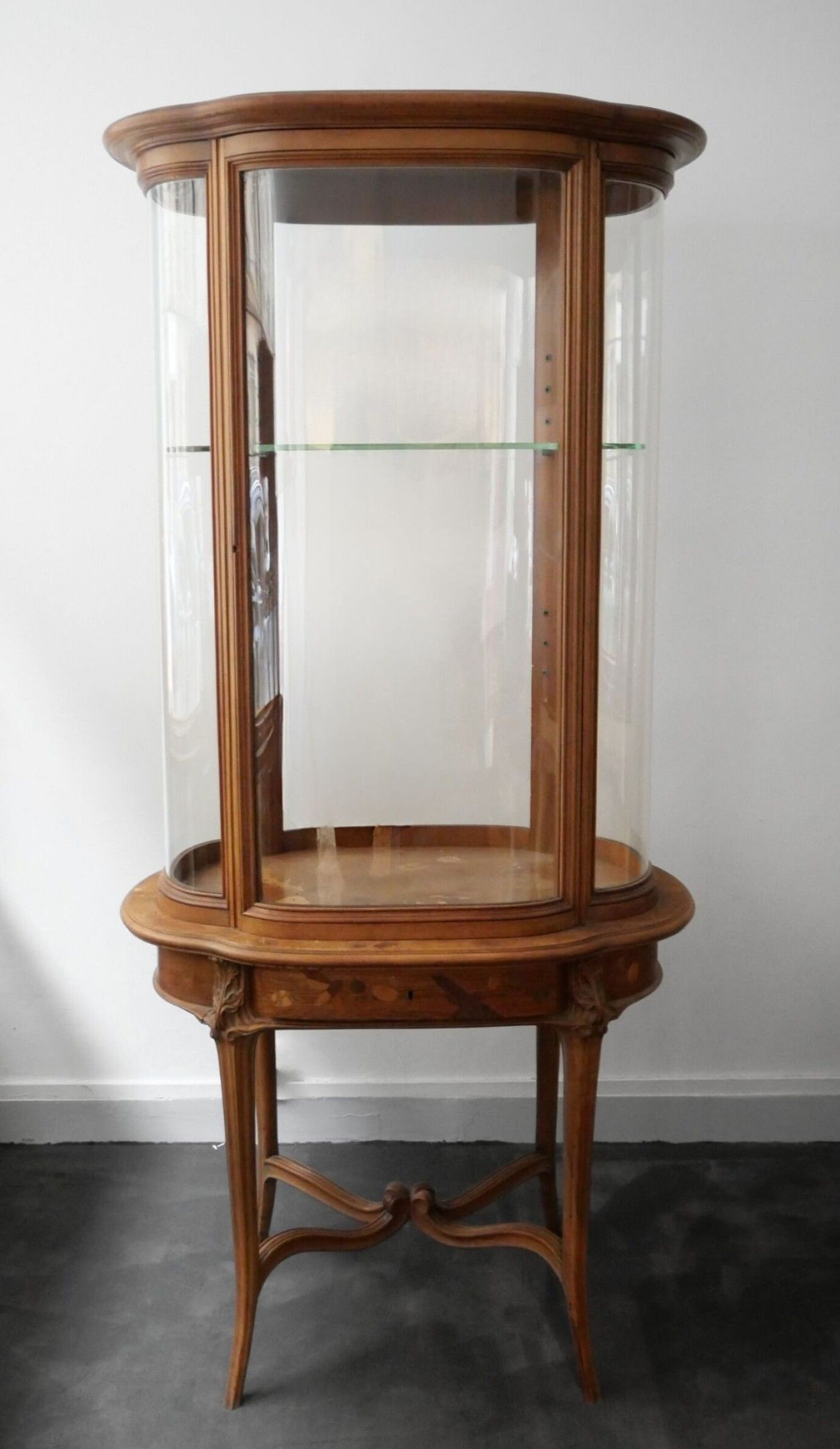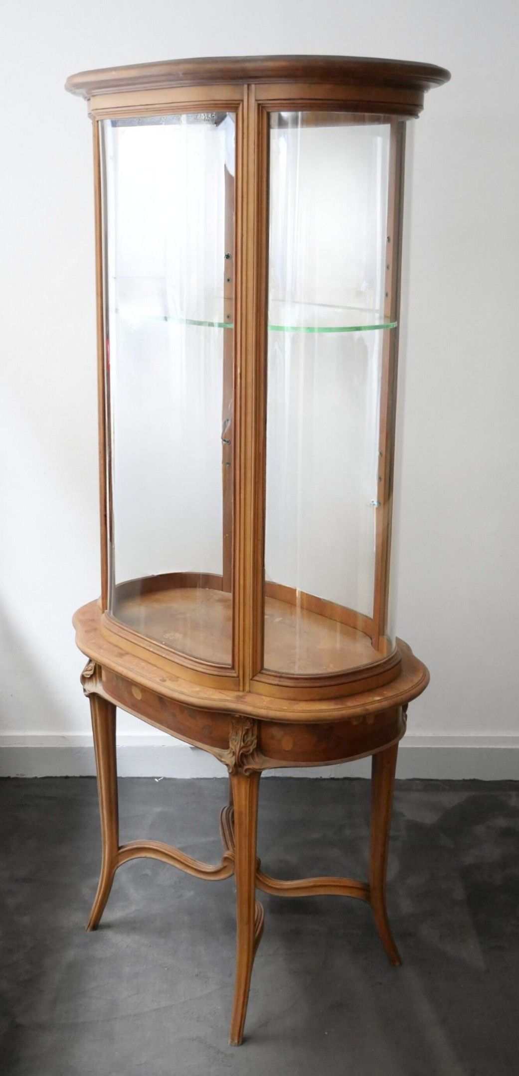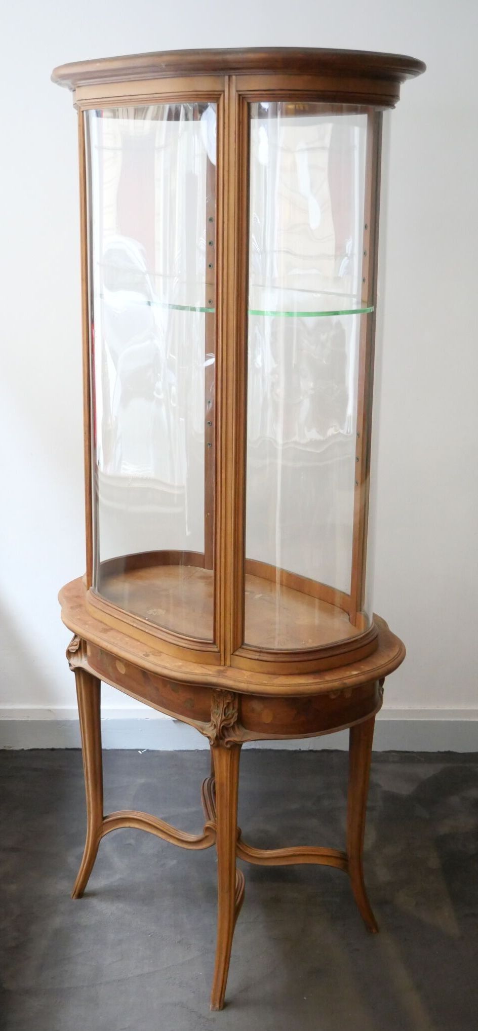 Carved and moulded mahogany display cabinet with a quadrangular poly-lobed body and inlaid wood of different species. The top is glazed and opens onto an interior with a glass shelf with adjustable height and a curved drawer at the waist. The lower shelf of the display cabinet is decorated with poppy flower marquetry and the poly-lobed belt is decorated with papal coins and birds. Recessed corner base with curved legs carved at the top with leaves and entirely grooved with a lower cross brace that is curved and grooved (small cracks, accidents, insolate wood, one shelf missing).