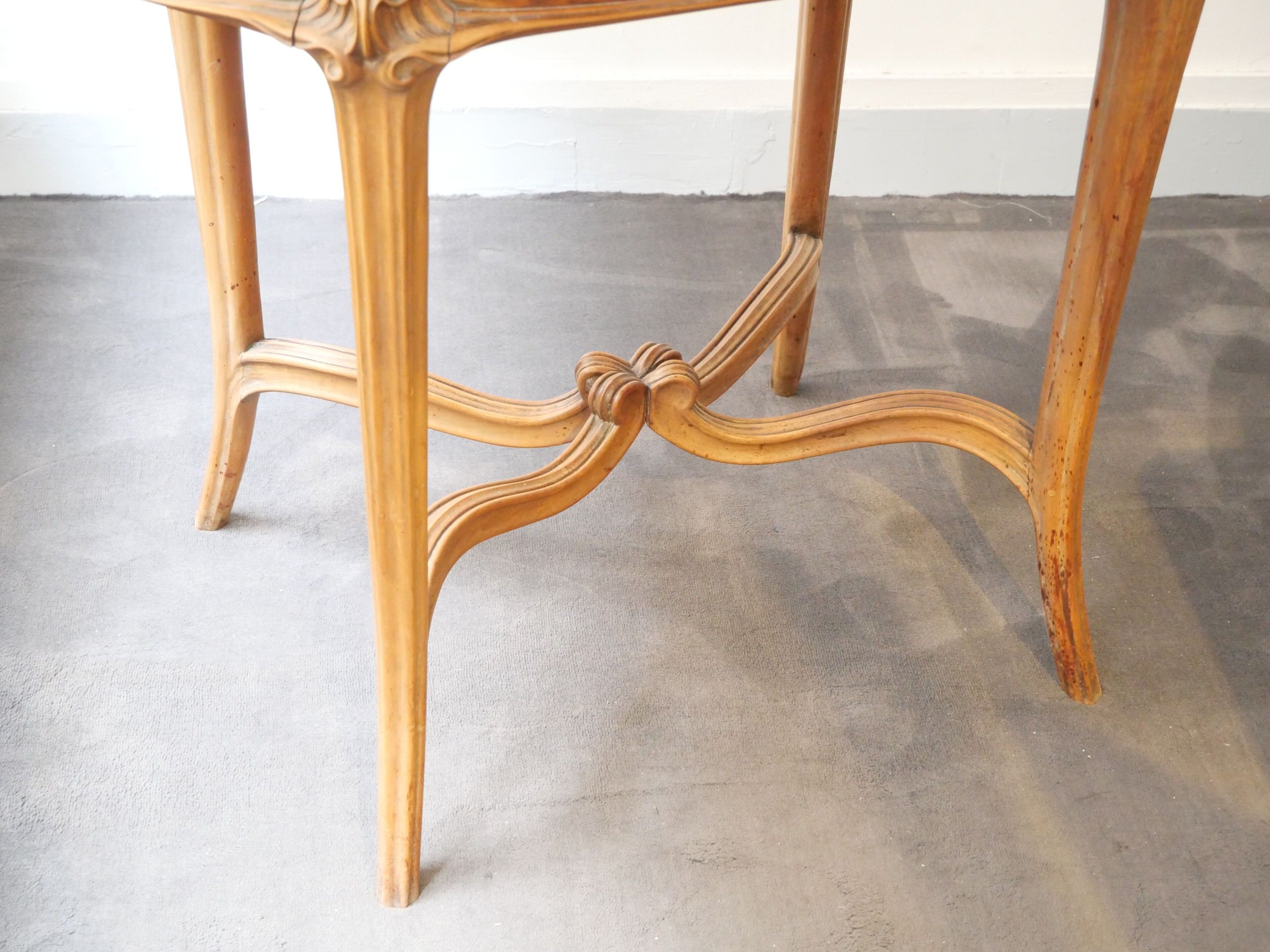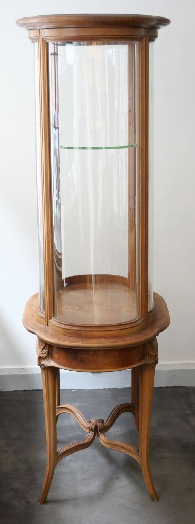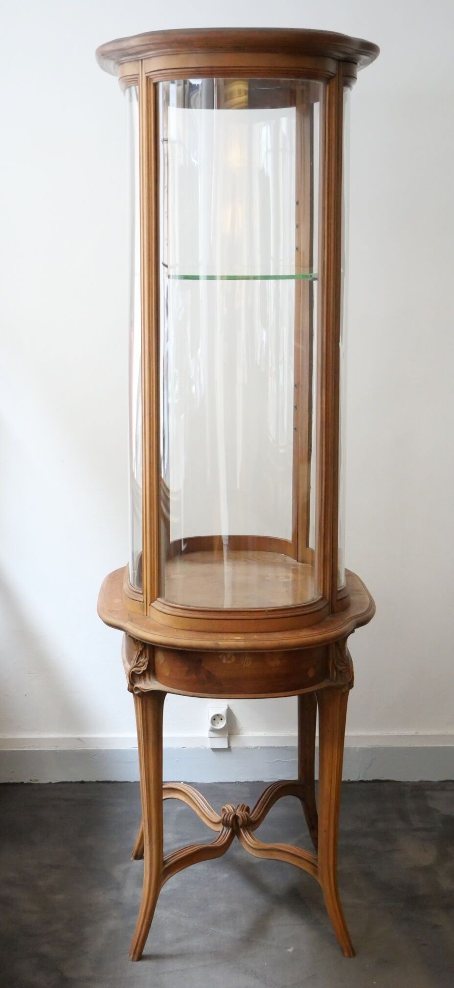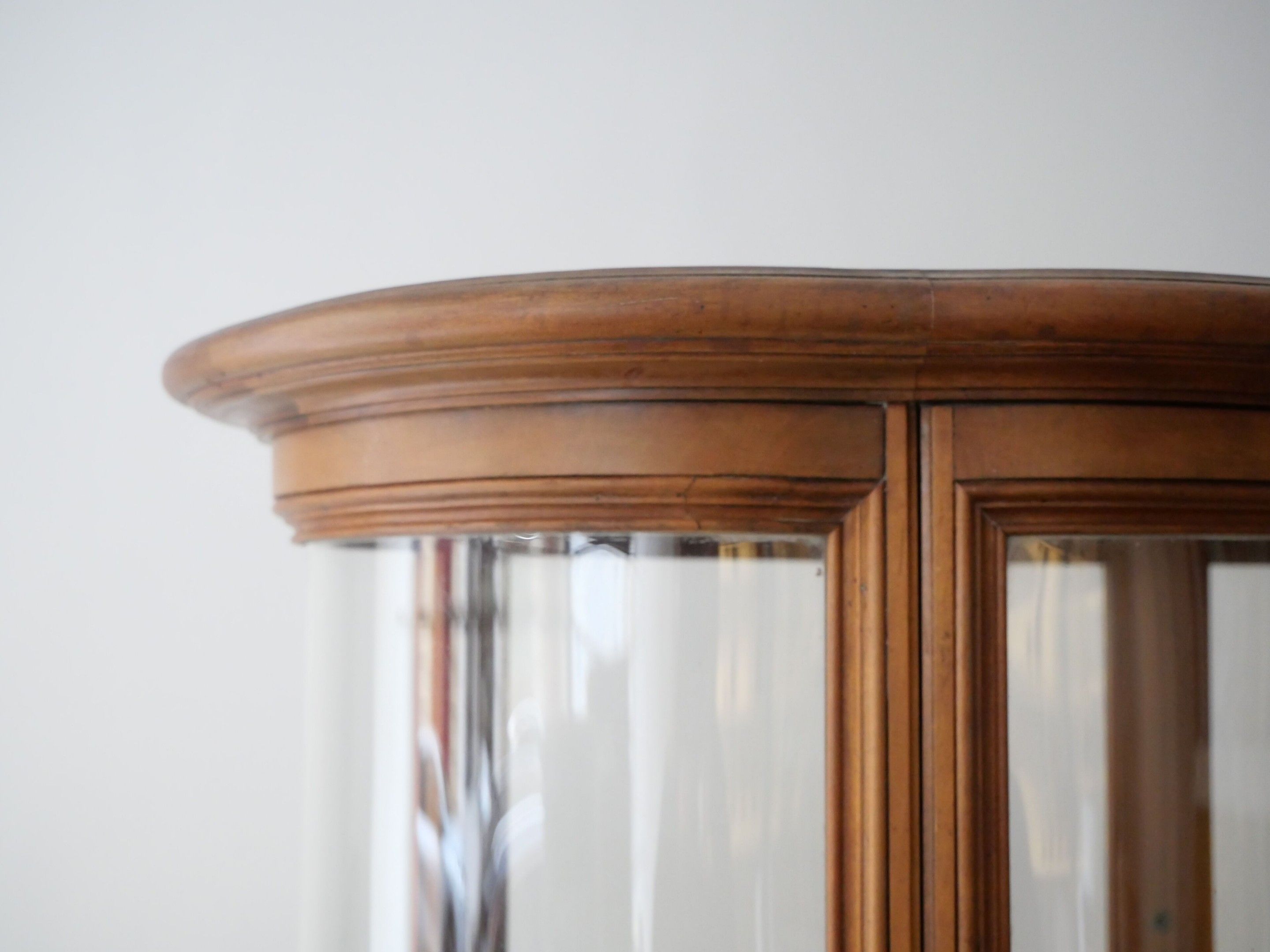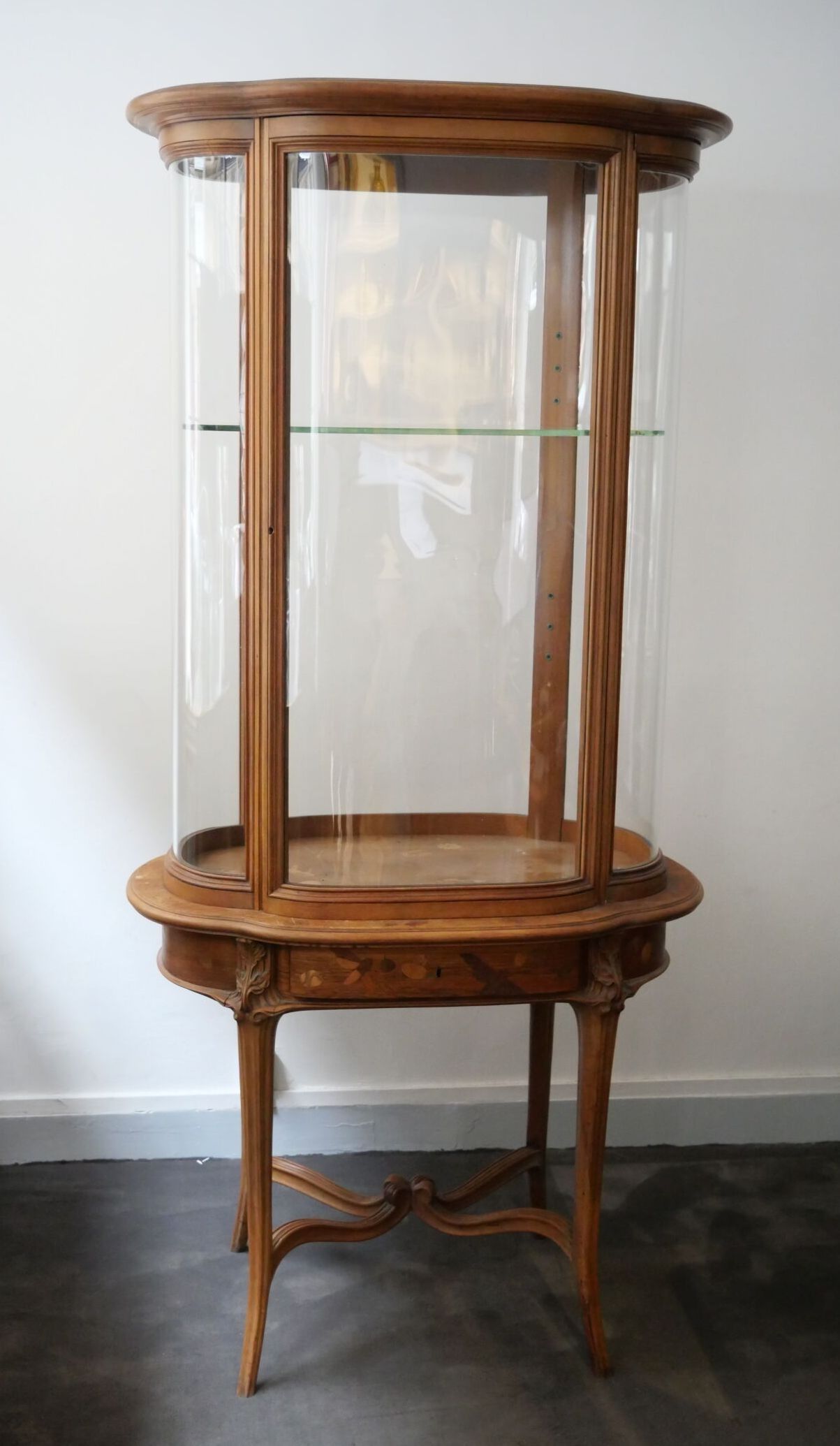 Carved and moulded mahogany display cabinet with a quadrangular poly-lobed body and inlaid wood of different species. The top is glazed and opens onto an interior with a glass shelf with adjustable height and a curved drawer at the waist. The lower shelf of the display cabinet is decorated with poppy flower marquetry and the poly-lobed belt is decorated with papal coins and birds. Recessed corner base with curved legs carved at the top with leaves and entirely grooved with a lower cross brace that is curved and grooved (small cracks, accidents, insolate wood, one shelf missing).