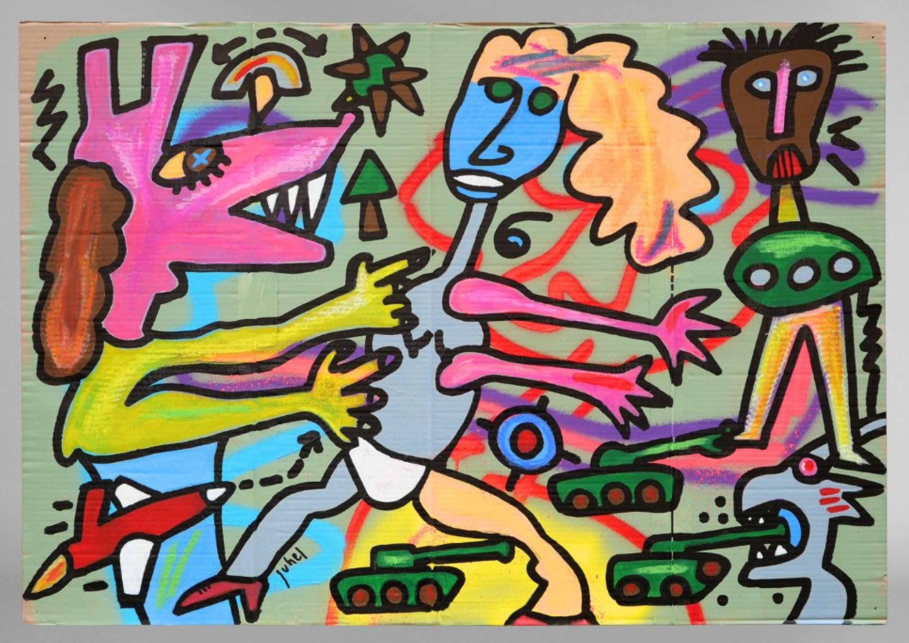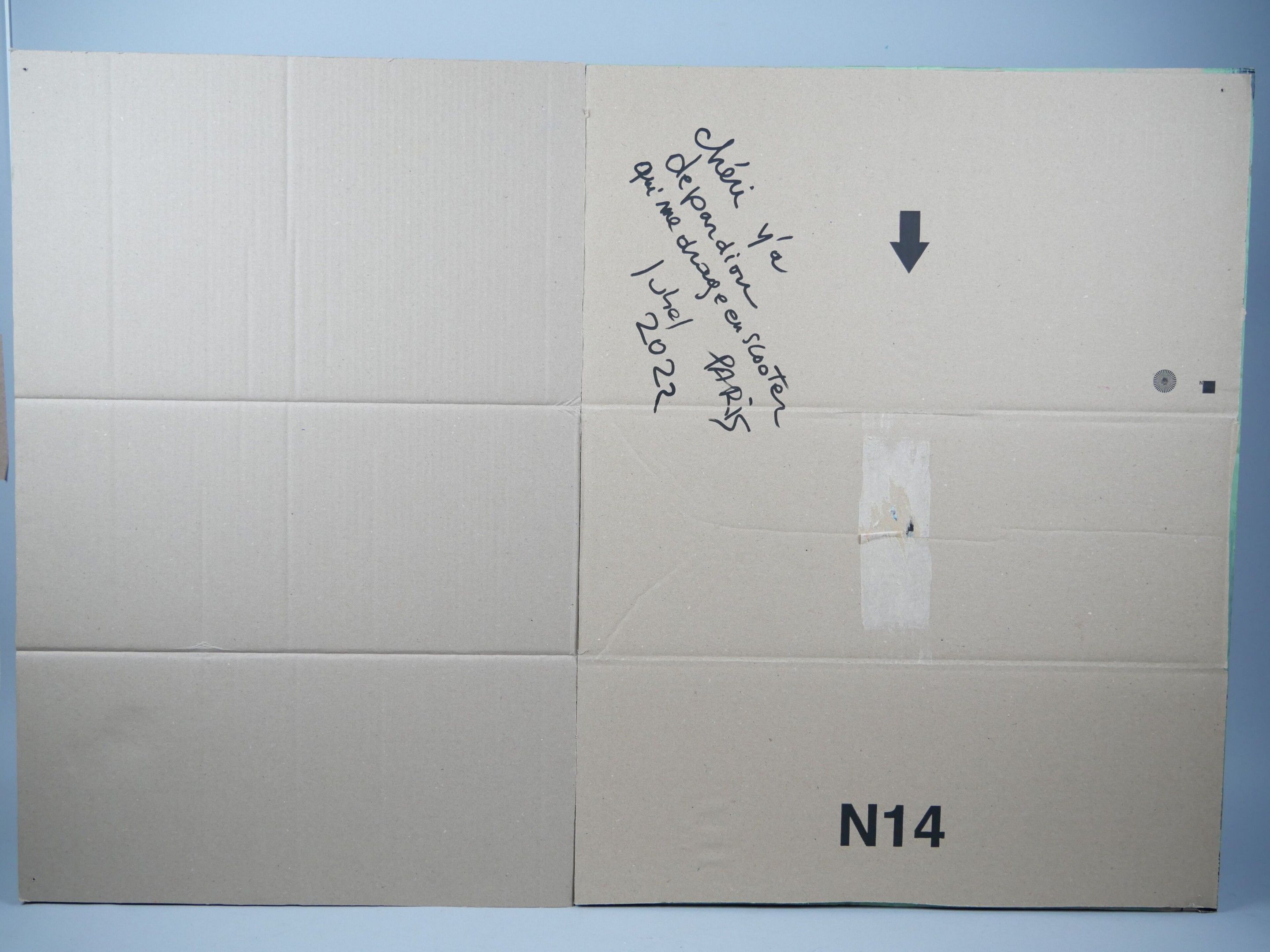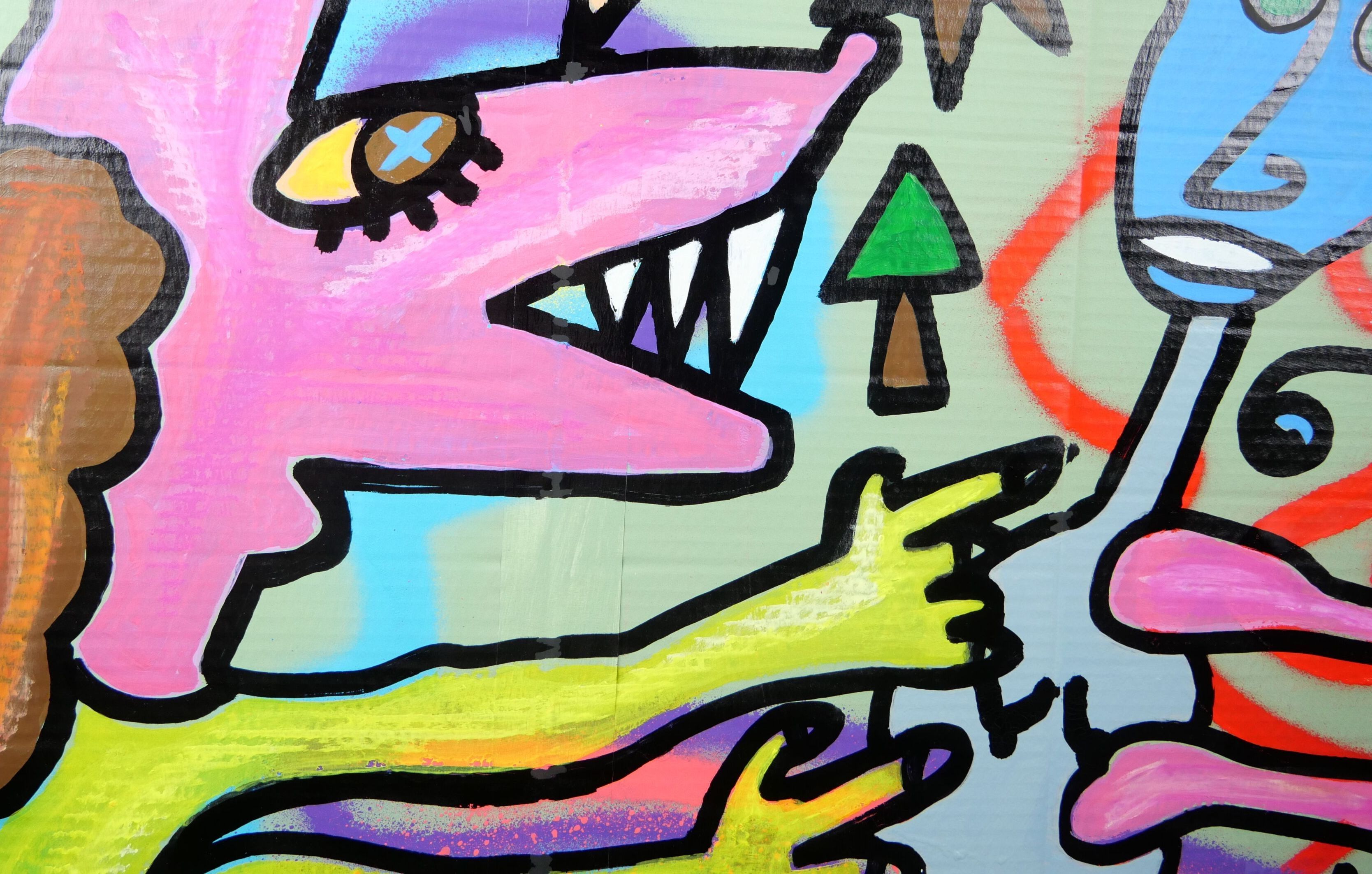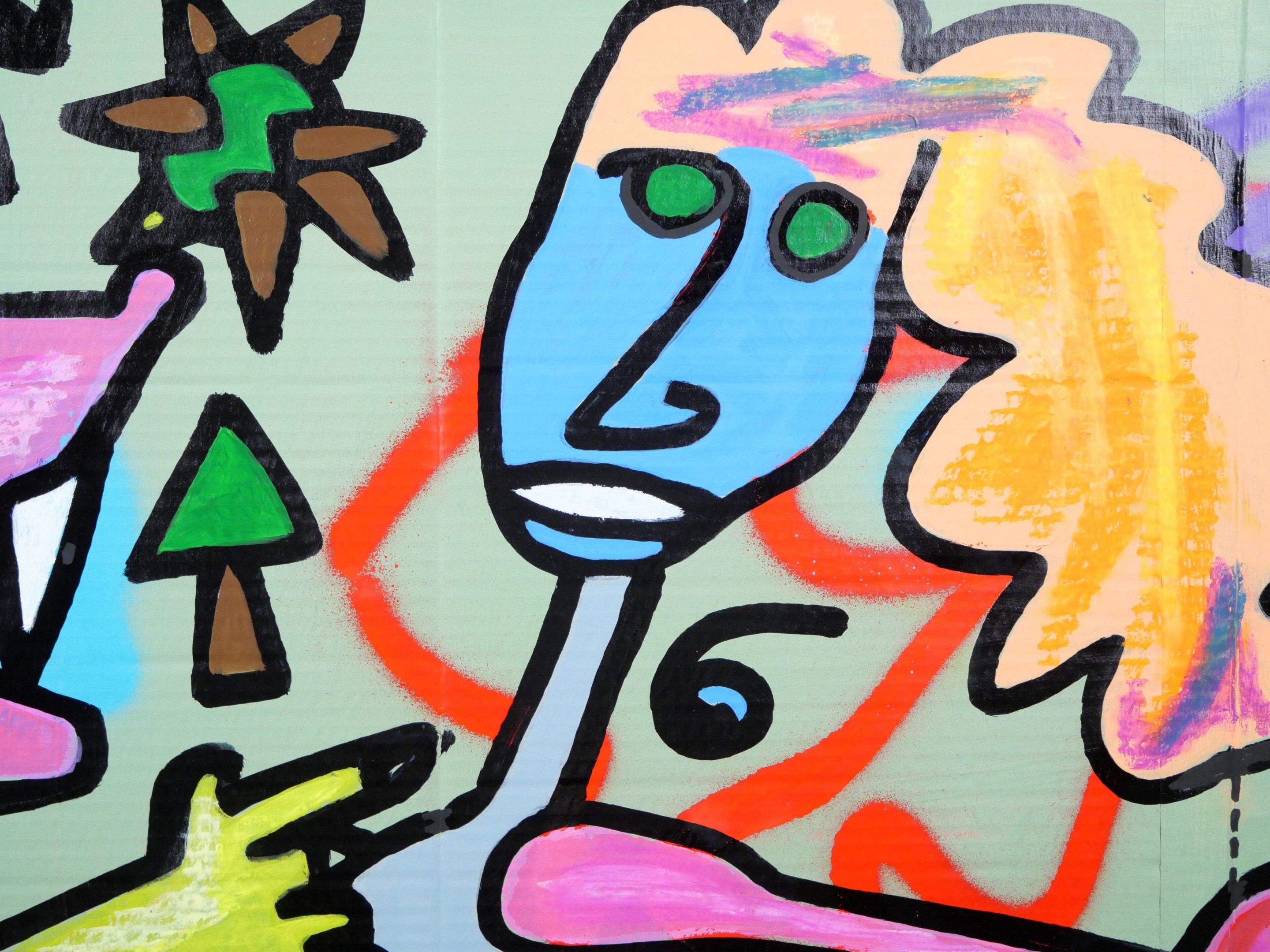 Spray paint, acrylic, pastel and posca on cardboard, signed lower left, countersigned, titled and dated 2022 on the back.