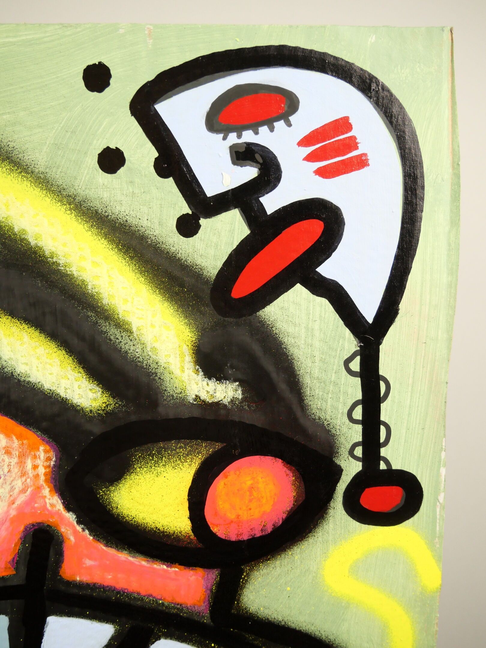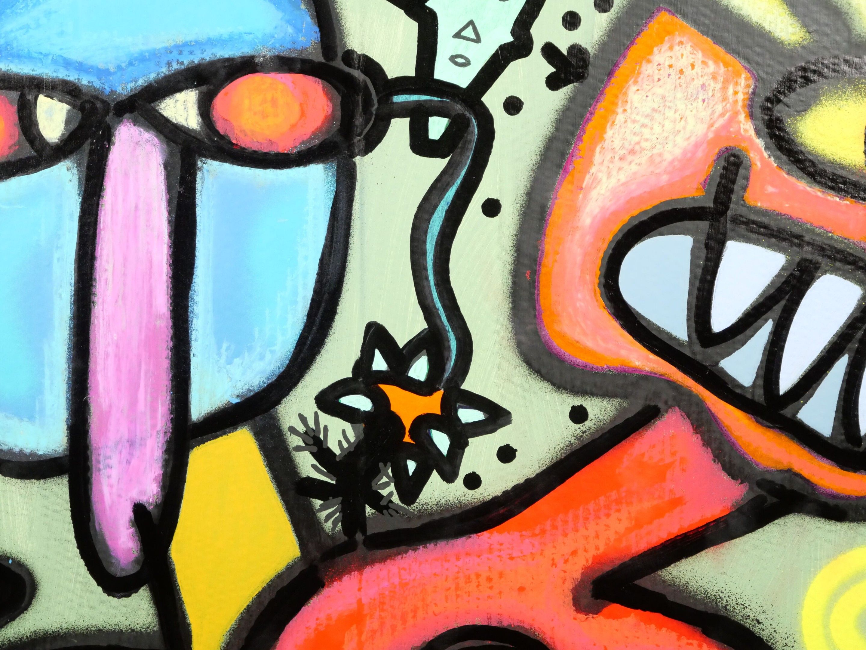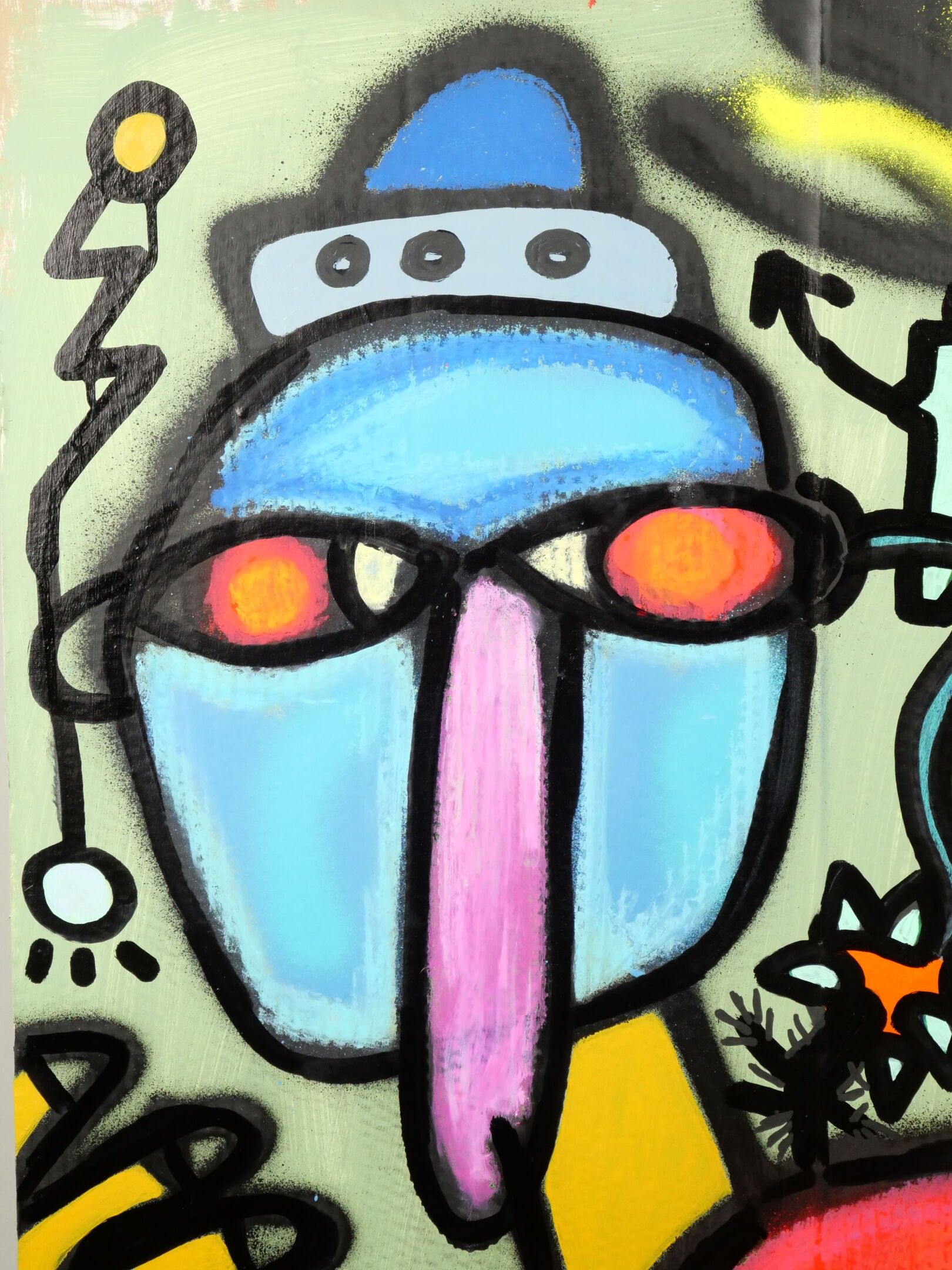 Aerosol, acrylic, pastel and posca on board, signed lower left, countersigned, titled and dated 2023 on the back.