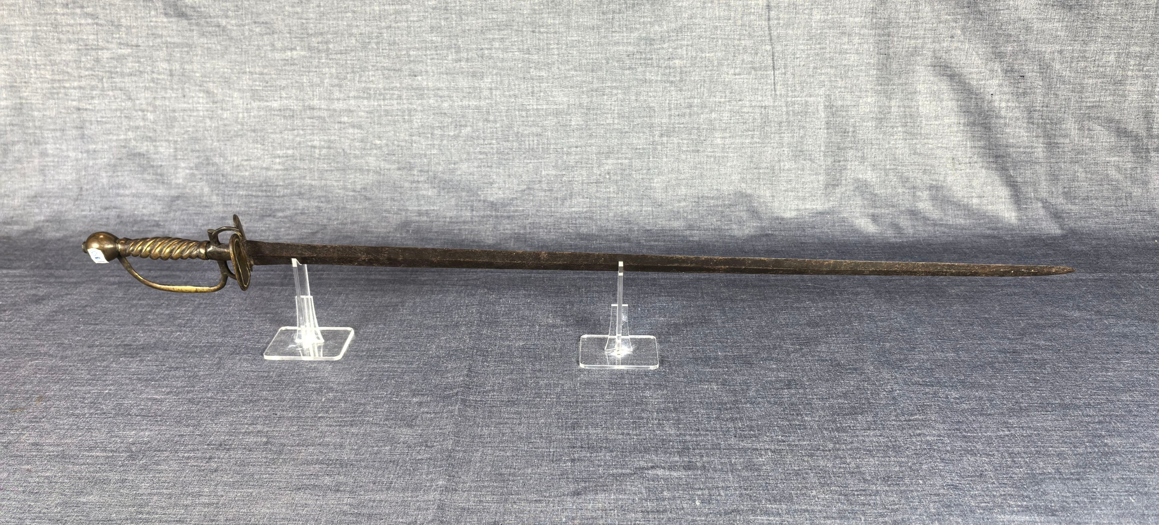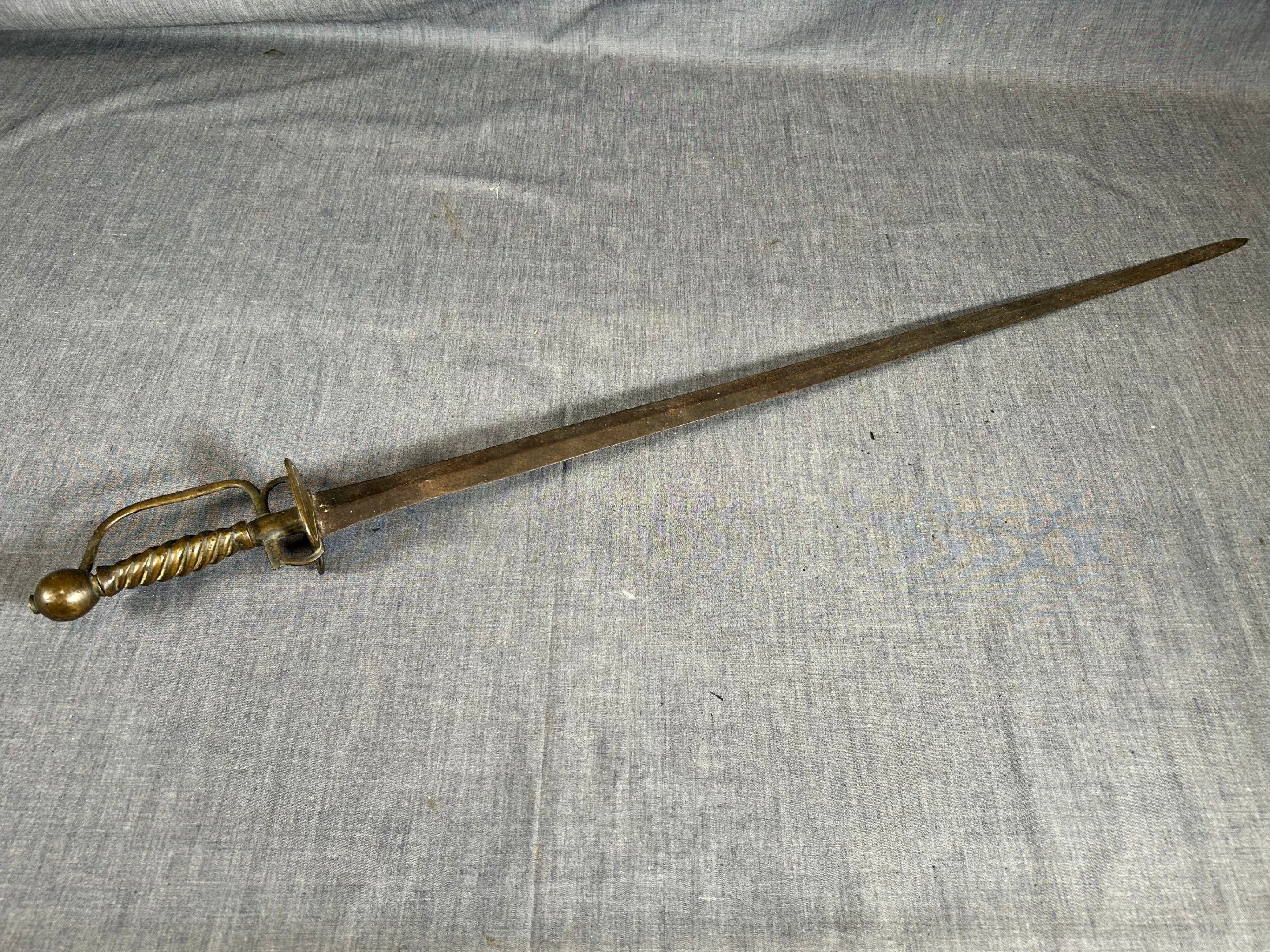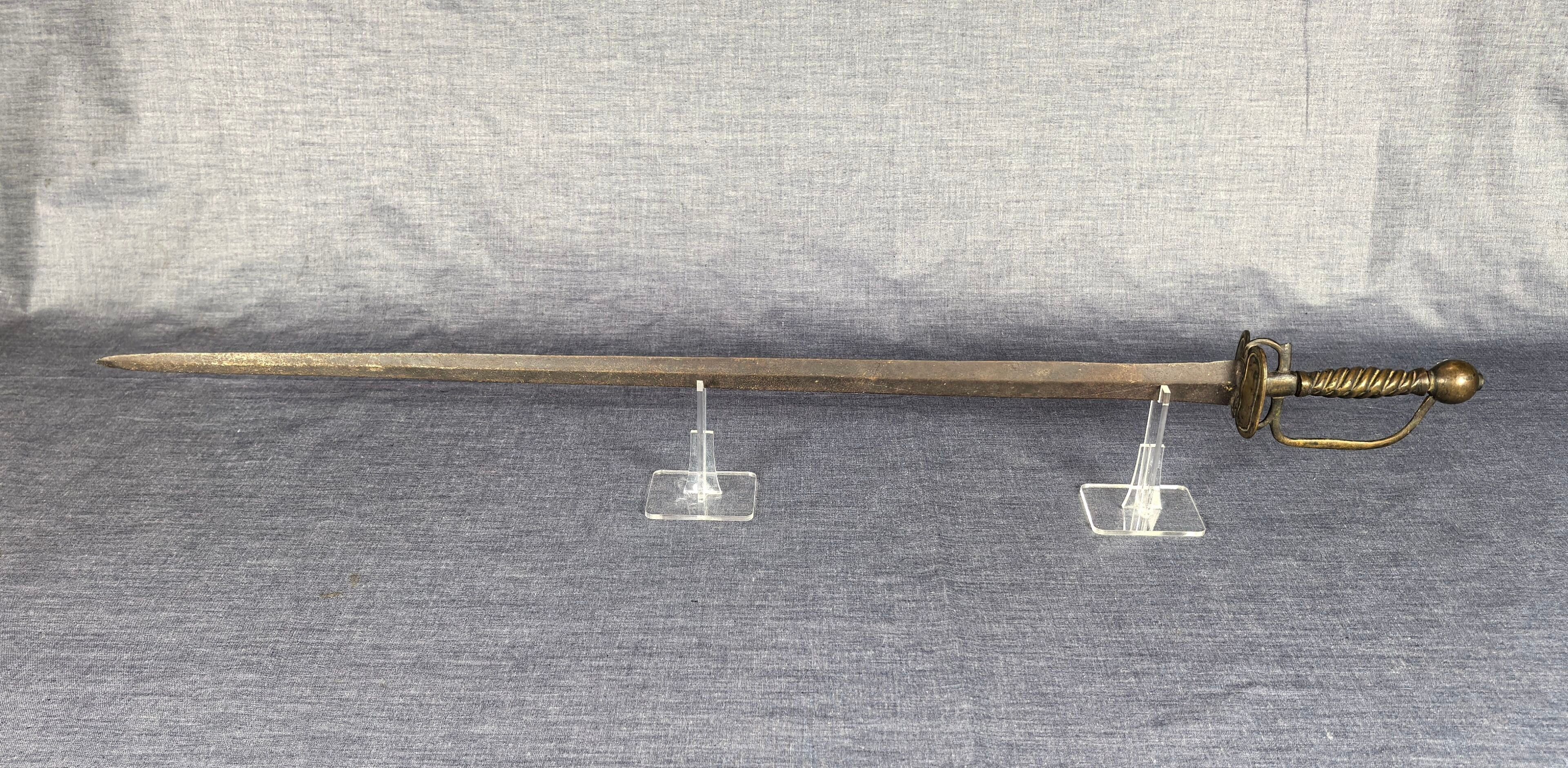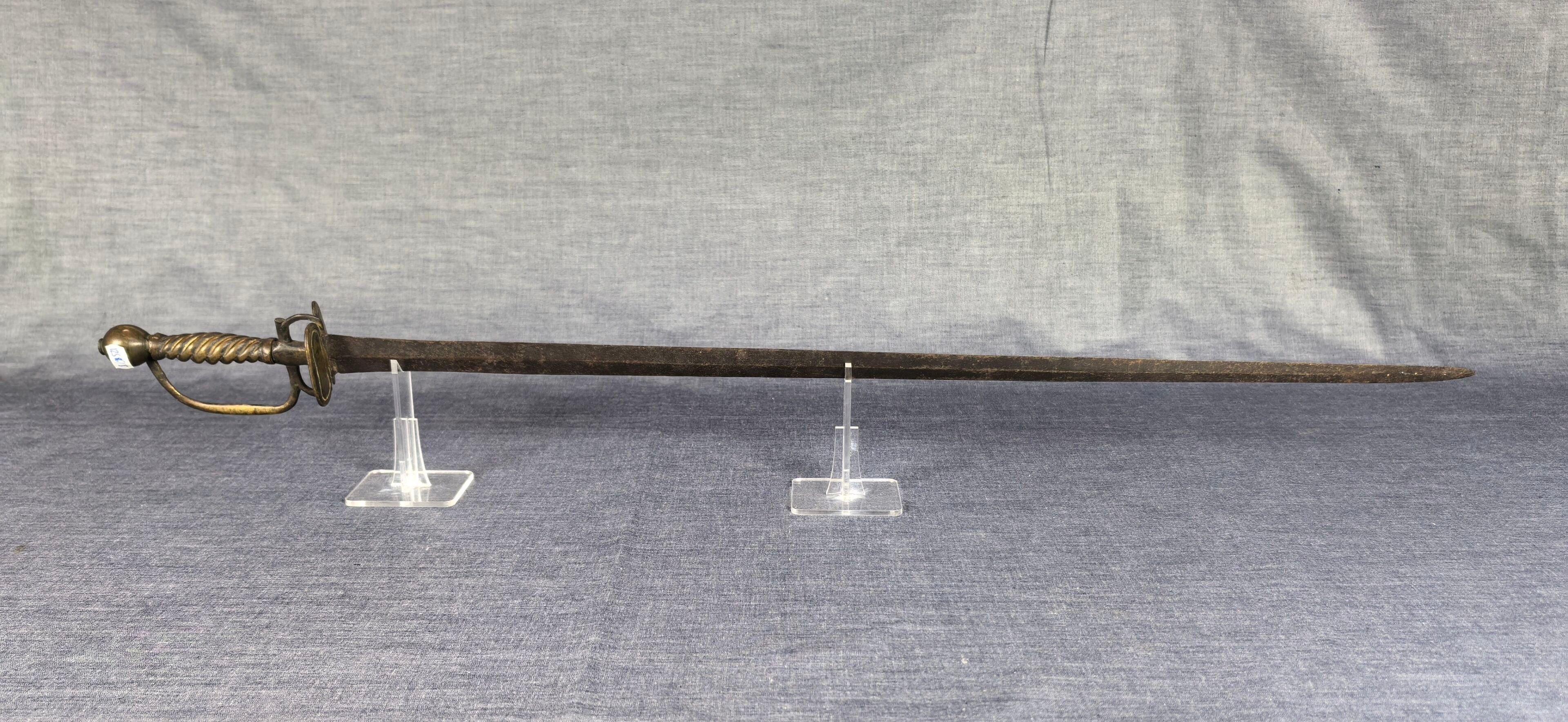Brass mount with oval double shell, side guard and spherical pommel, twisted grip. Straight steel blade with diamond-shaped cross-section.