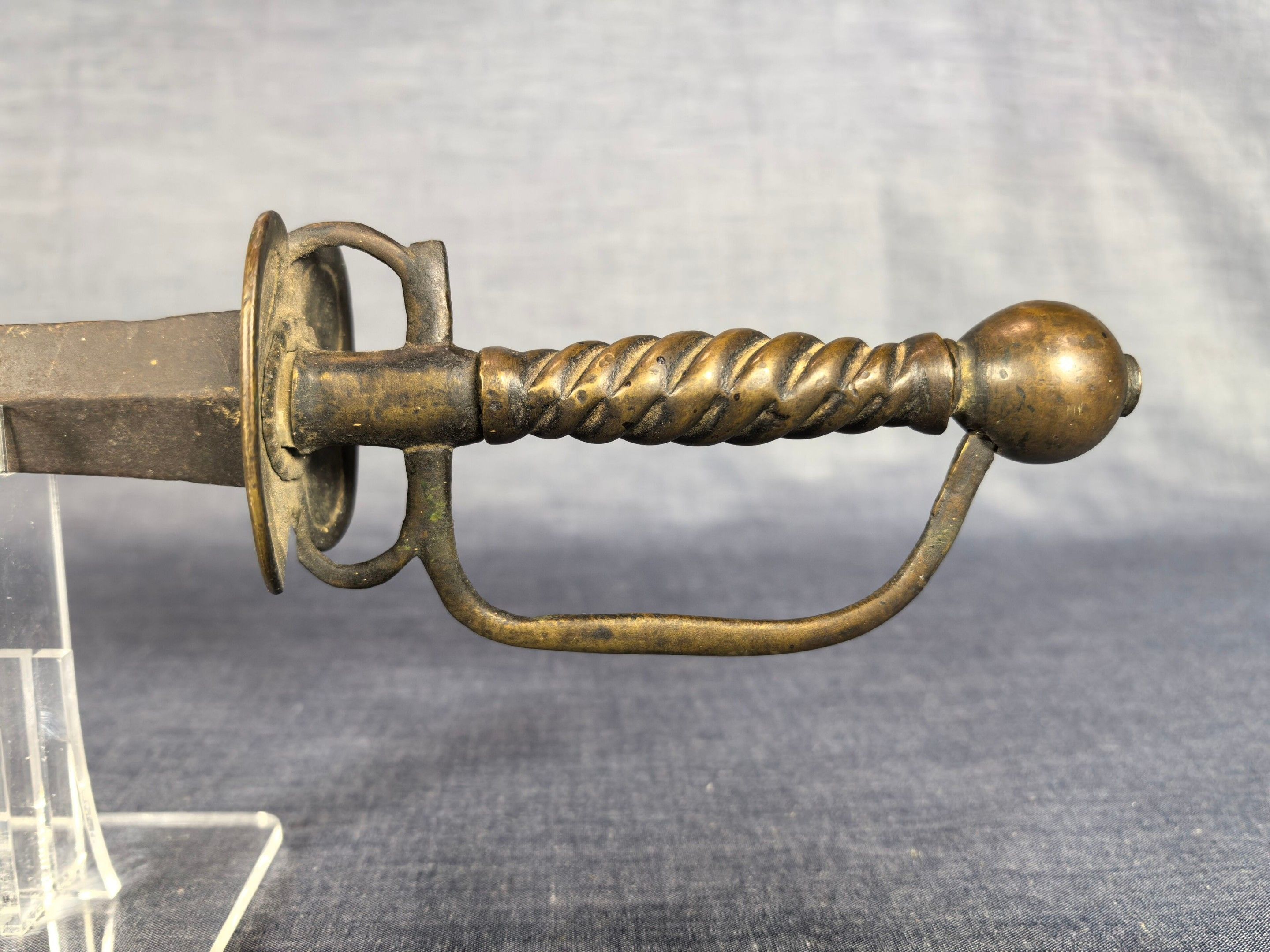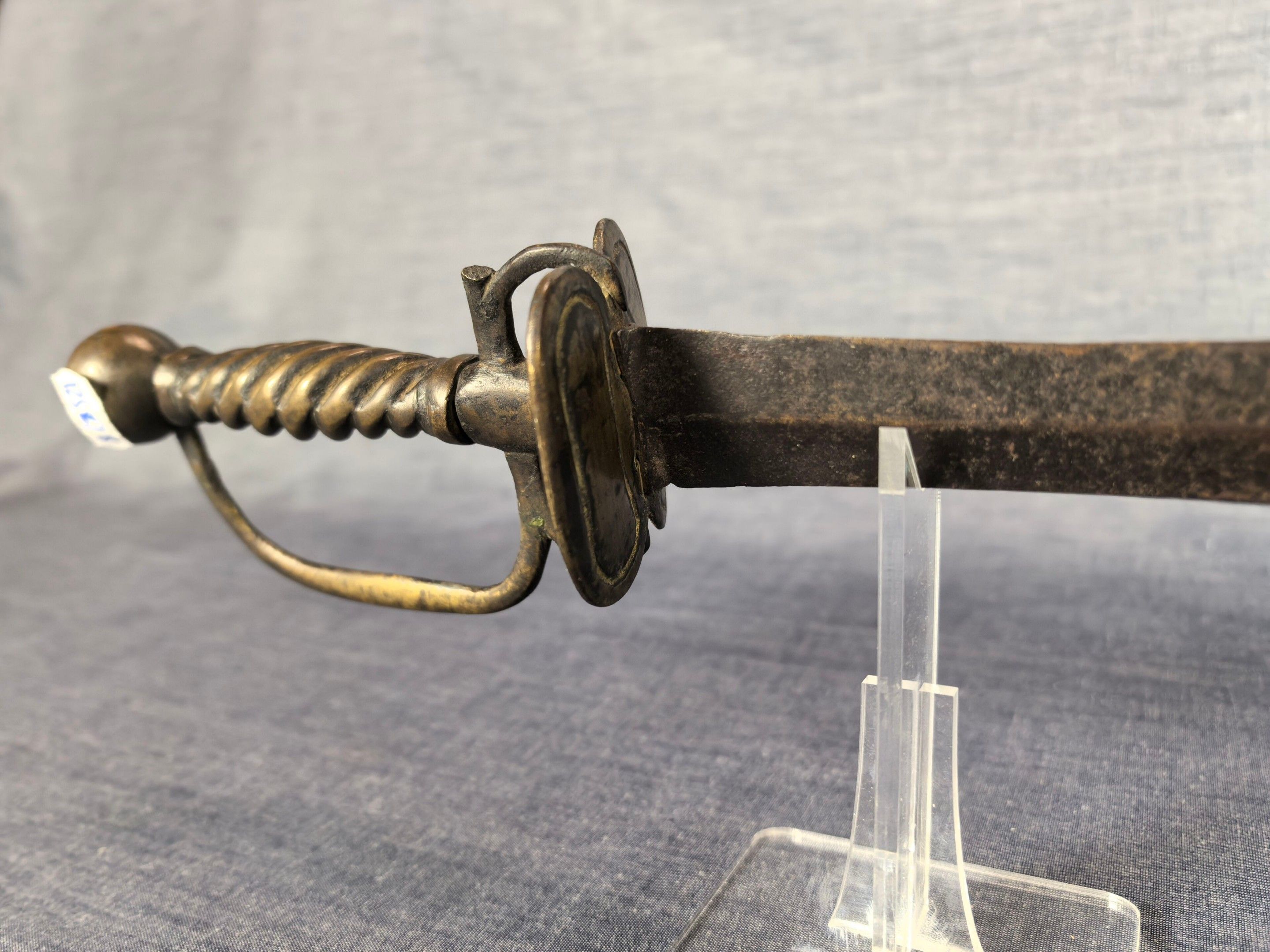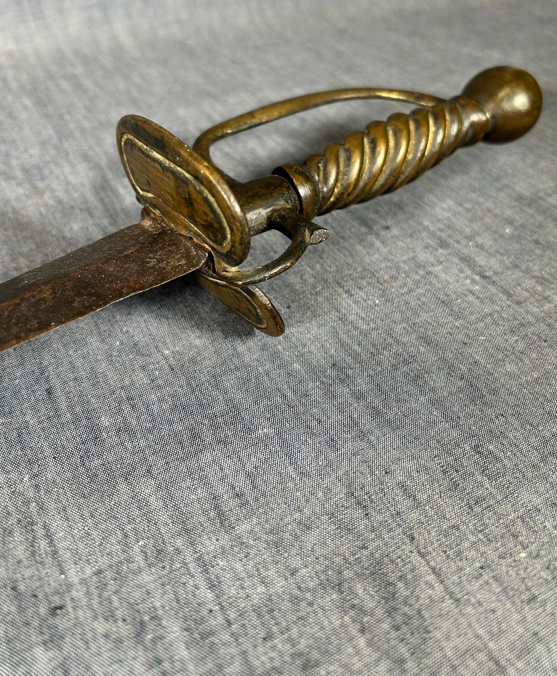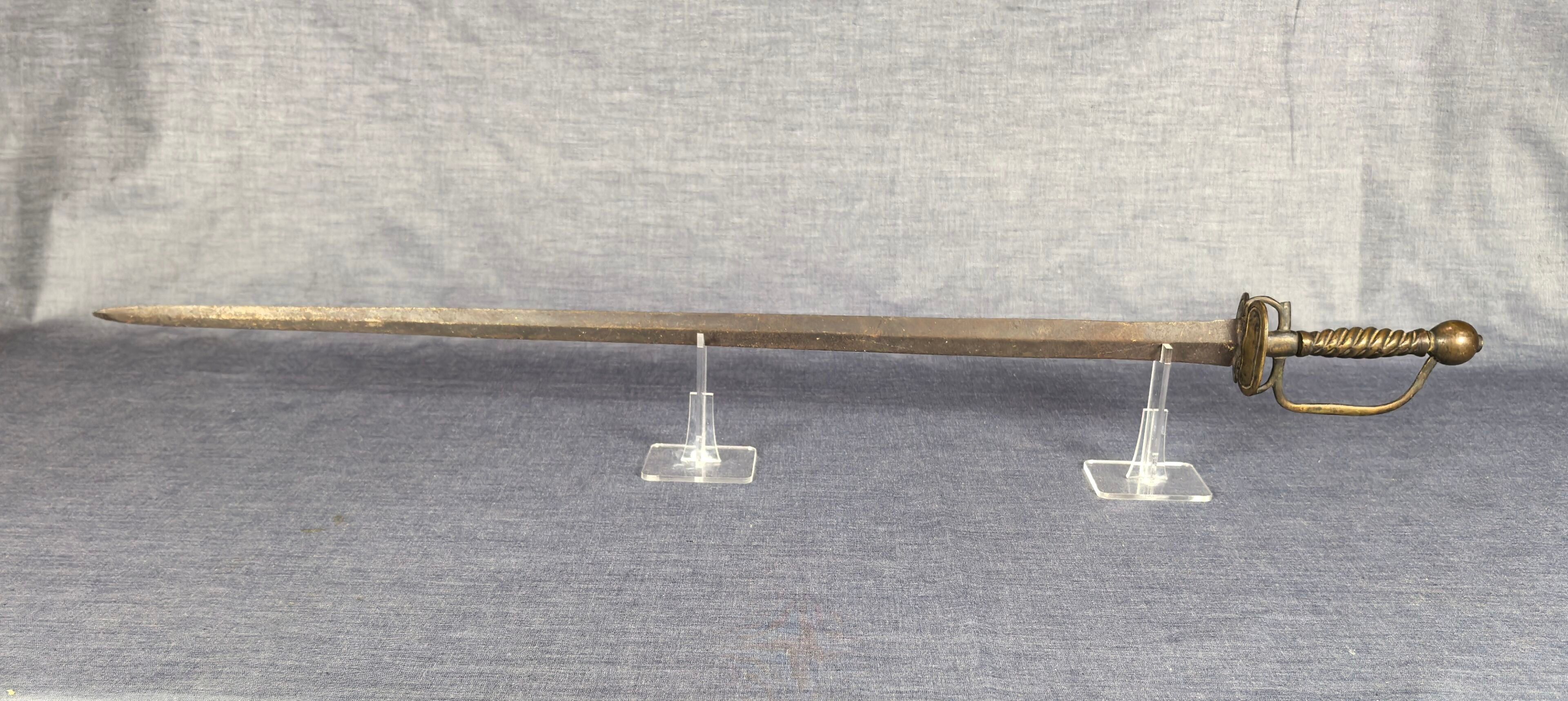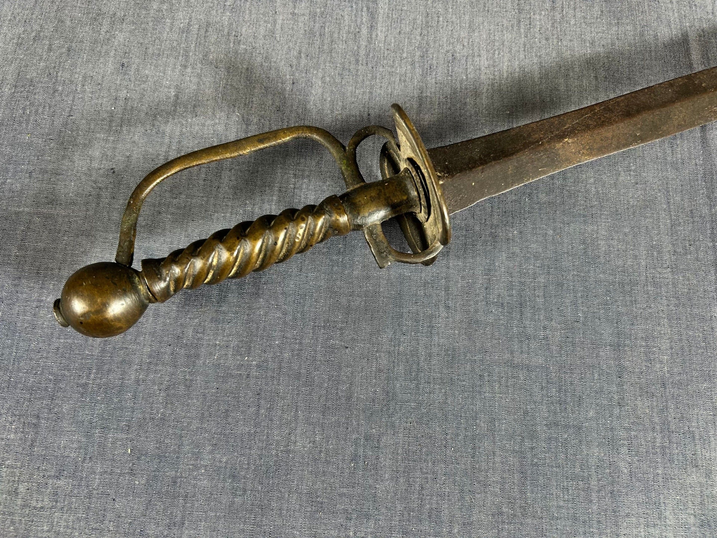 Brass mount with oval double shell, side guard and spherical pommel, twisted grip. Straight steel blade with diamond-shaped cross-section.