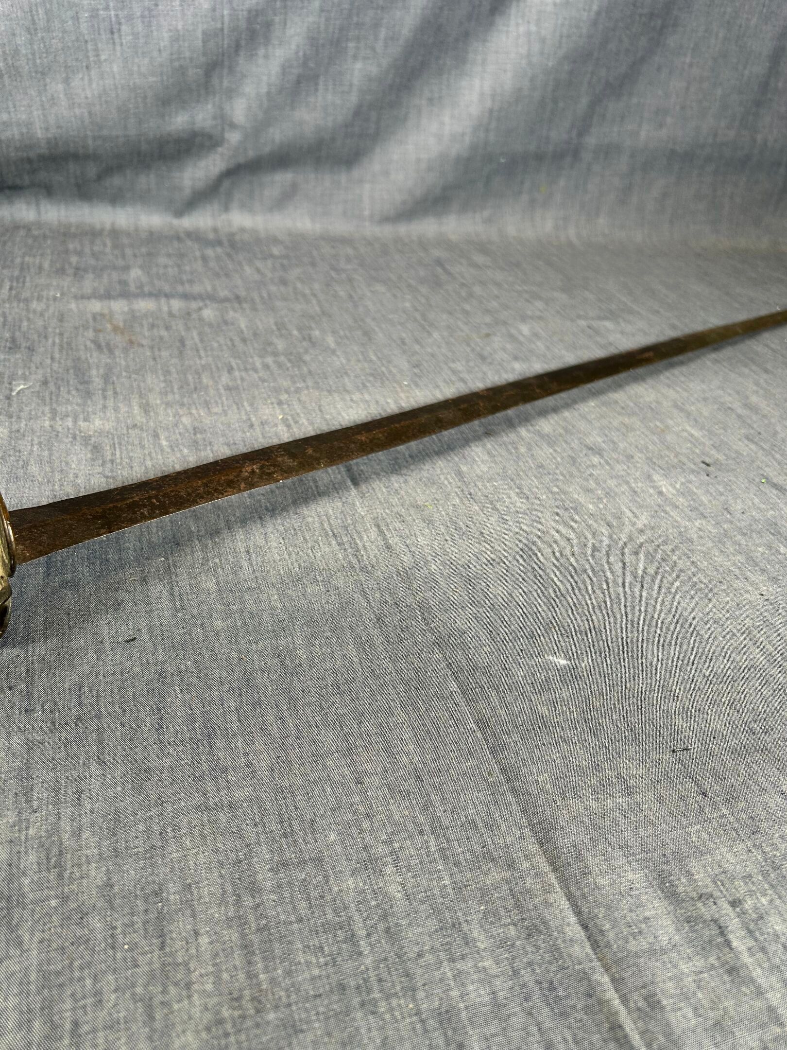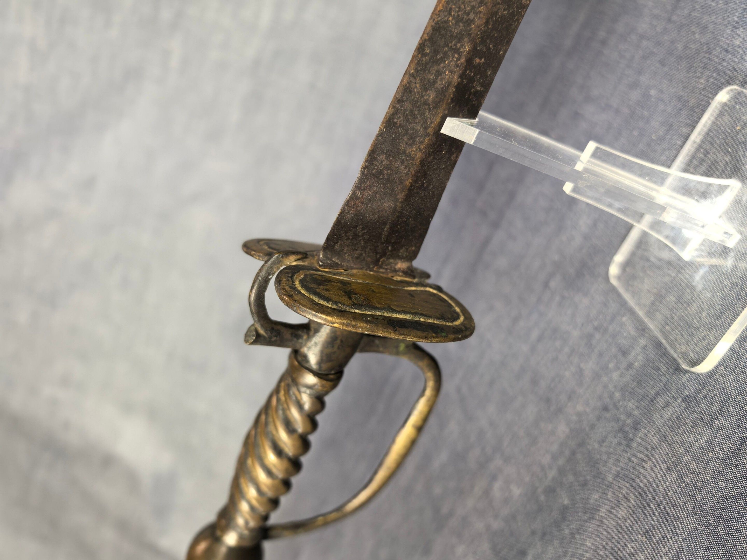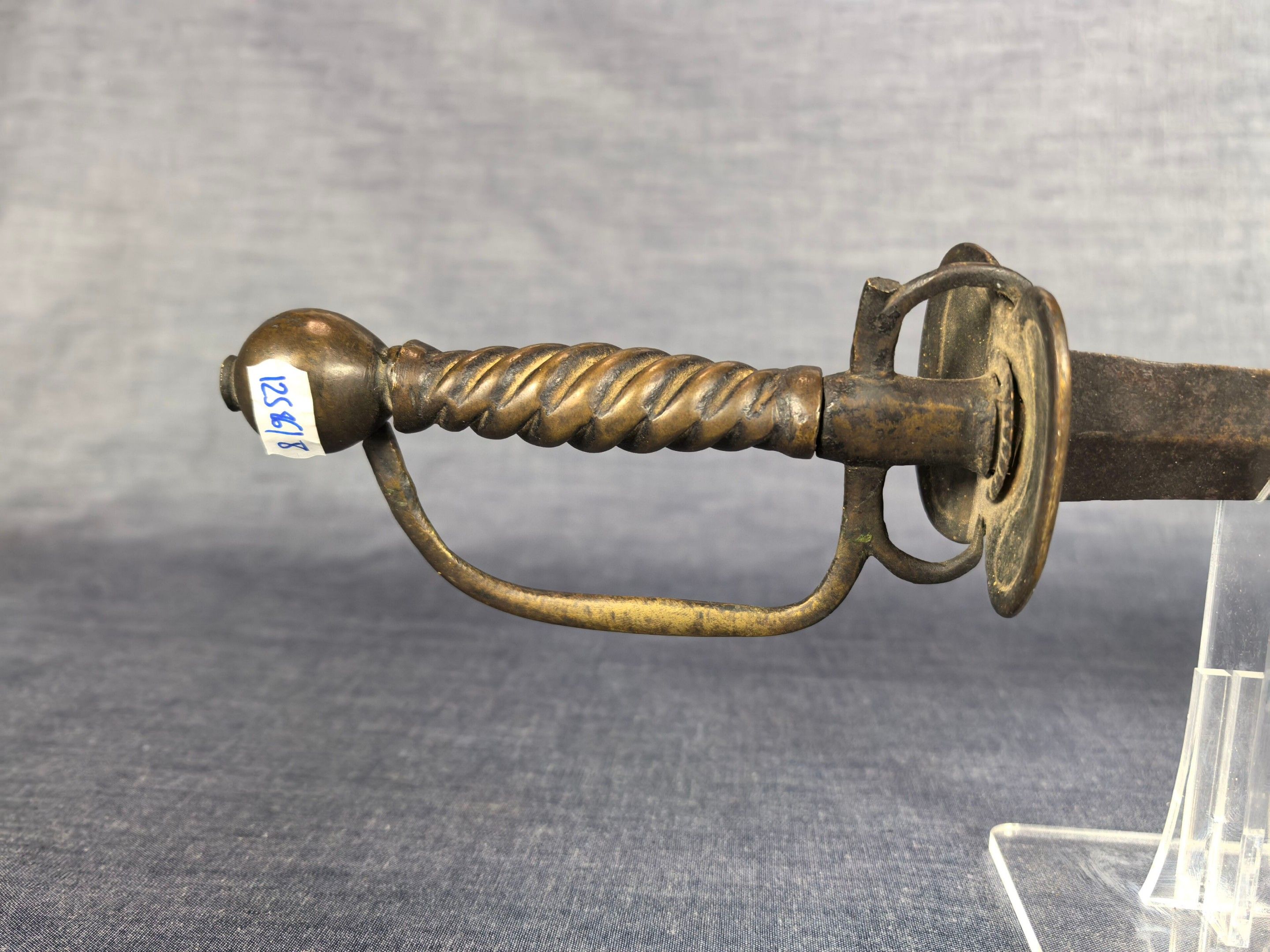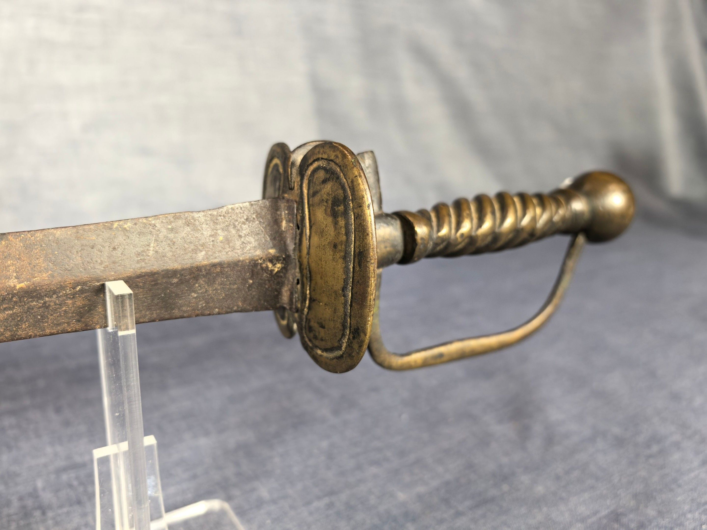 Brass mount with oval double shell, side guard and spherical pommel, twisted grip. Straight steel blade with diamond-shaped cross-section.