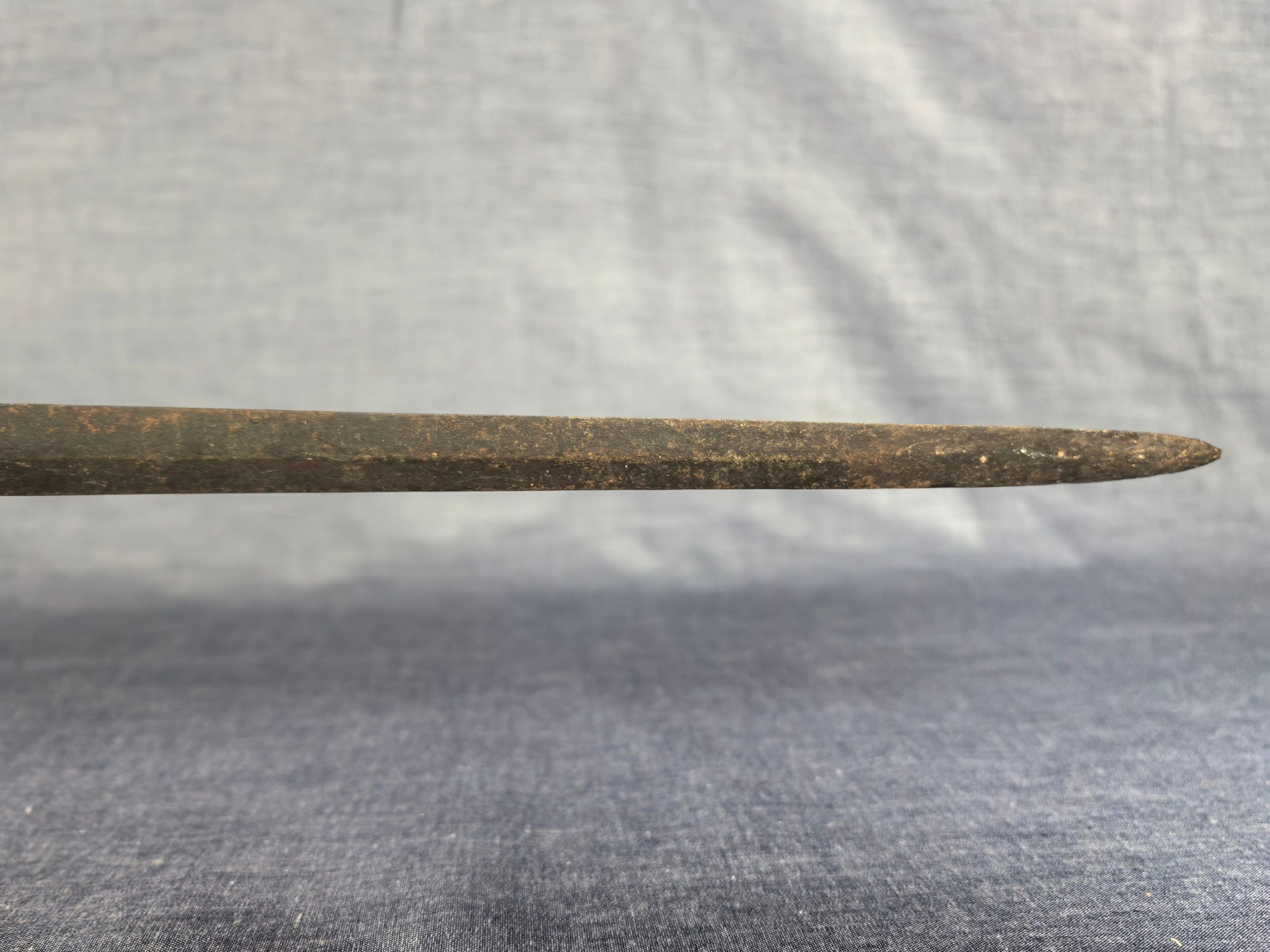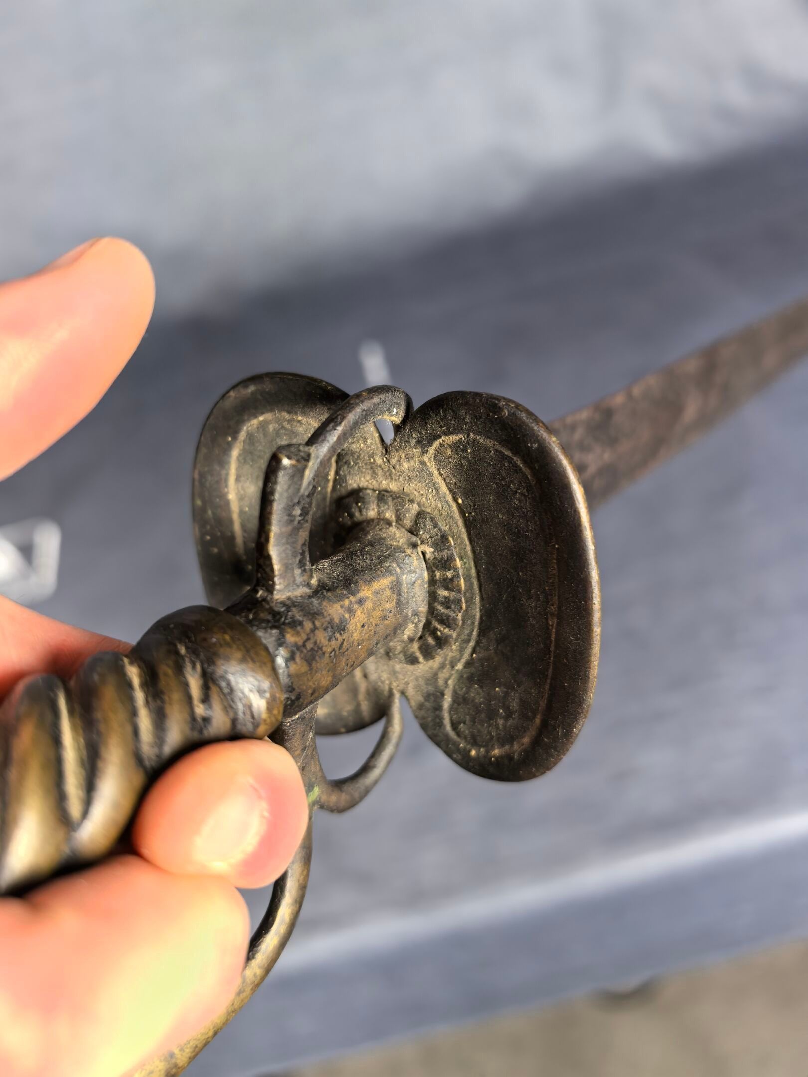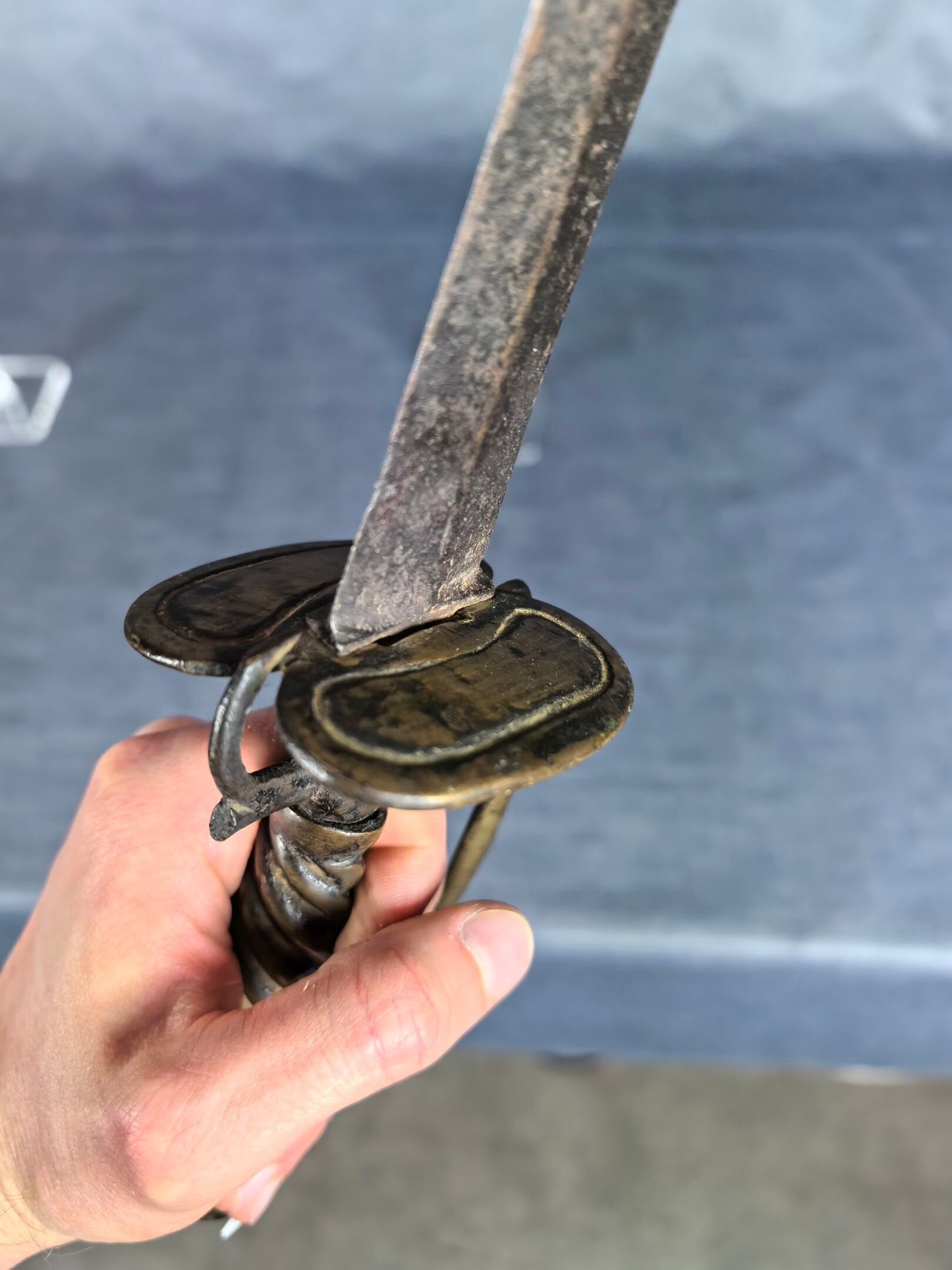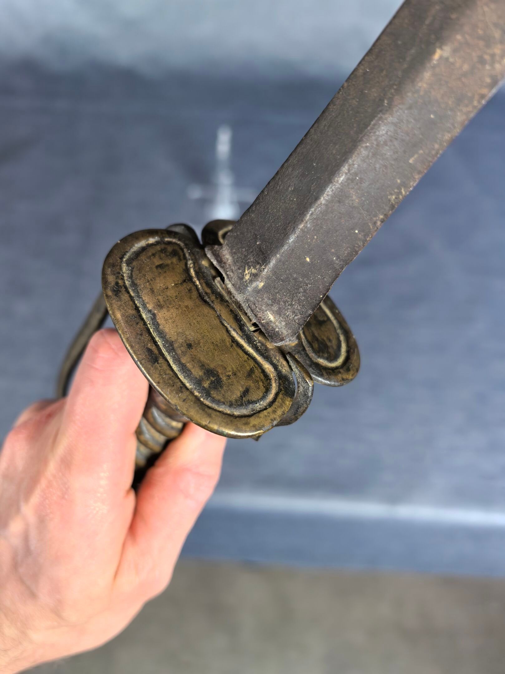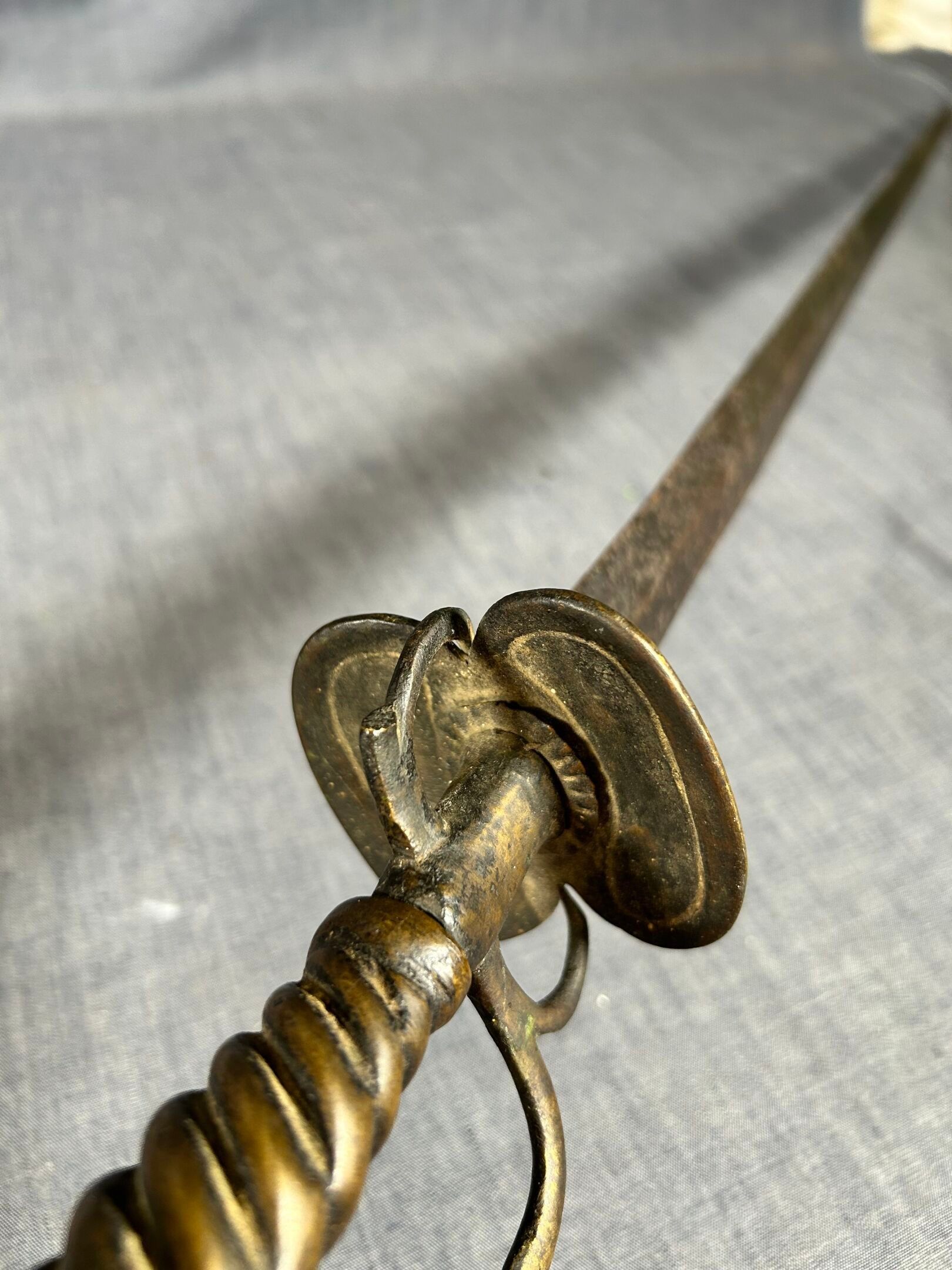 Brass mount with oval double shell, side guard and spherical pommel, twisted grip. Straight steel blade with diamond-shaped cross-section.