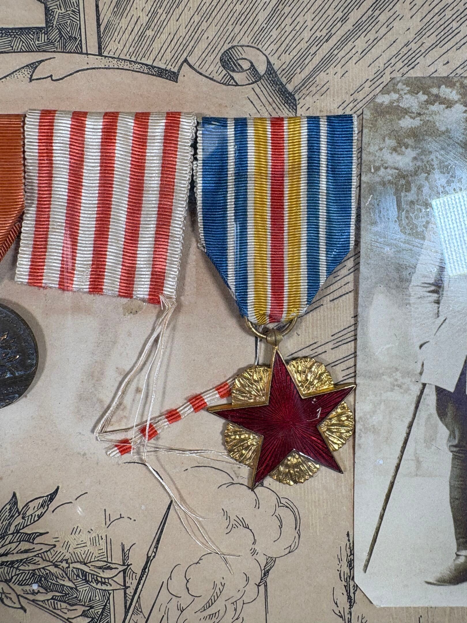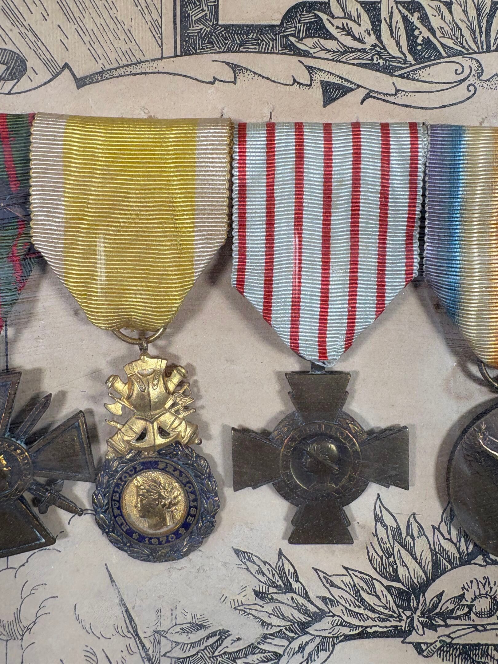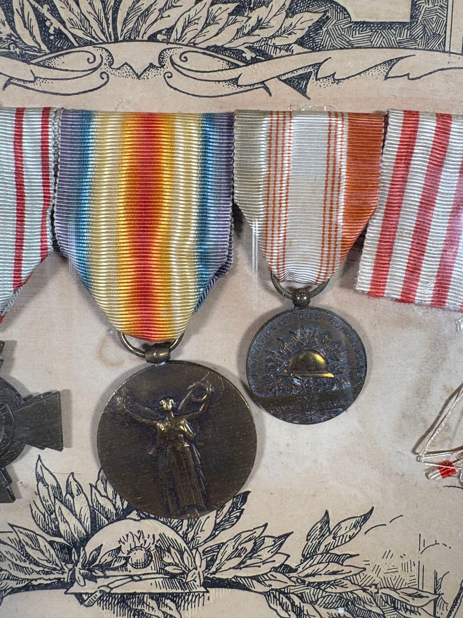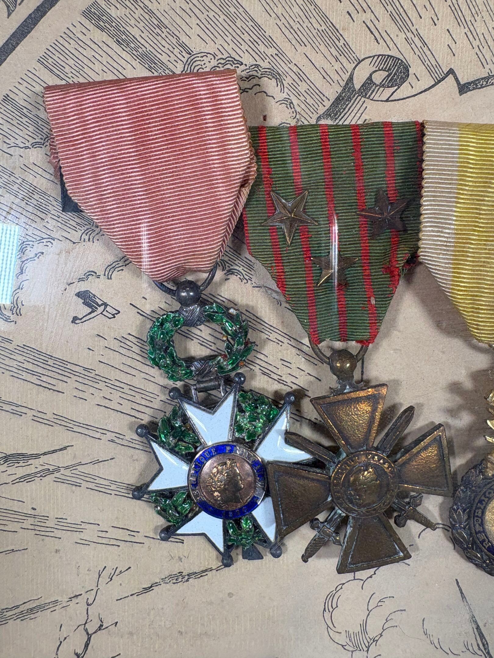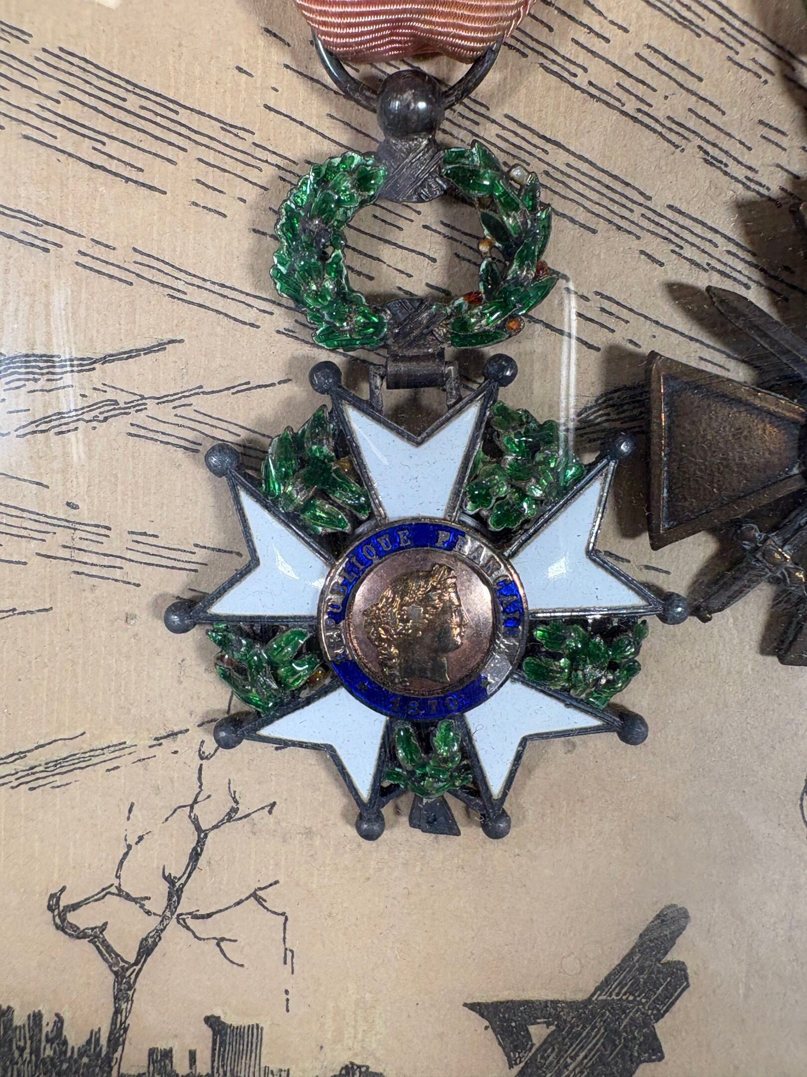 Medallion frame - PRA Marcel Adjutant in the 2 nd R.A.C - Mobilised on 2 August 1914 - 3 times Mentioned - 1914 - Suite of 7 medals with title 49 cm x 58 cm
