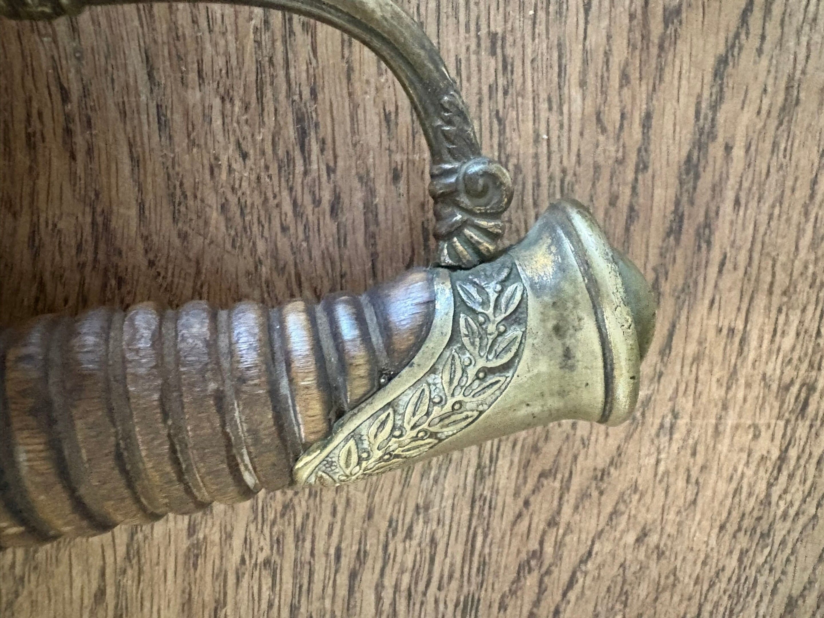 . Three-prong chased brass mounting, fluted wooden handle, curved flat-back blade.