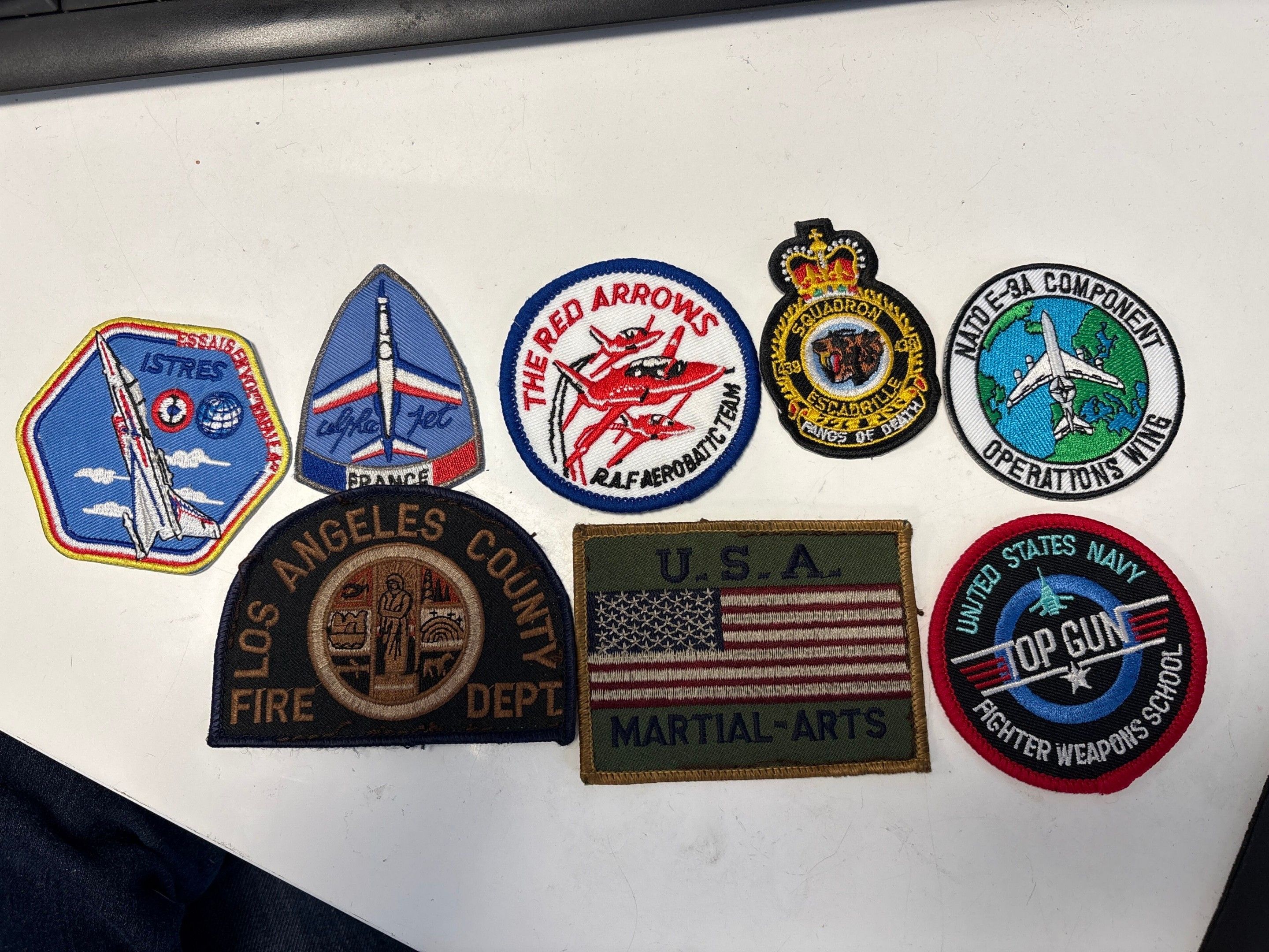 Lot of aviation and military patches, including 7 embroidered badges: Top Gun US Navy, Red Arrows RAF, Los Angeles County Fire Dept, NATO Sea Operations Wing, 152 Squadron RAF, Martial Arts U.S.A., and 2 French aviation patches (Dassault/Patrouille de France). A decorative police badge is included.