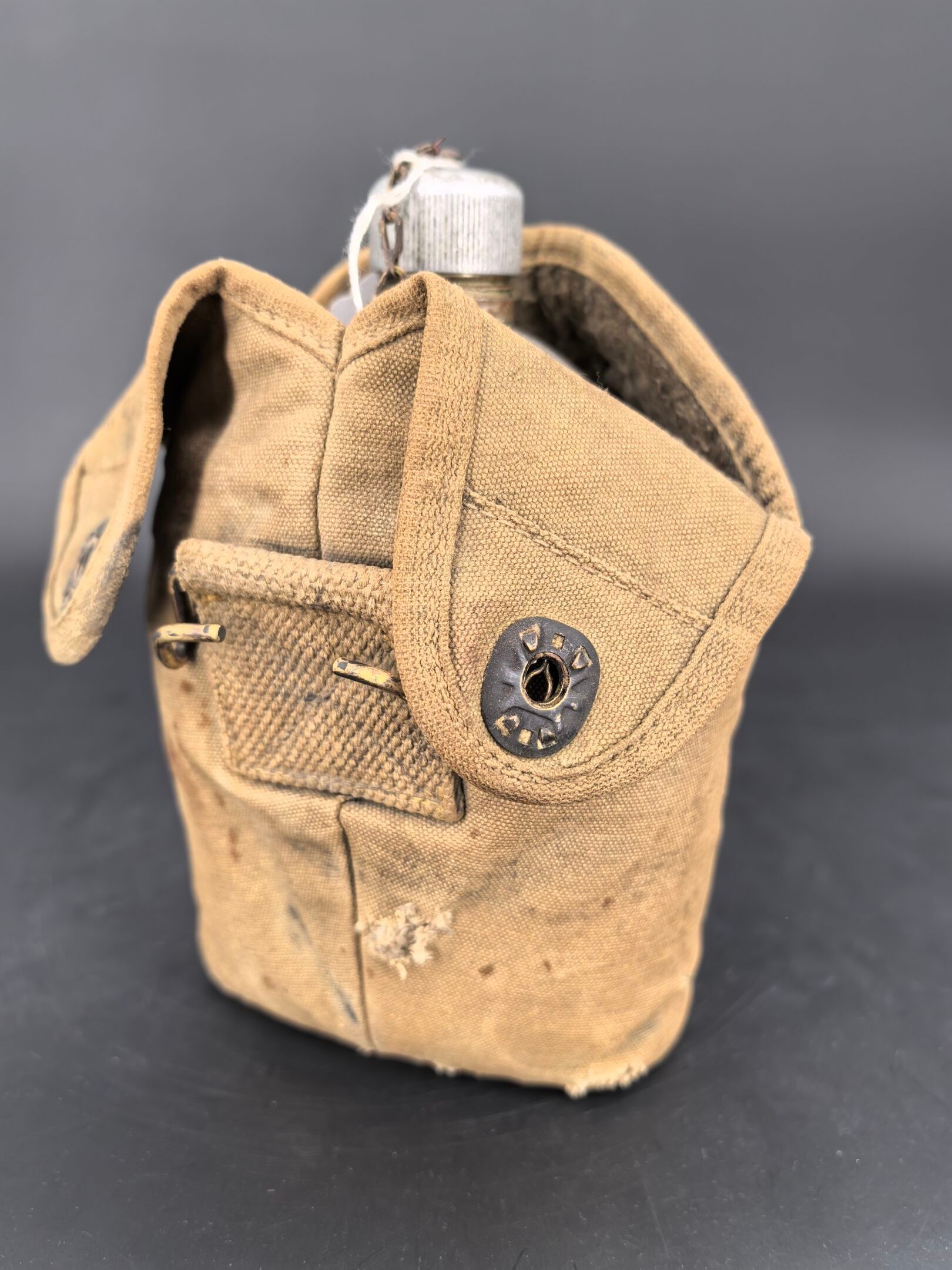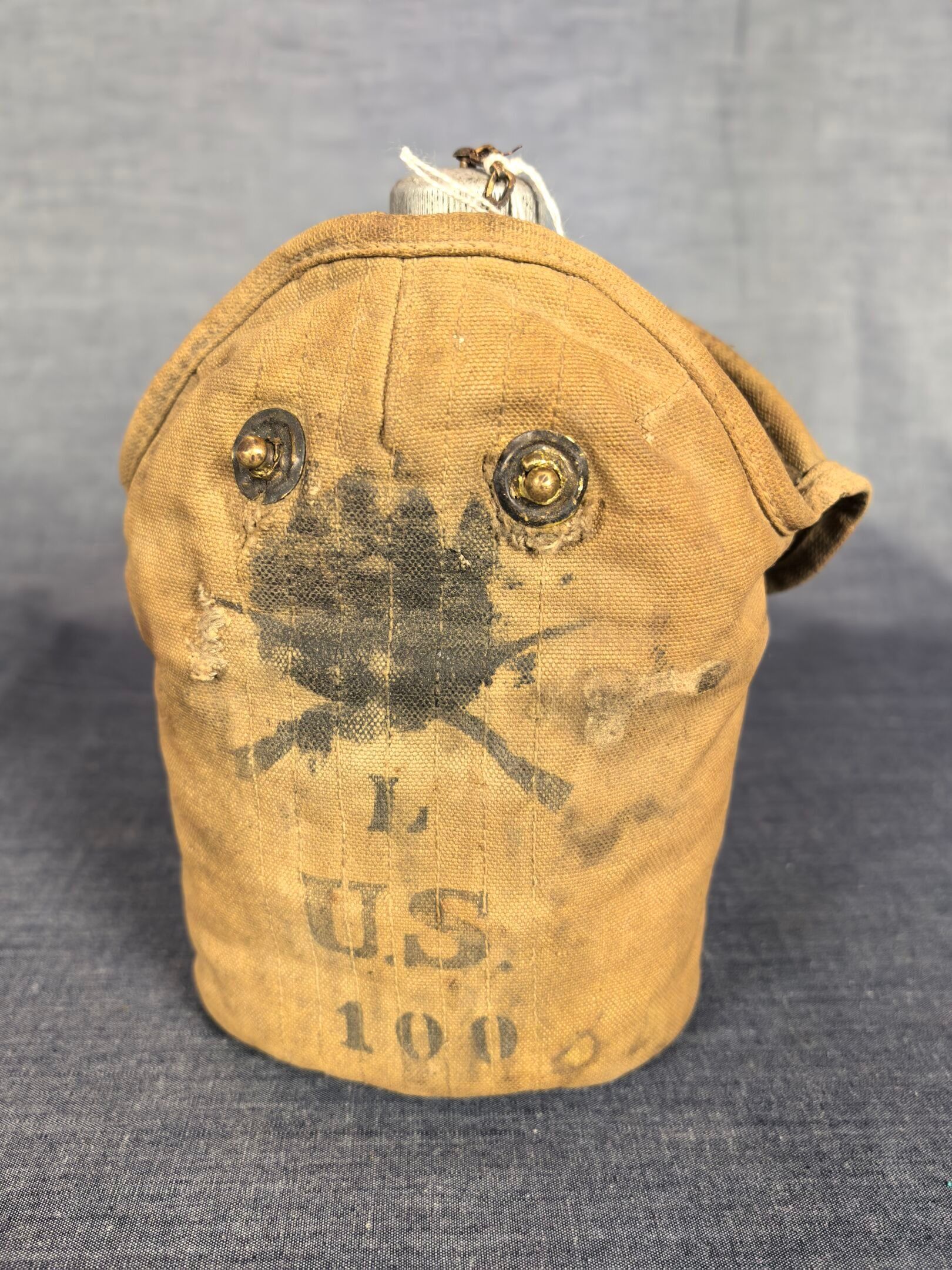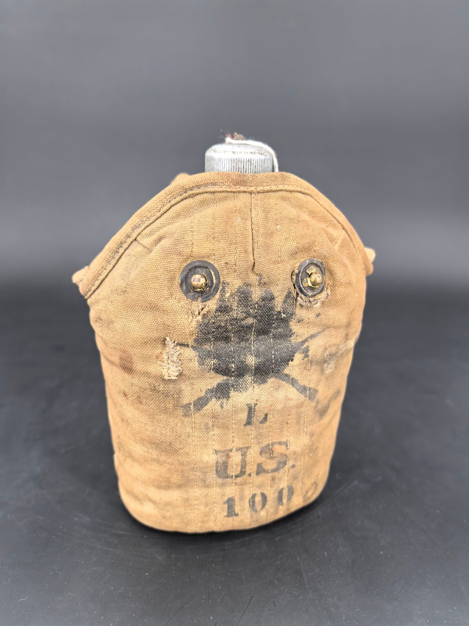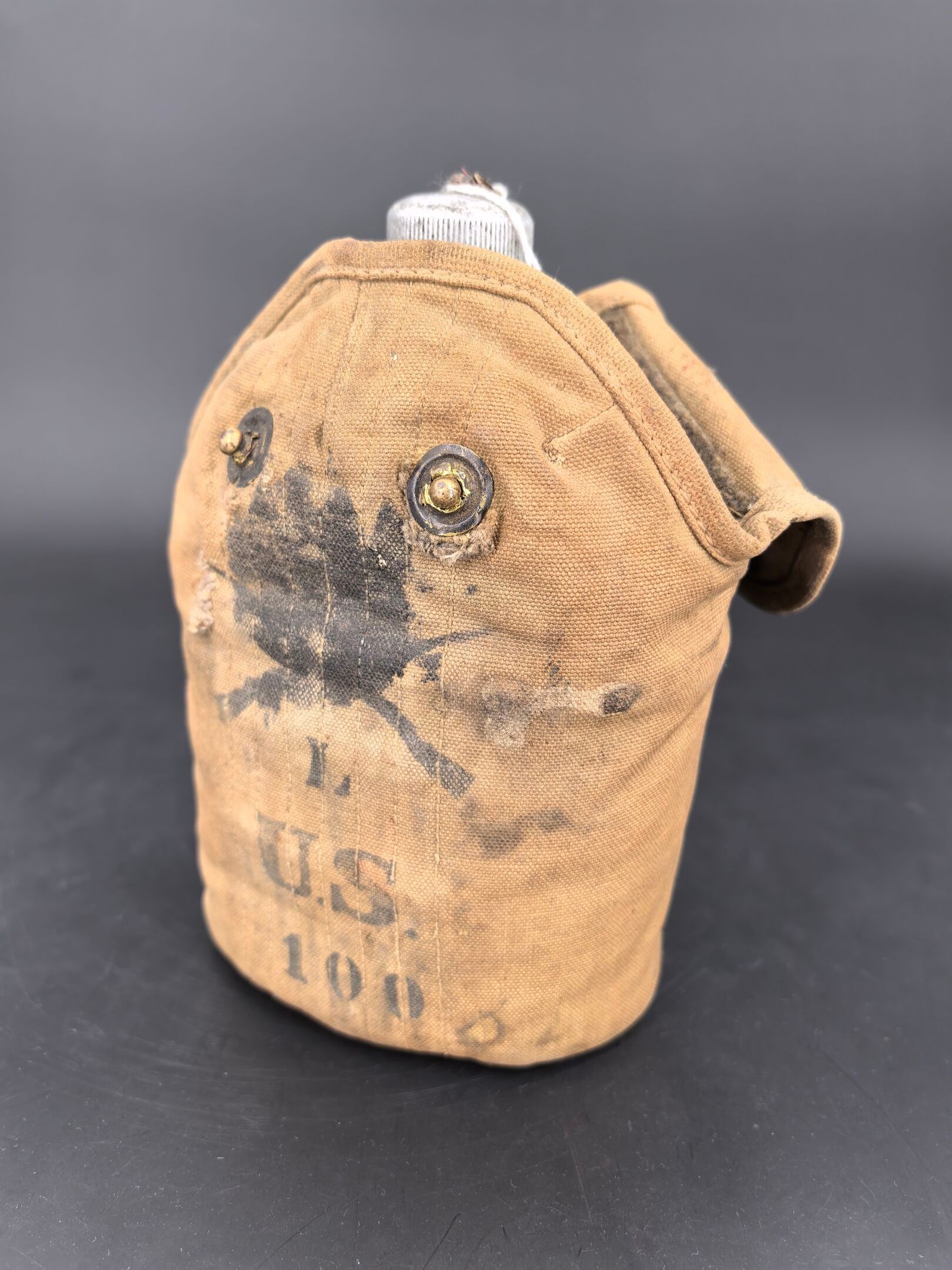 U.S. Model M1910 flask, 1ʳᵉ World War, Manufacturer: P. W. MFG. CO. 1917. Aluminium canteen with khaki canvas cover marked 'U.S. 100', brass snap closure.