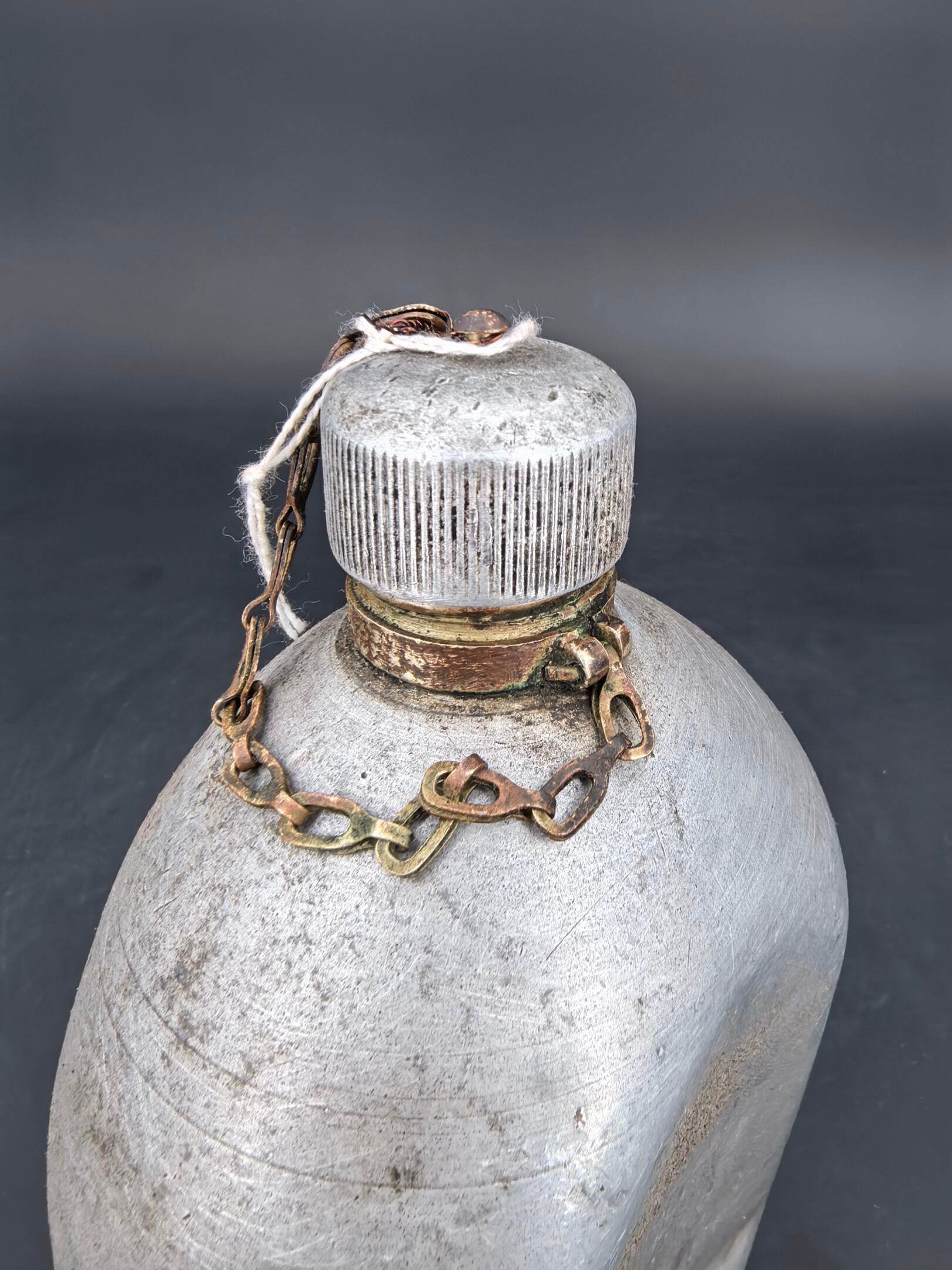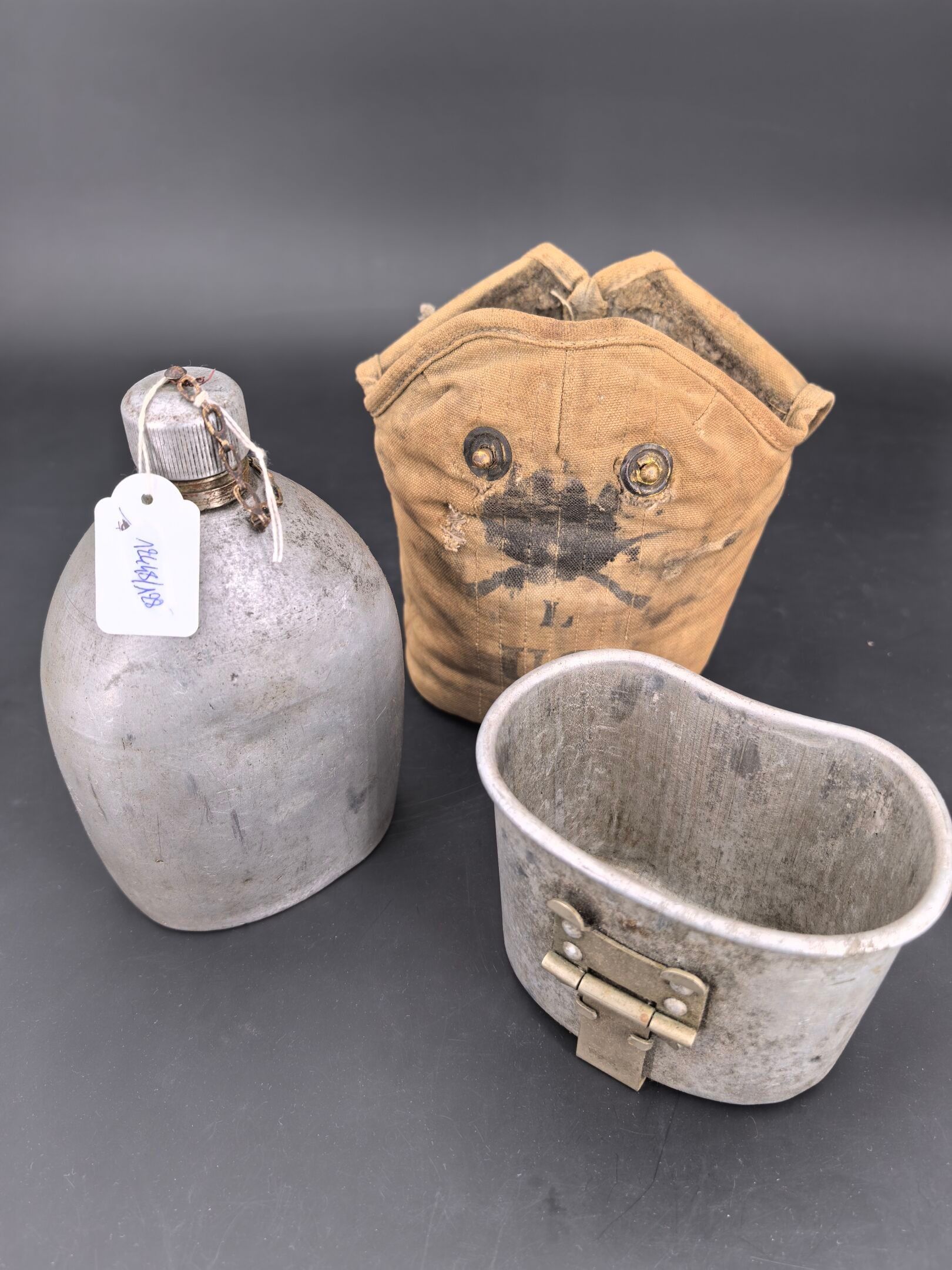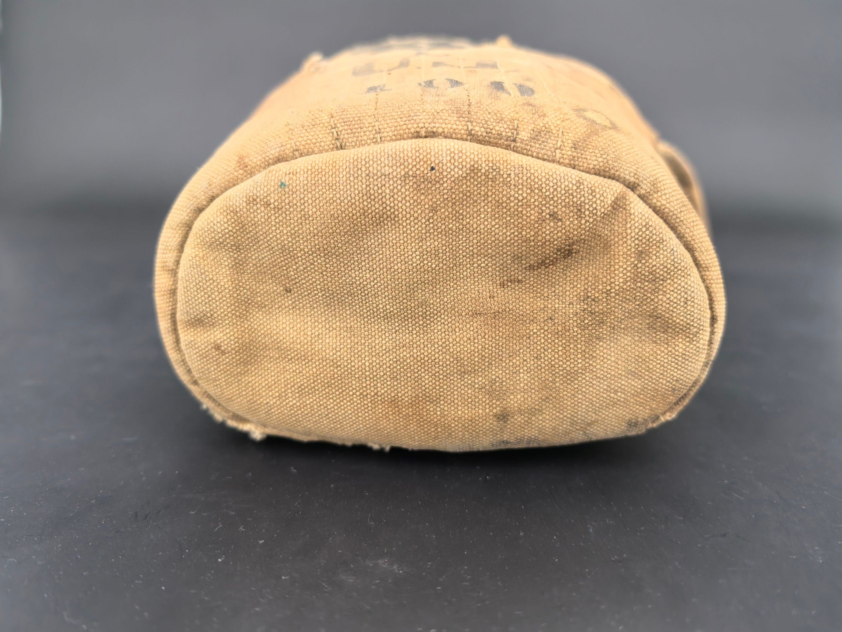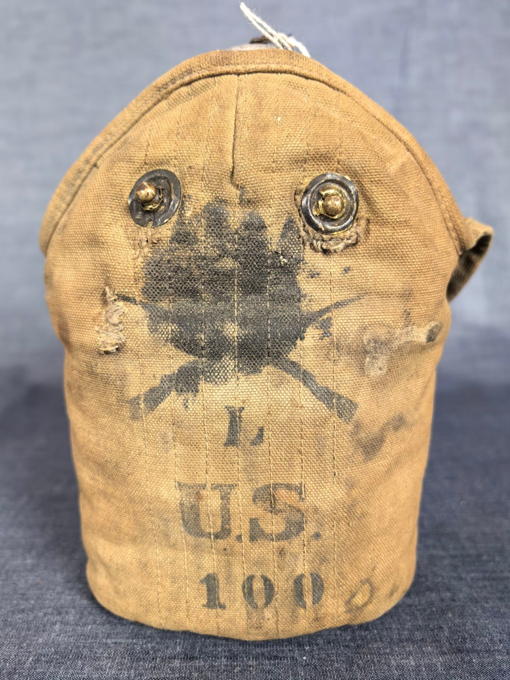 U.S. Model M1910 flask, 1ʳᵉ World War, Manufacturer: P. W. MFG. CO. 1917. Aluminium canteen with khaki canvas cover marked 'U.S. 100', brass snap closure.