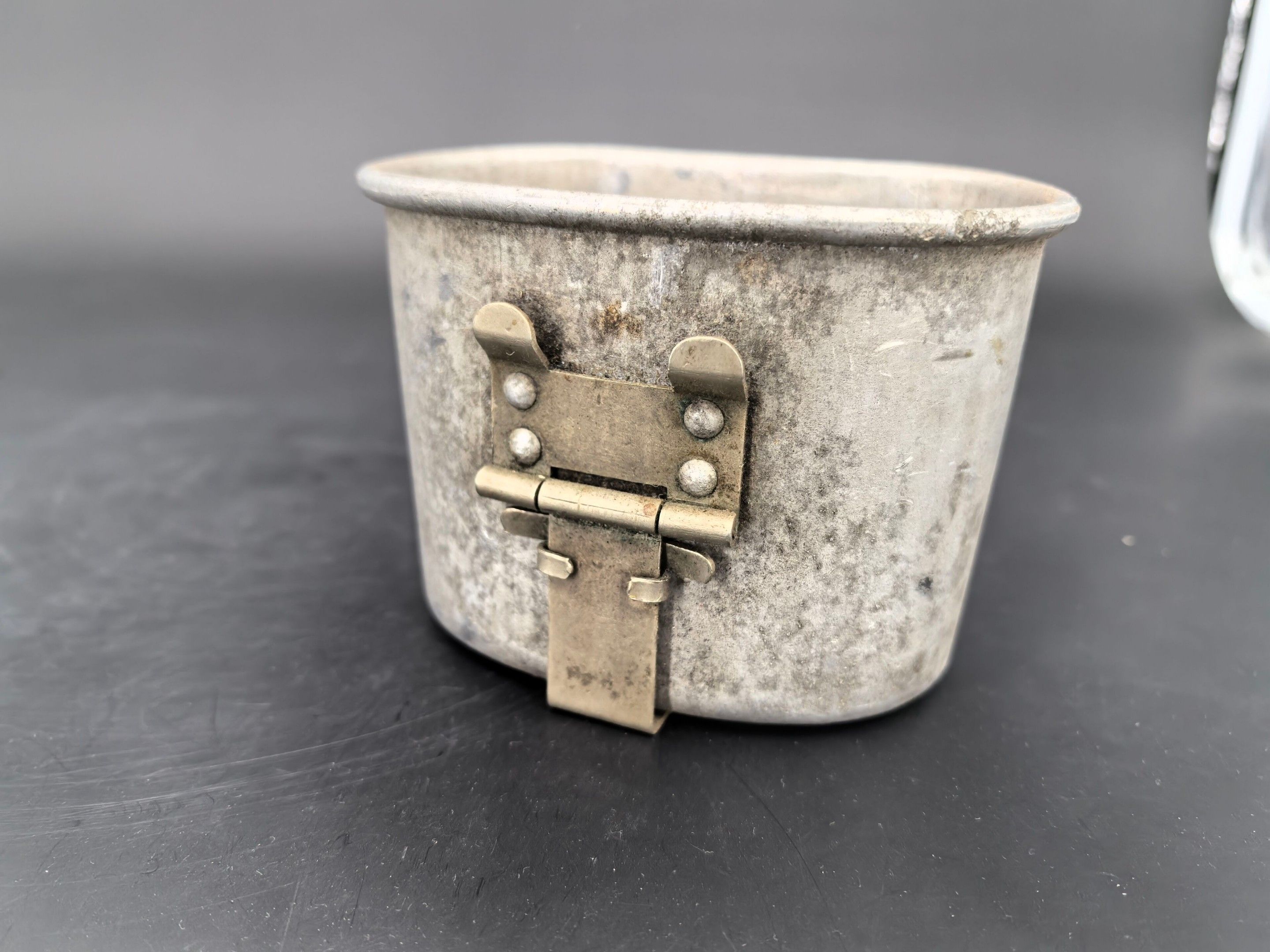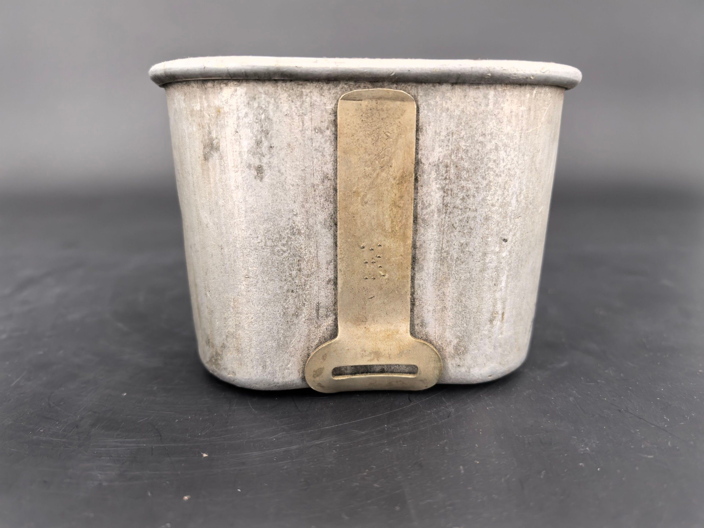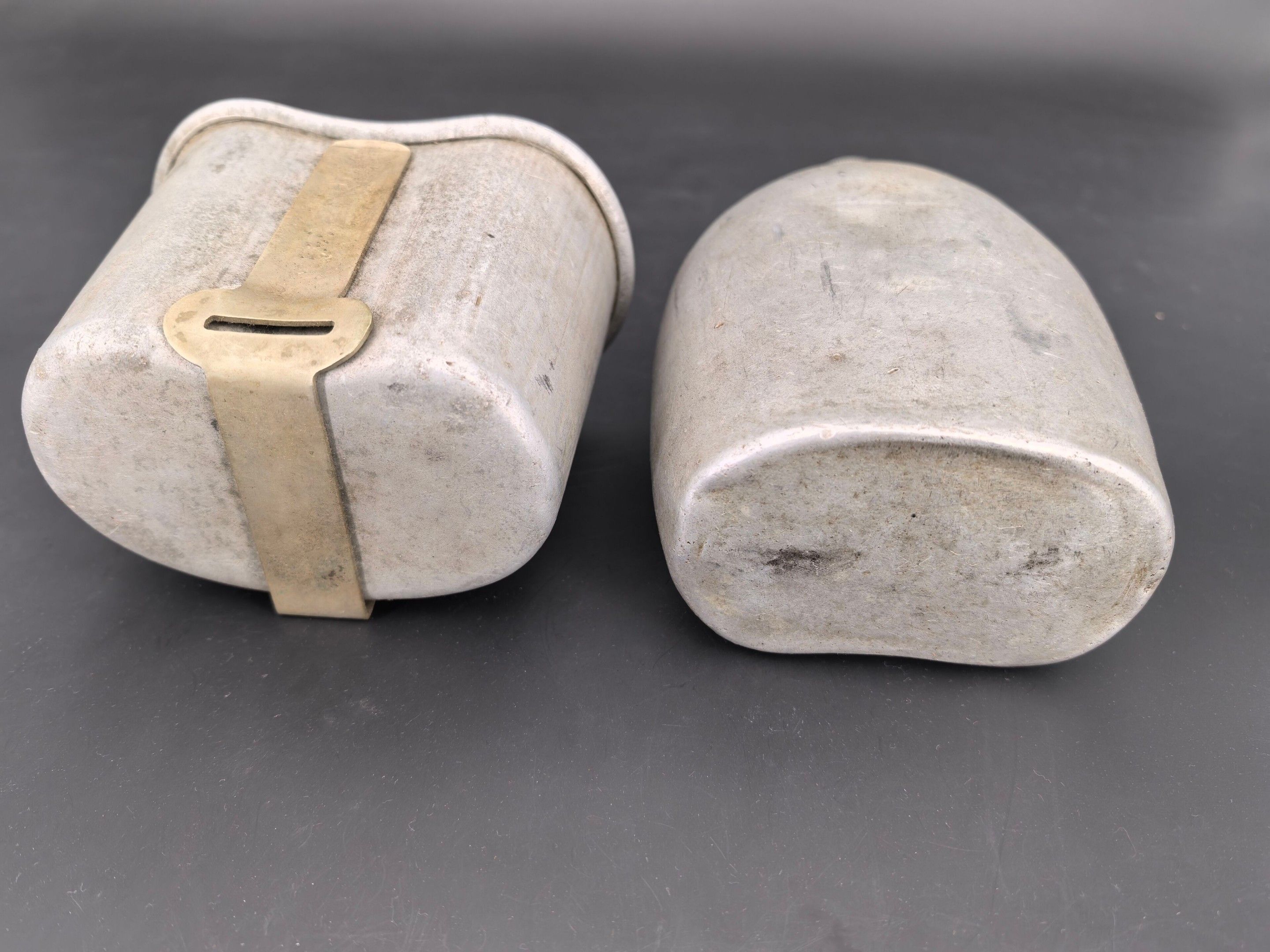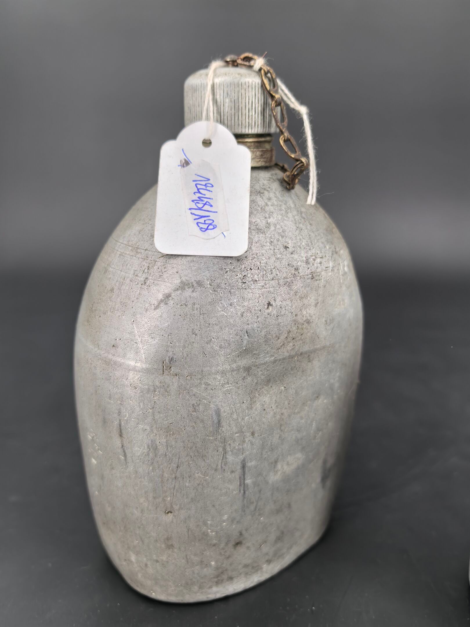 U.S. Model M1910 flask, 1ʳᵉ World War, Manufacturer: P. W. MFG. CO. 1917. Aluminium canteen with khaki canvas cover marked 'U.S. 100', brass snap closure.