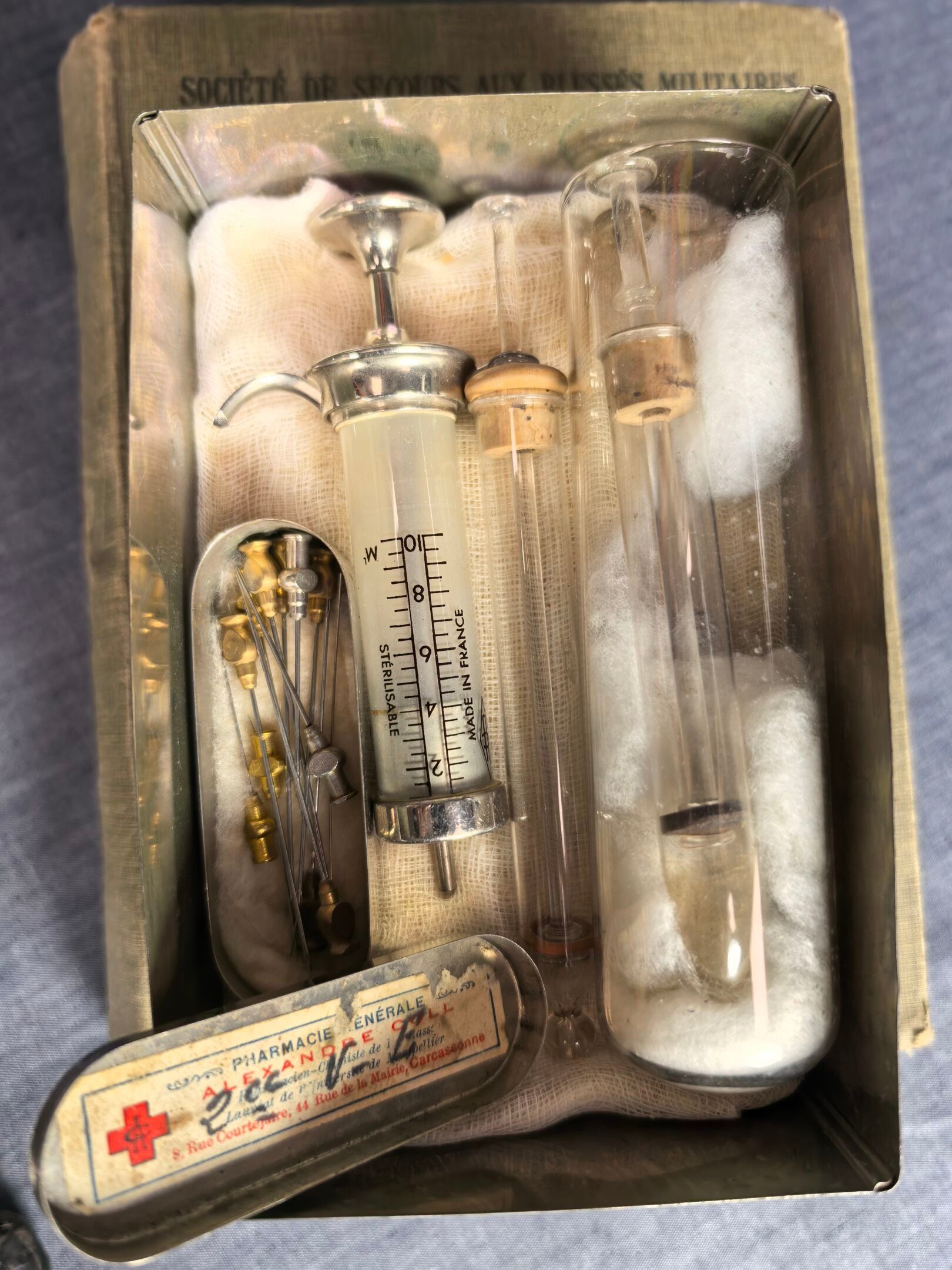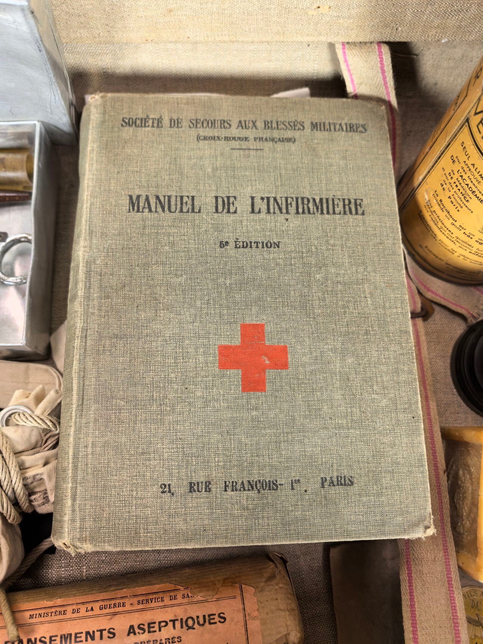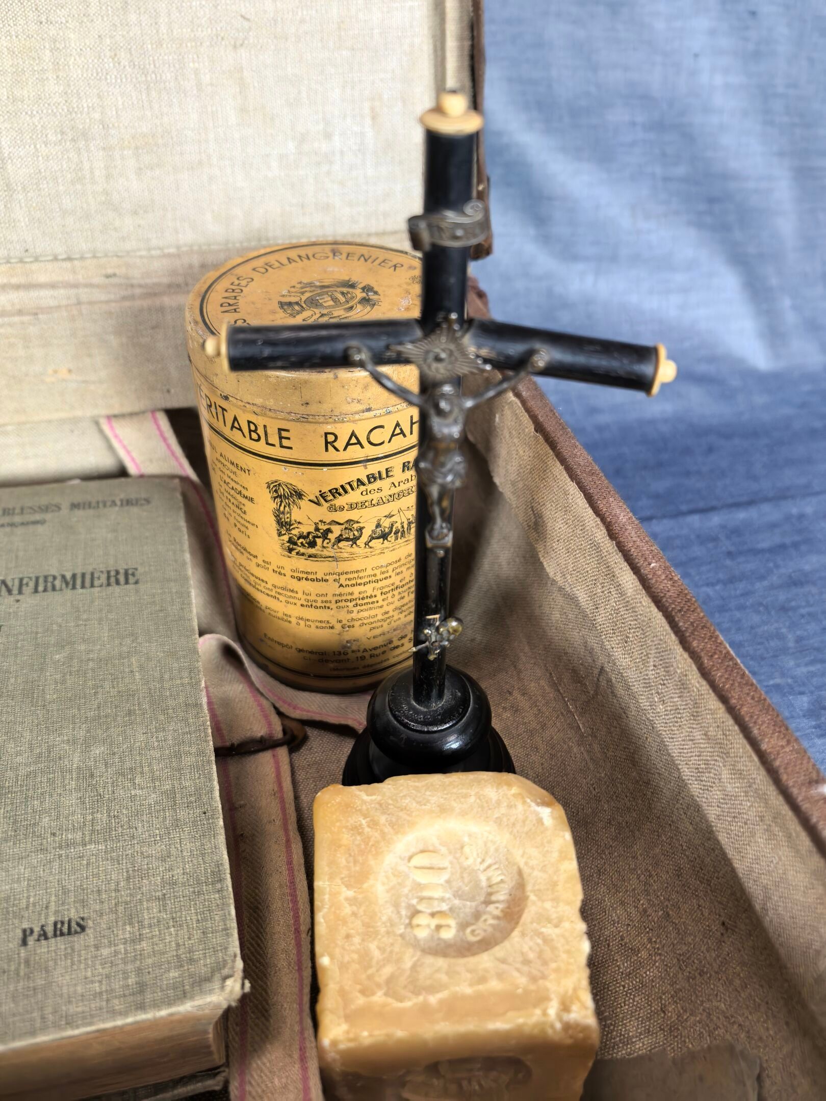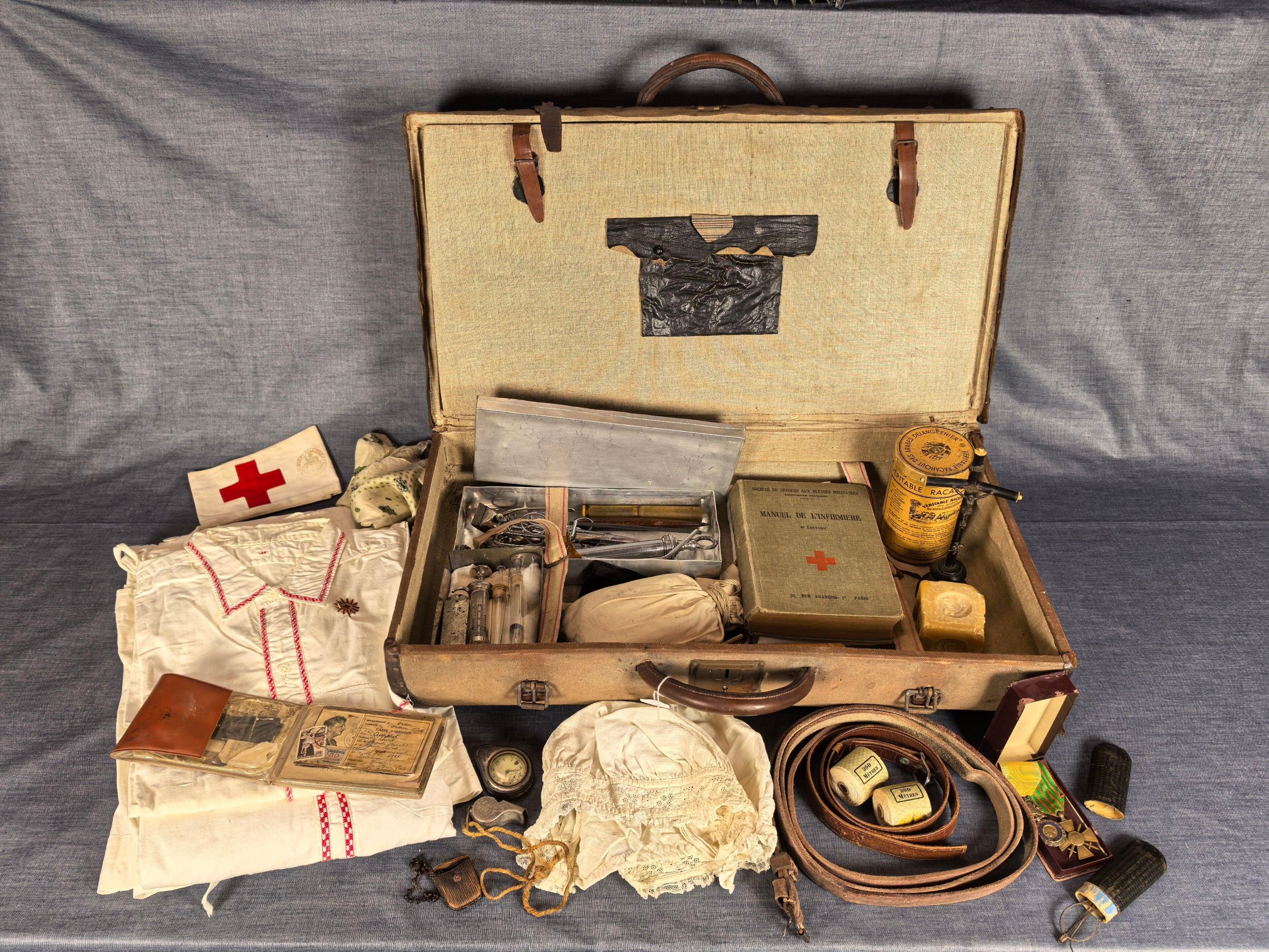 WW1 nurse's suitcase said to have belonged to Gabrielle Aupetit born 12 May 1888. Identity papers and photographs in a card holder. Suitcase containing the complete panoply of the wartime nurse, blanket, rosary, manual, whistle, watch, utensils, costume, soap, thread, dressings, belt, lead holder, syringes... 2 medals, including the Croix de Guerre and the veteran's medal.