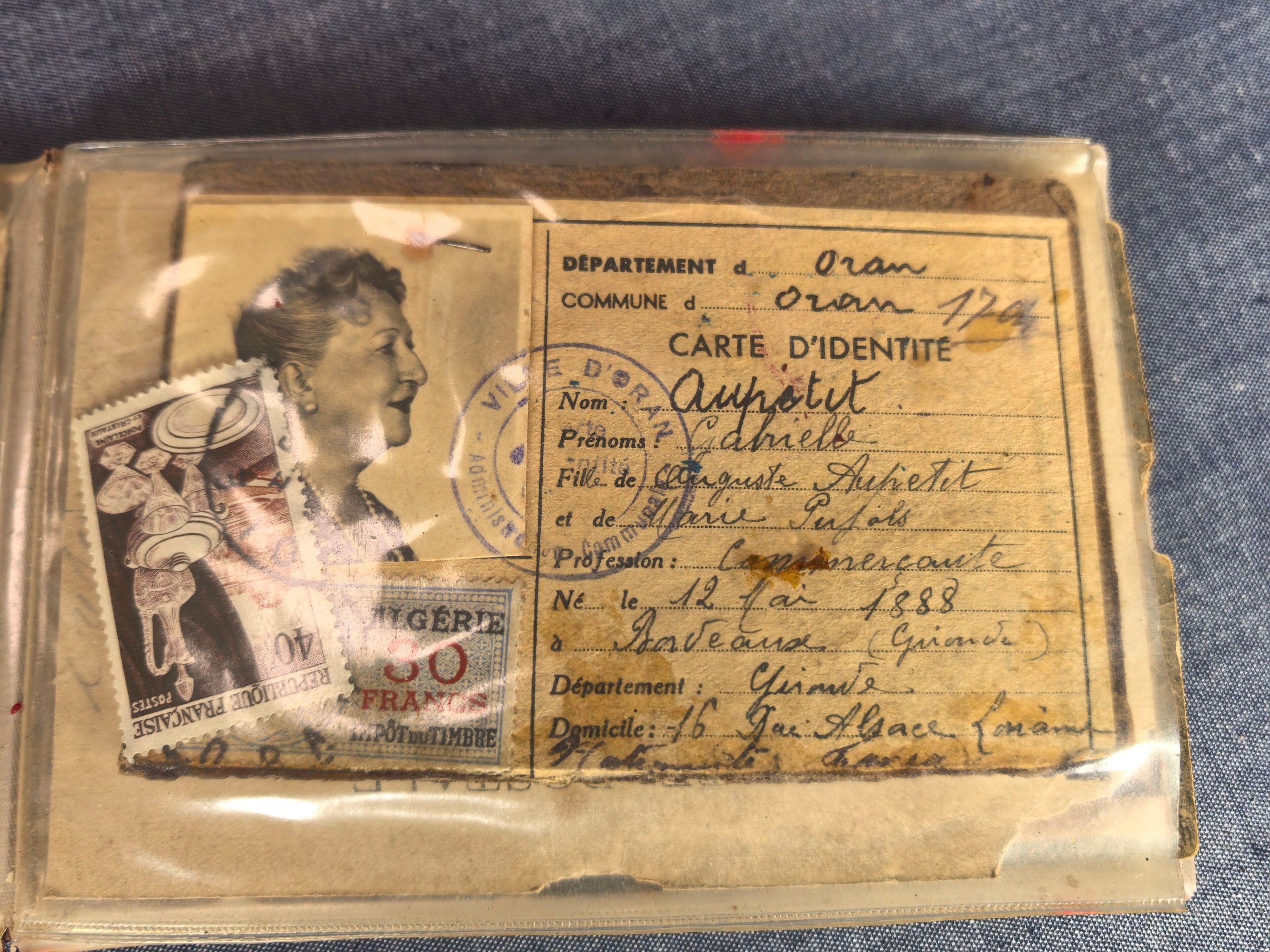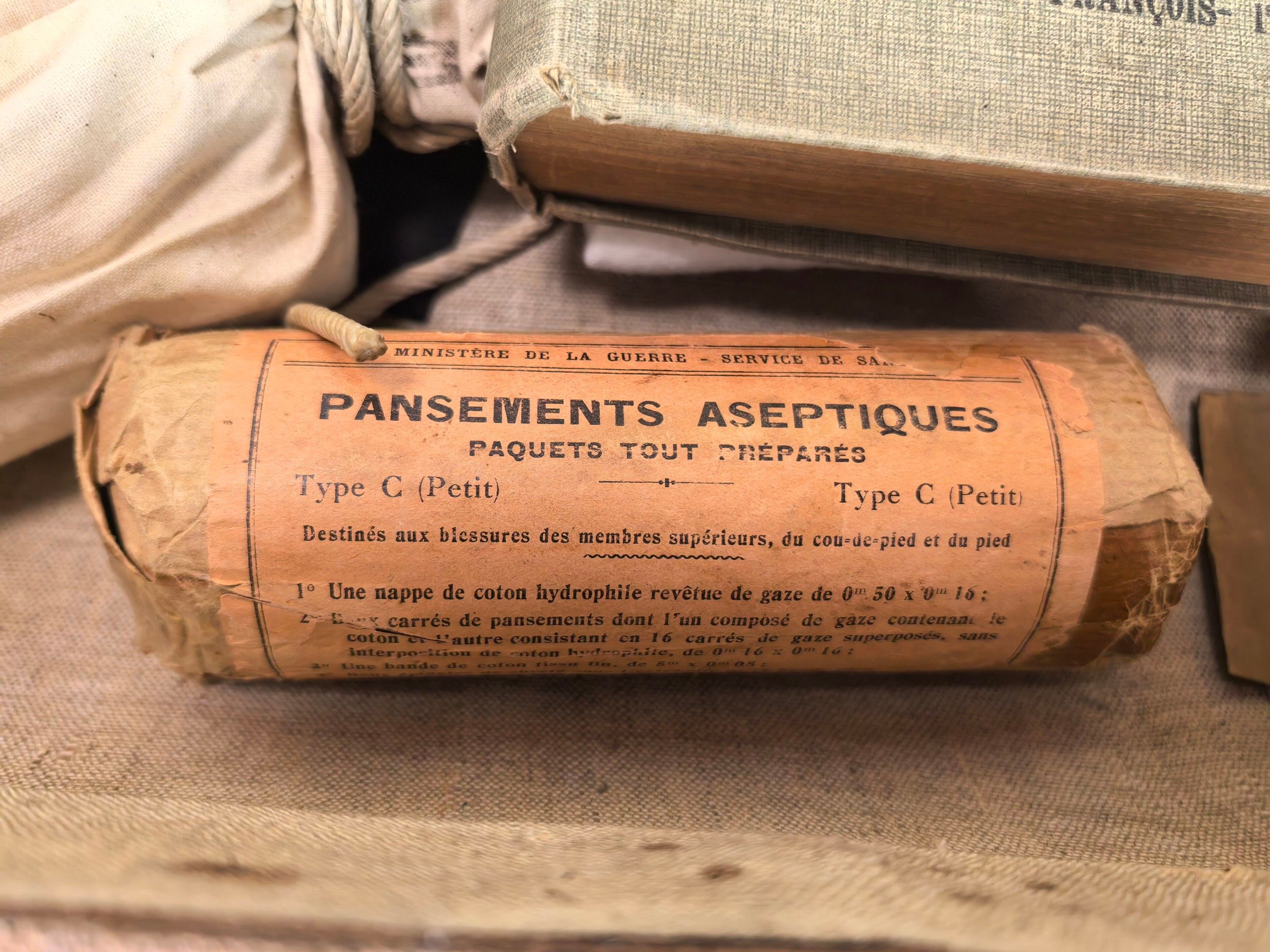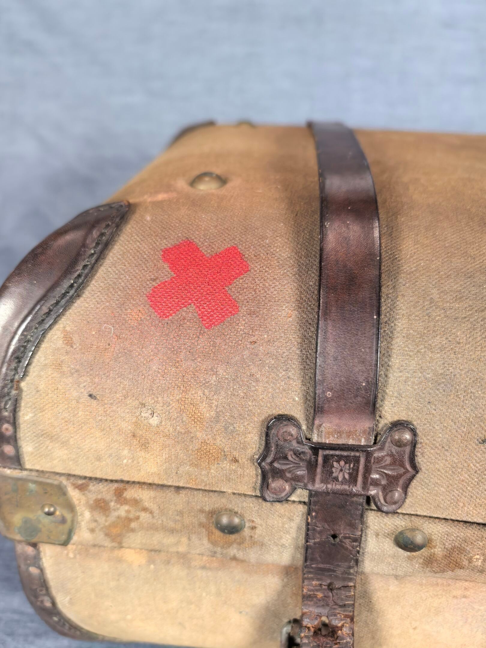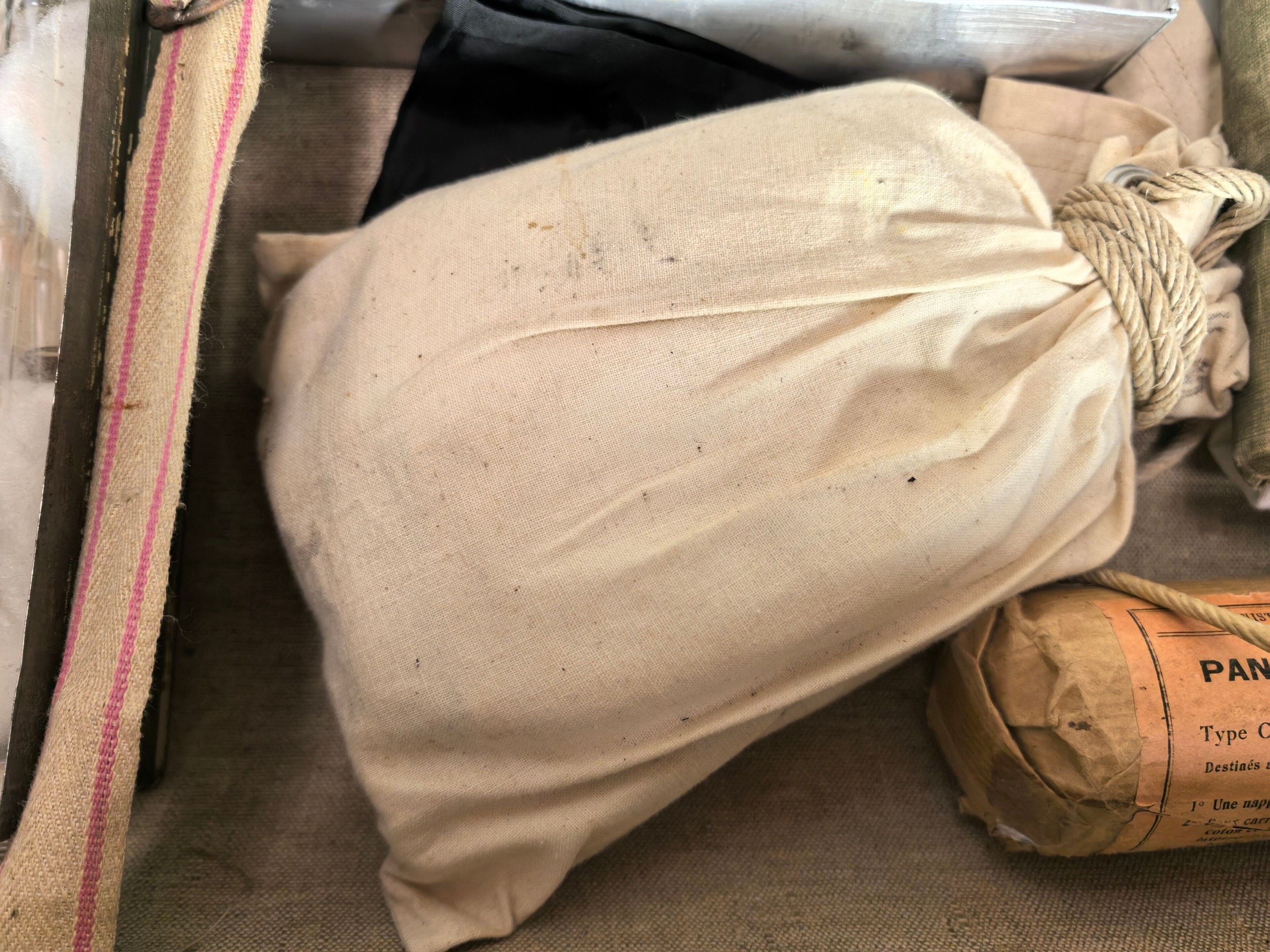 WW1 nurse's suitcase said to have belonged to Gabrielle Aupetit born 12 May 1888. Identity papers and photographs in a card holder. Suitcase containing the complete panoply of the wartime nurse, blanket, rosary, manual, whistle, watch, utensils, costume, soap, thread, dressings, belt, lead holder, syringes... 2 medals, including the Croix de Guerre and the veteran's medal.