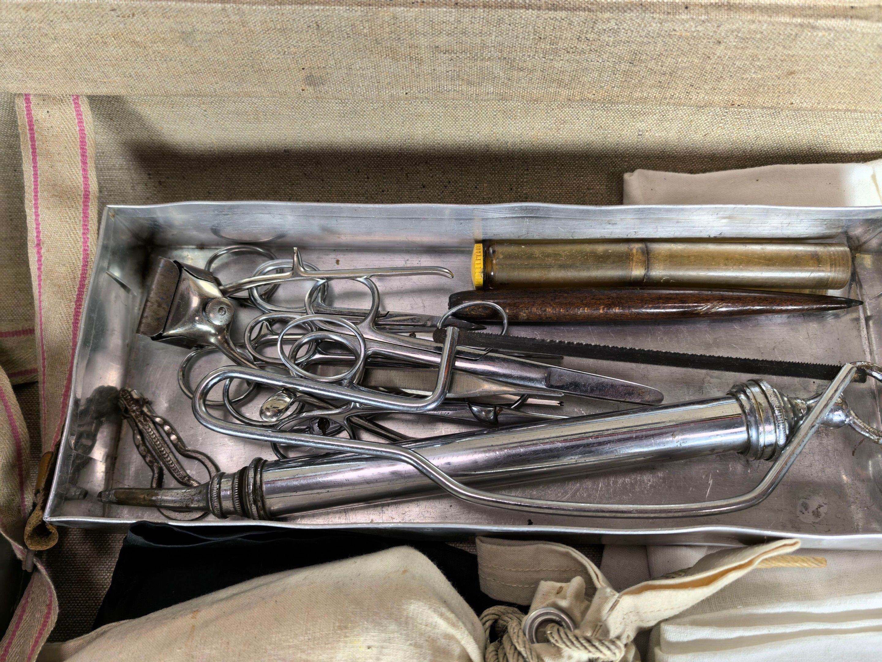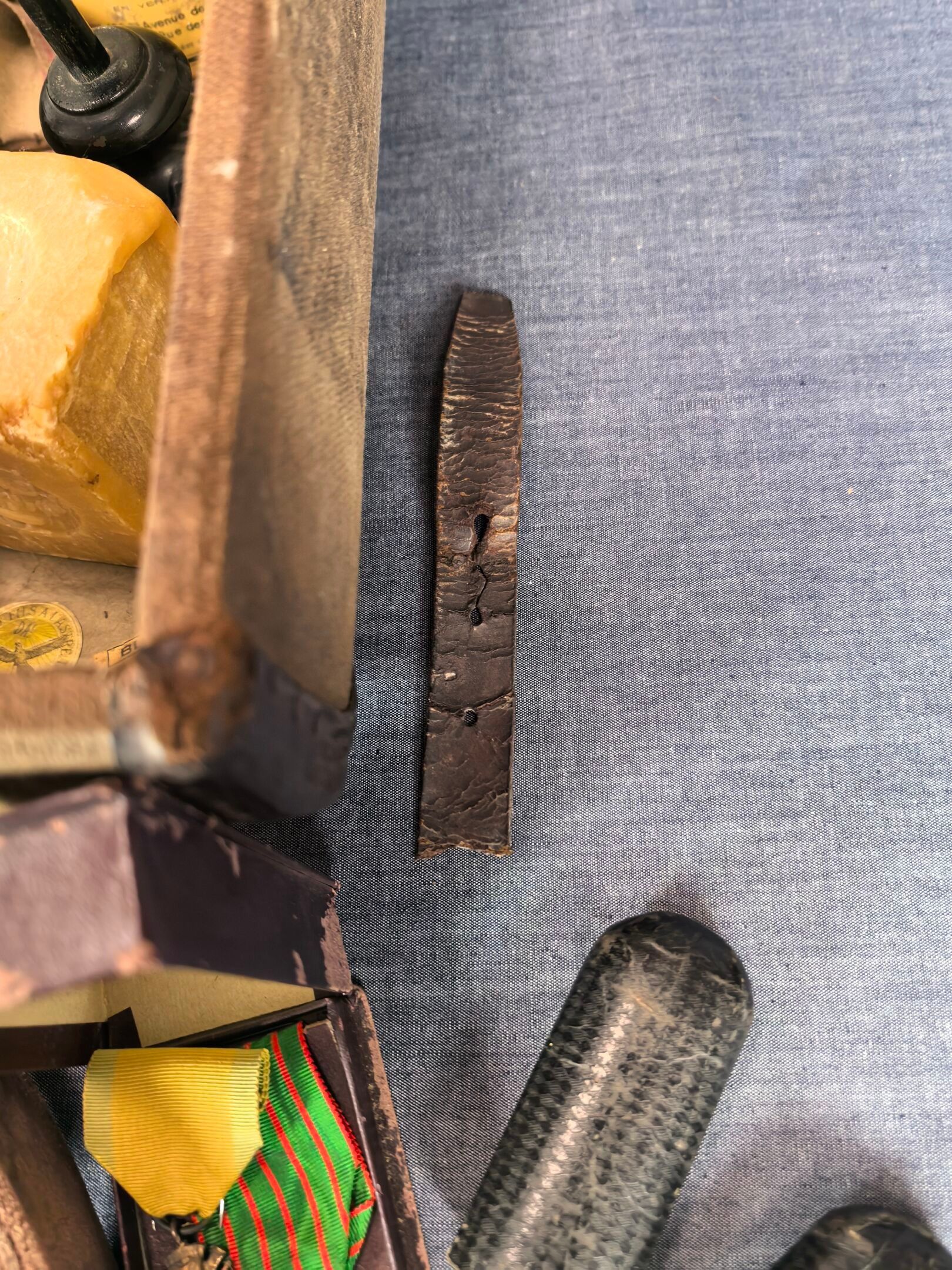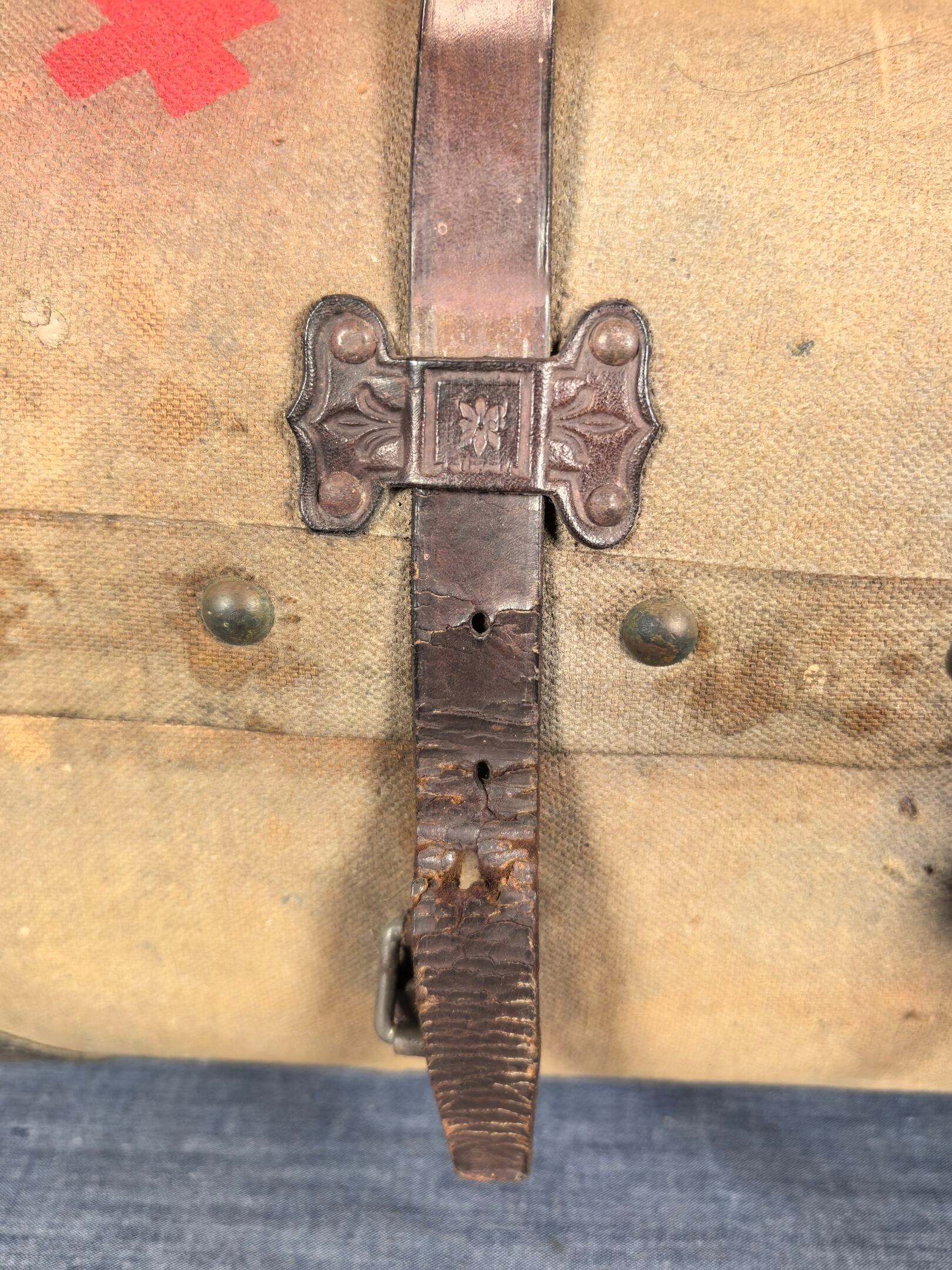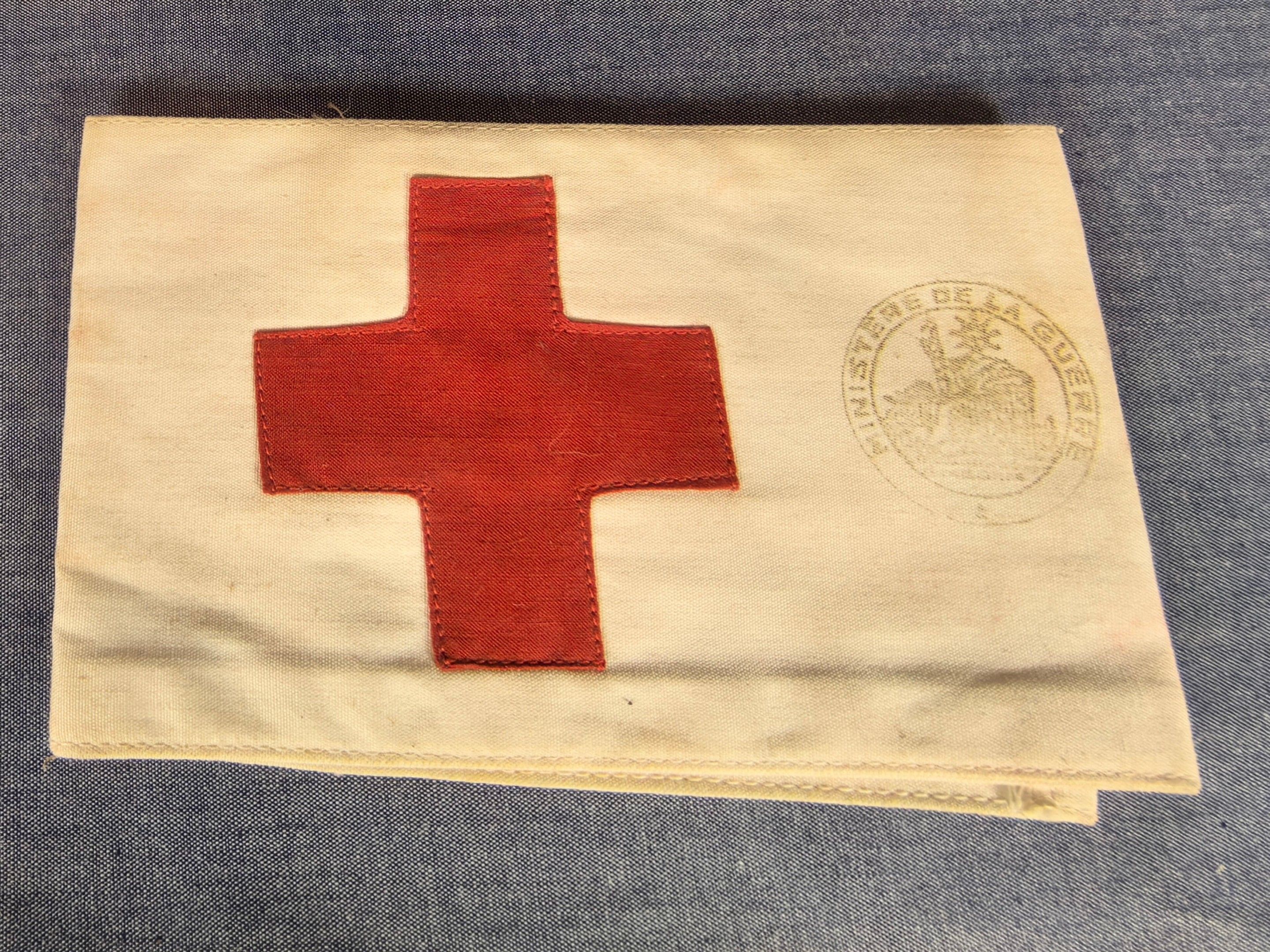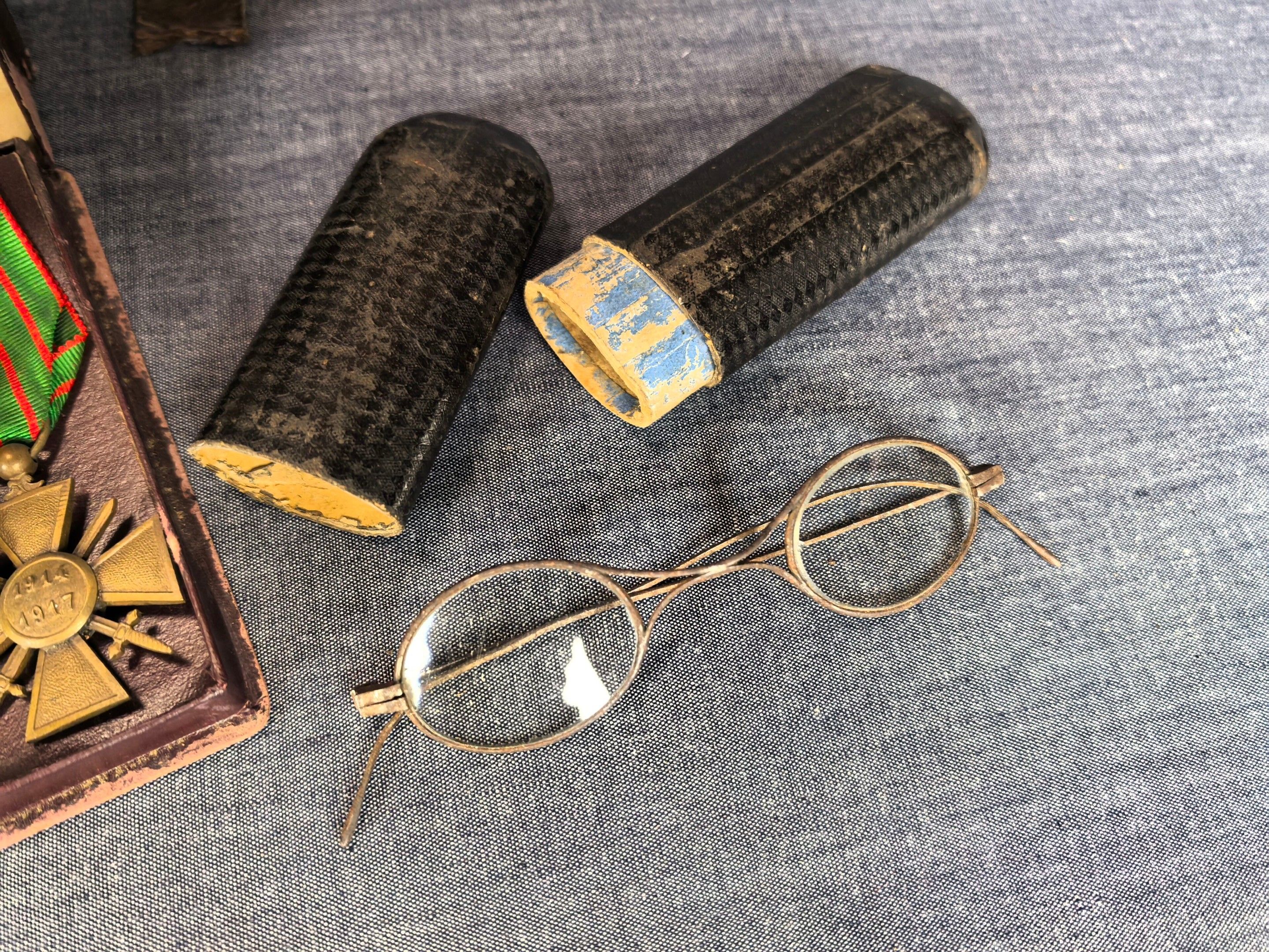 WW1 nurse's suitcase said to have belonged to Gabrielle Aupetit born 12 May 1888. Identity papers and photographs in a card holder. Suitcase containing the complete panoply of the wartime nurse, blanket, rosary, manual, whistle, watch, utensils, costume, soap, thread, dressings, belt, lead holder, syringes... 2 medals, including the Croix de Guerre and the veteran's medal.