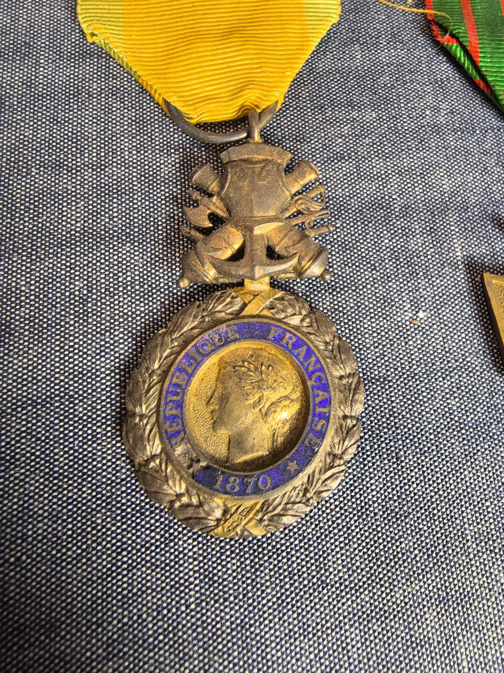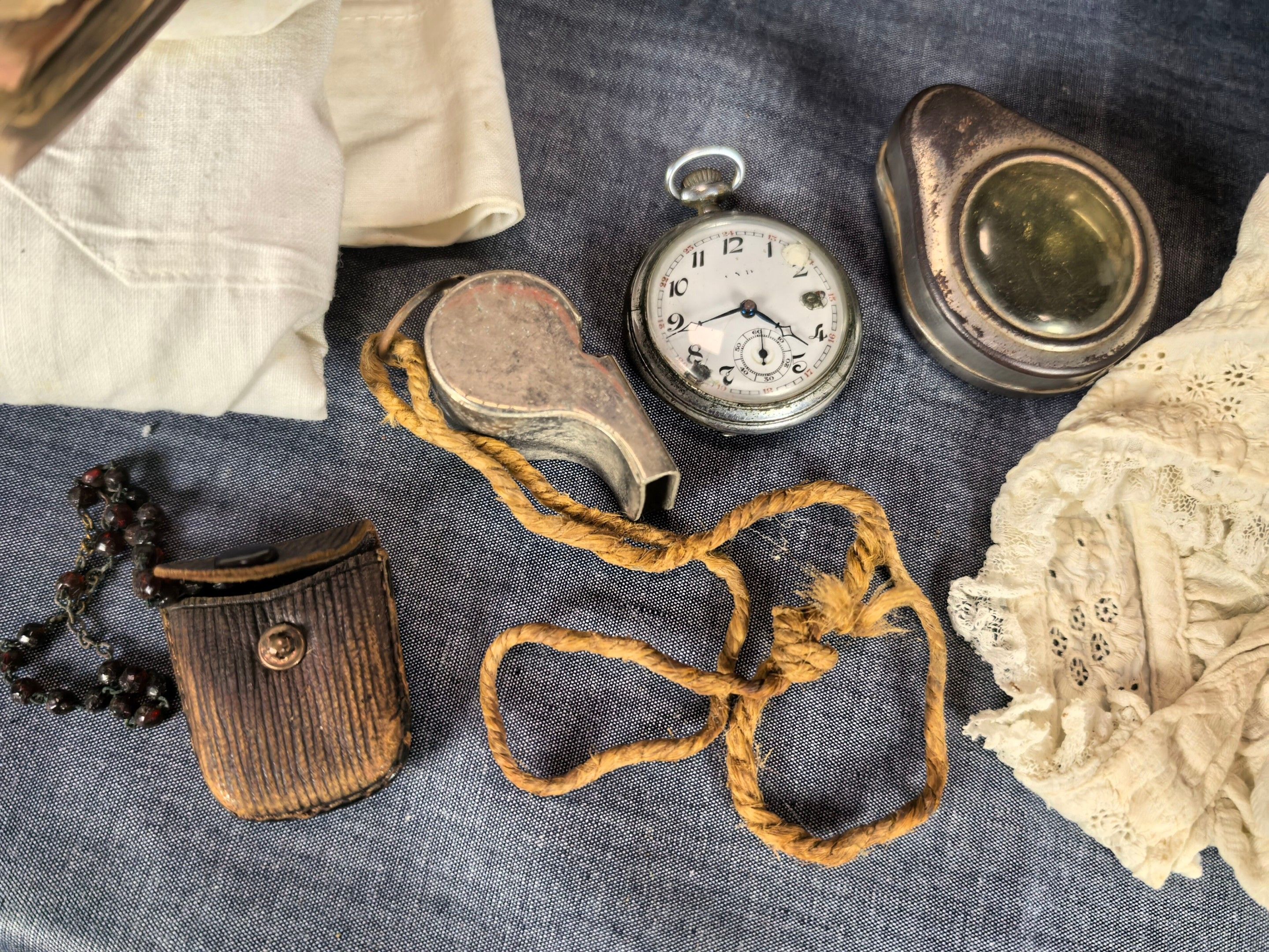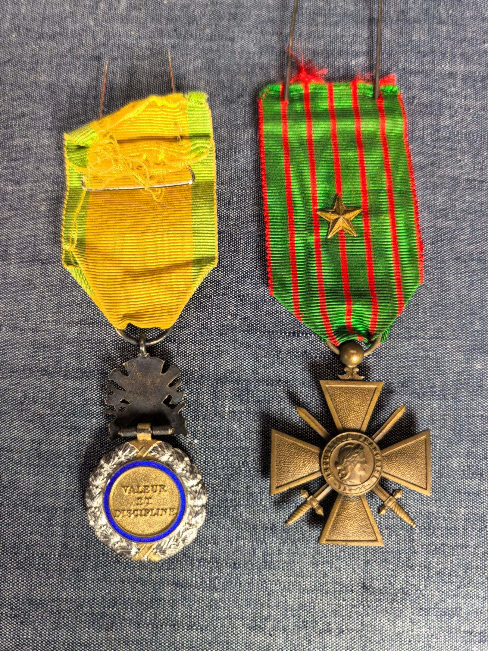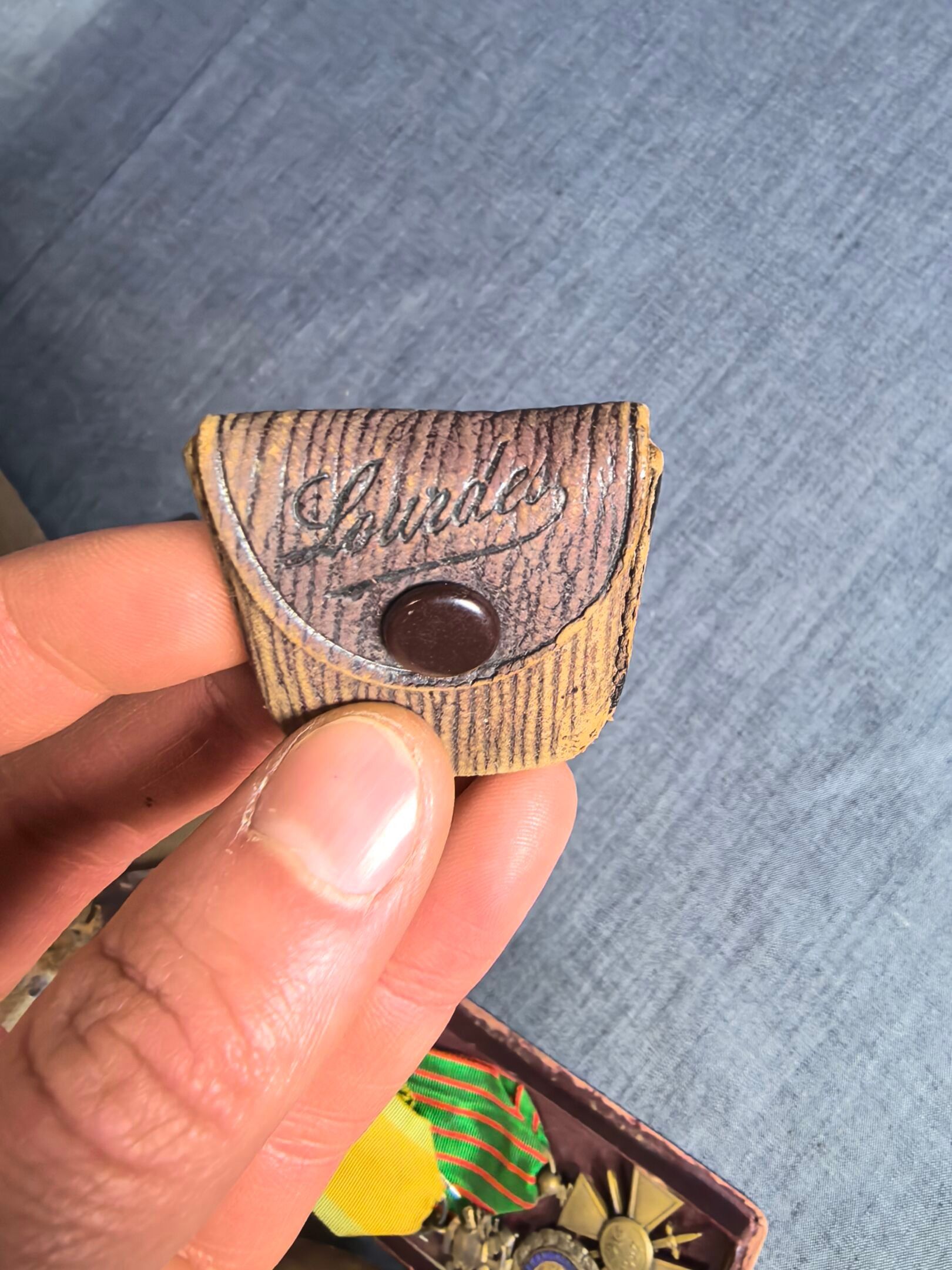 WW1 nurse's suitcase said to have belonged to Gabrielle Aupetit born 12 May 1888. Identity papers and photographs in a card holder. Suitcase containing the complete panoply of the wartime nurse, blanket, rosary, manual, whistle, watch, utensils, costume, soap, thread, dressings, belt, lead holder, syringes... 2 medals, including the Croix de Guerre and the veteran's medal.
