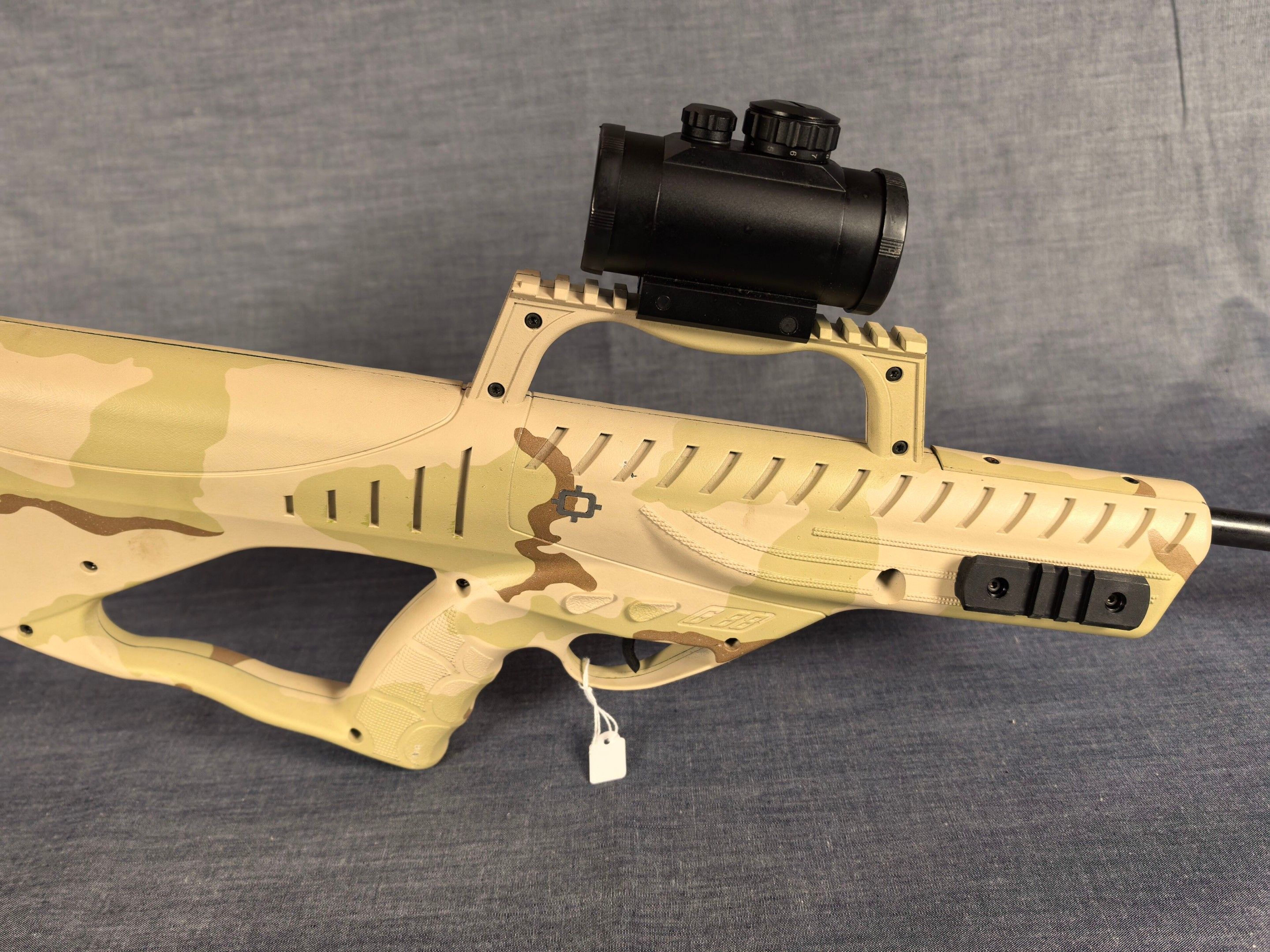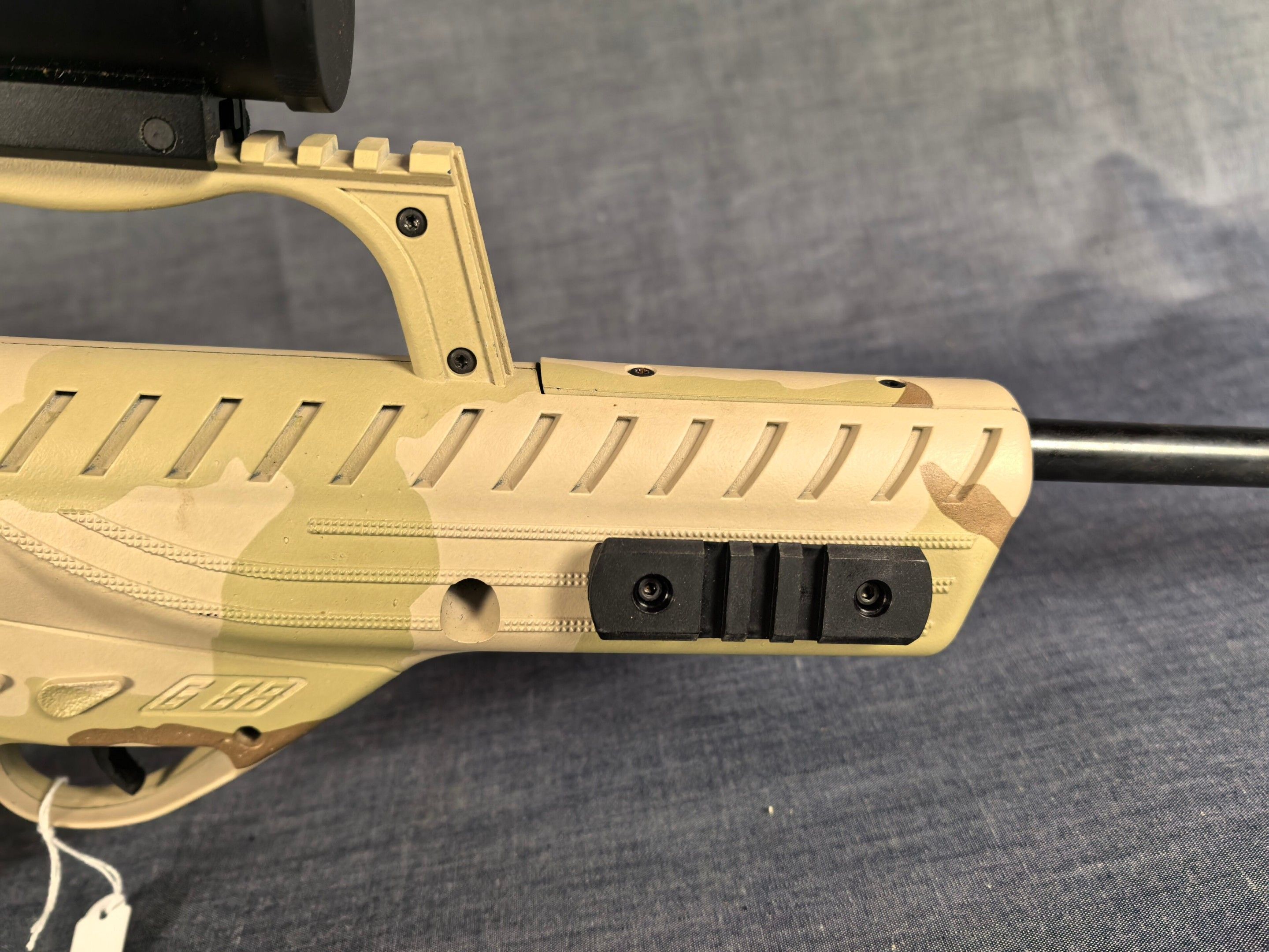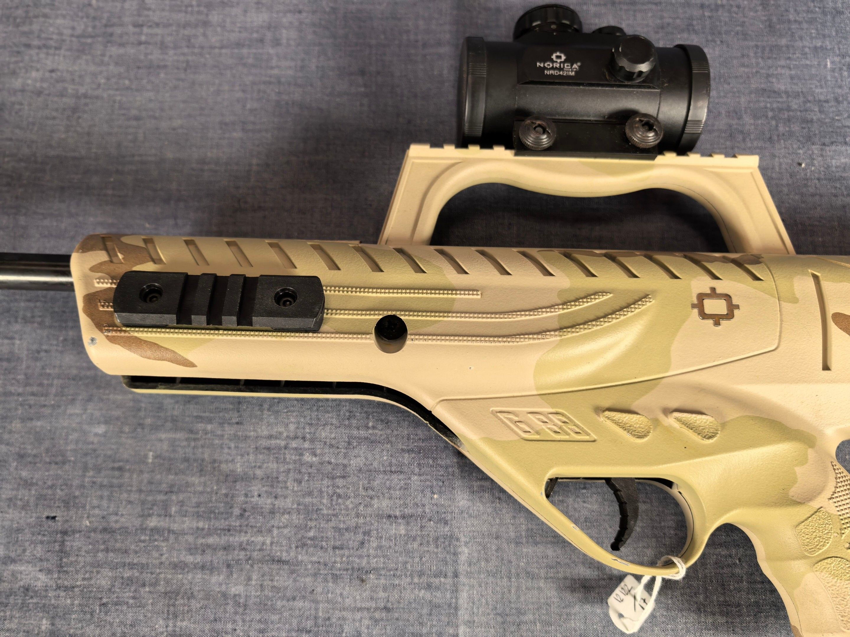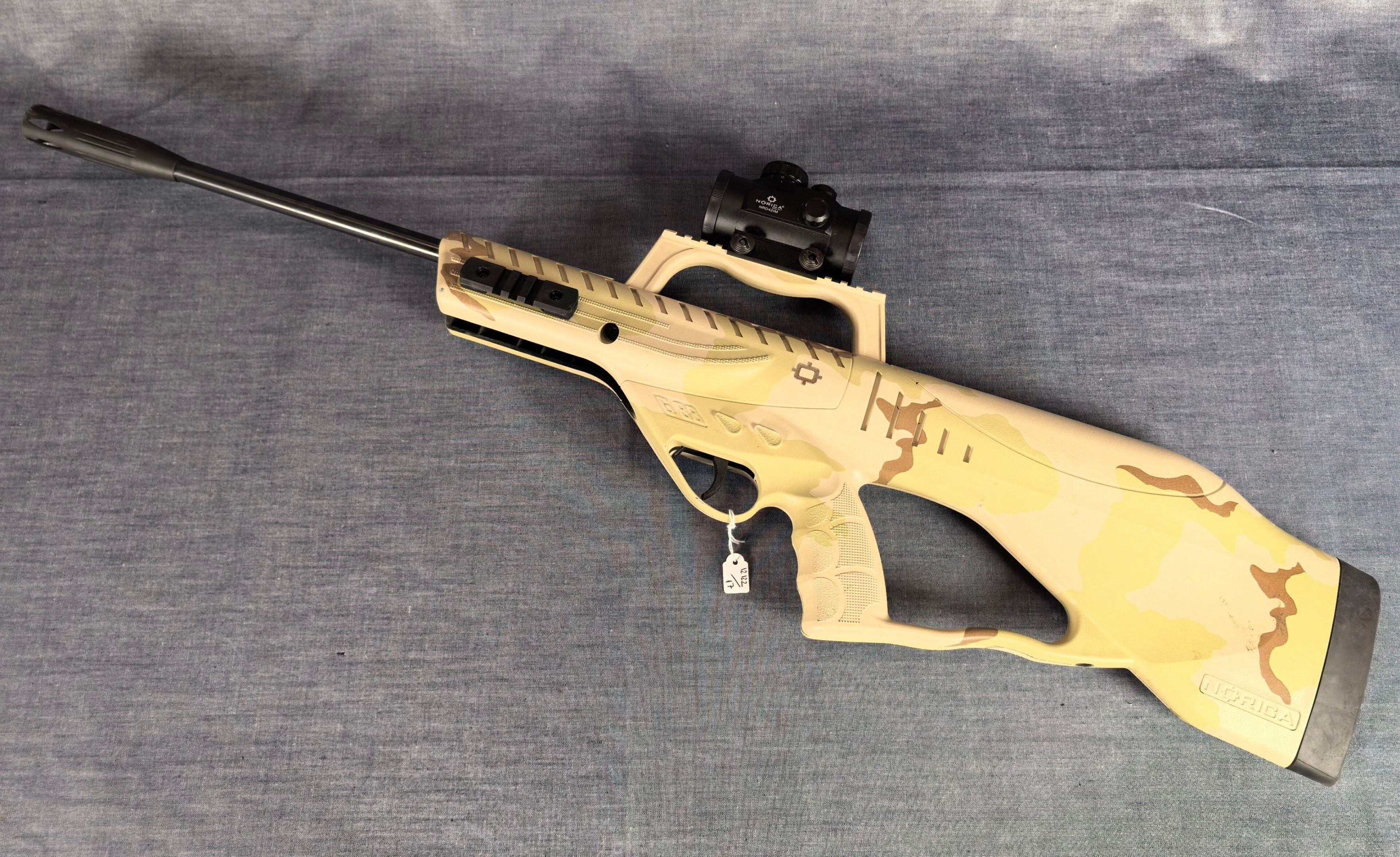 [Cat. D = +18 yrs] Norica Goliath 88 Desert Cal. 4.5mm rifle - 11 position red dot scope, good condition, retractable stock, automatic safety and adjustment, spring loaded, scope mount, 22mm rail - Grooved barrel, synthetic desert stock - Shock resistant butt plate - Ambidextrous cheek stock.