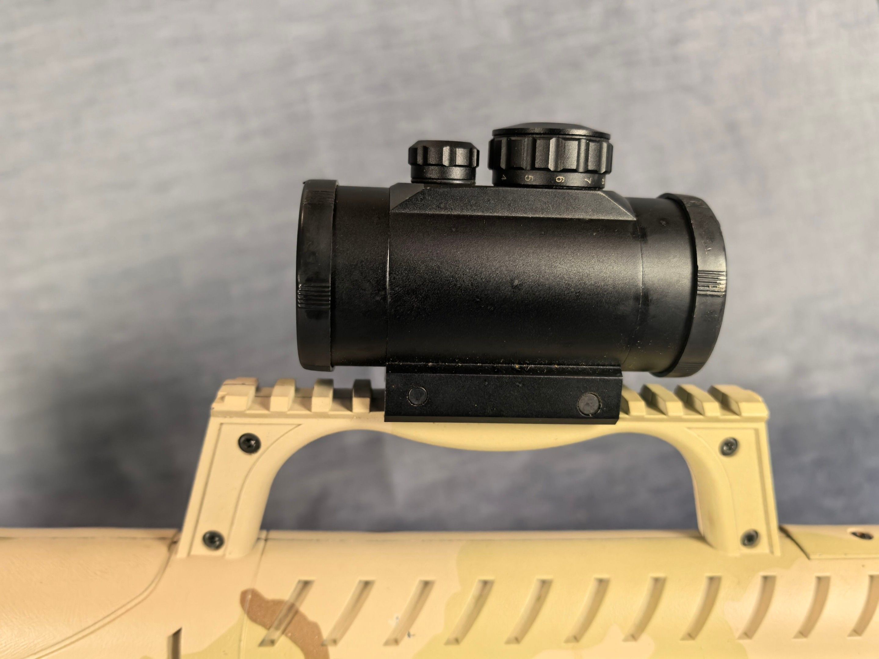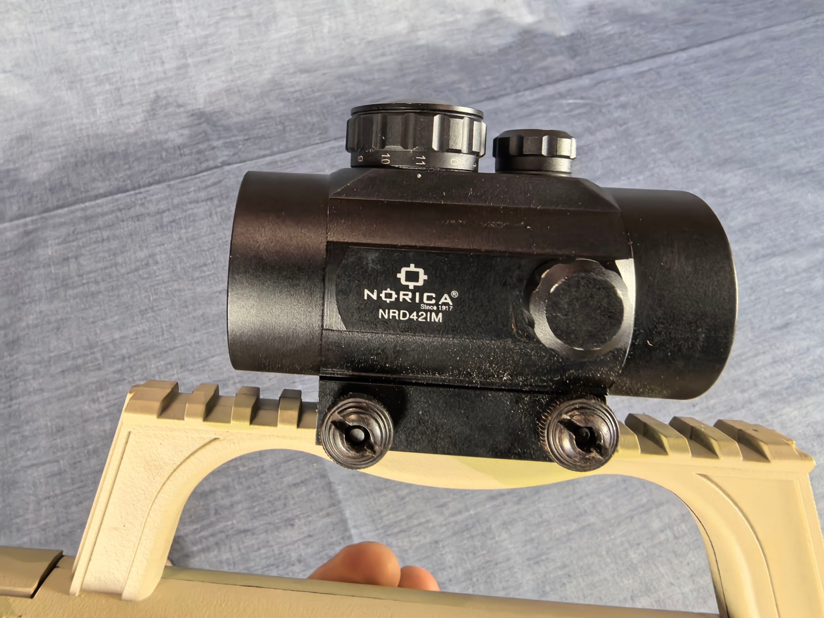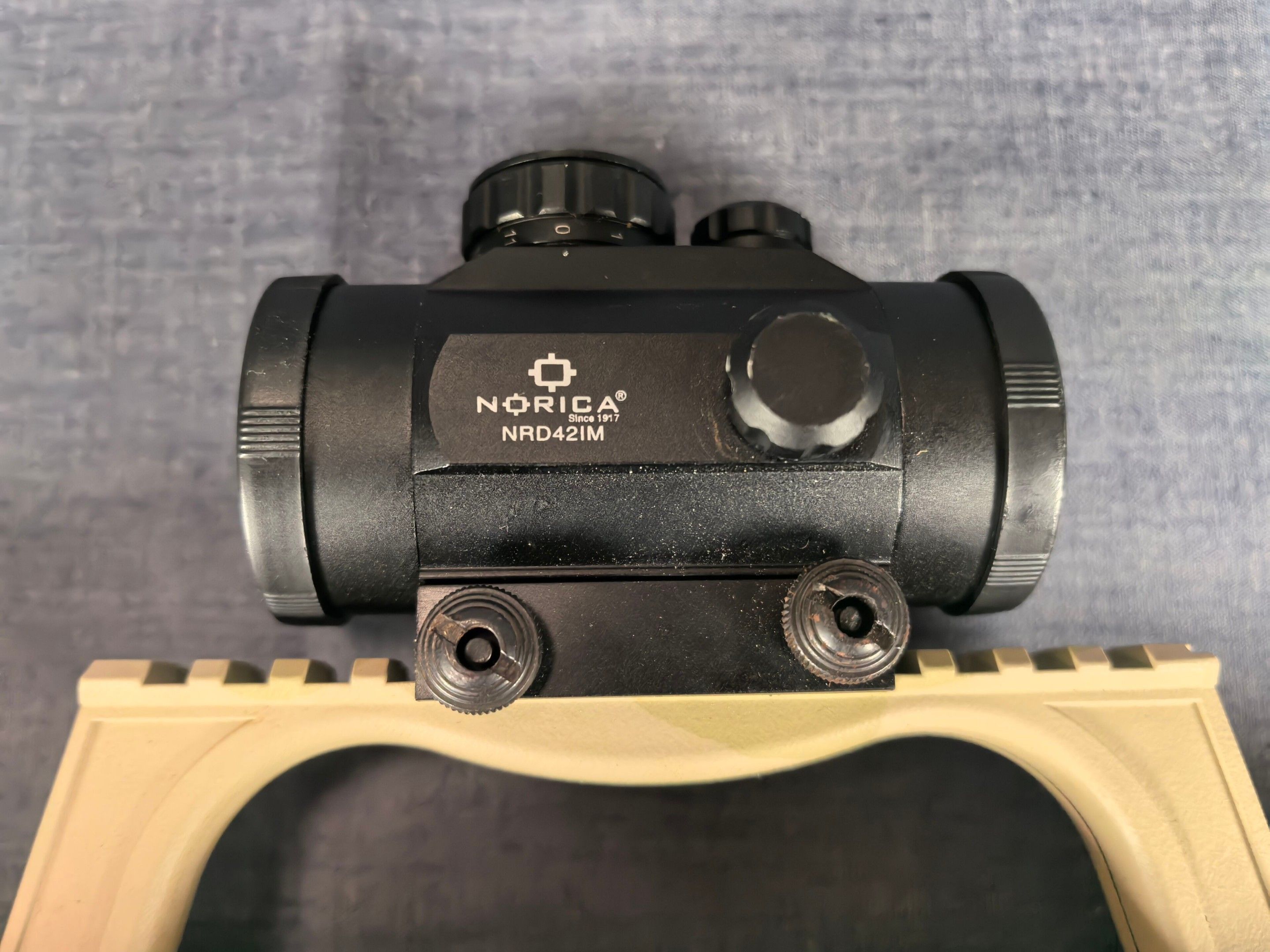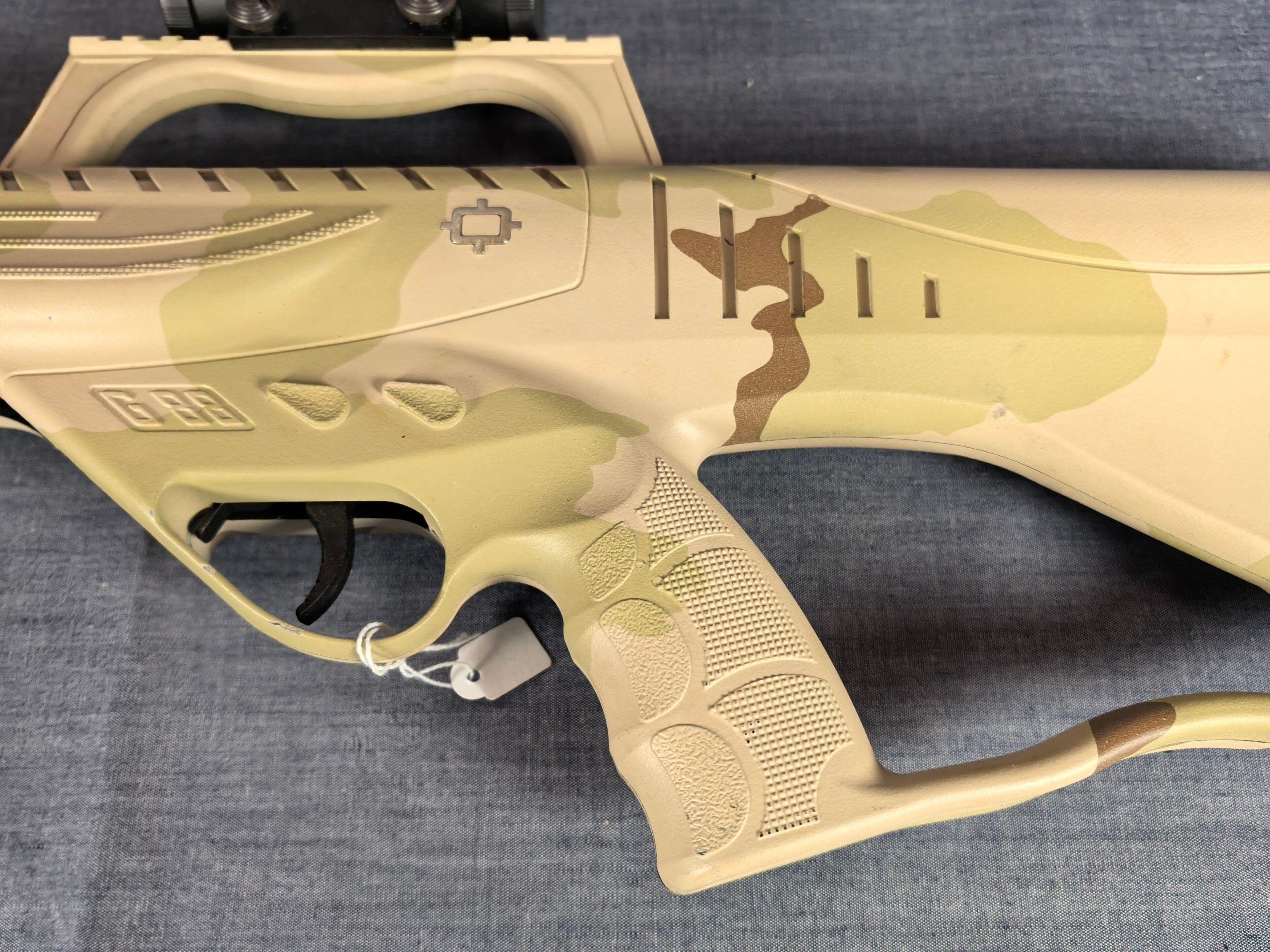 [Cat. D = +18 yrs] Norica Goliath 88 Desert Cal. 4.5mm rifle - 11 position red dot scope, good condition, retractable stock, automatic safety and adjustment, spring loaded, scope mount, 22mm rail - Grooved barrel, synthetic desert stock - Shock resistant butt plate - Ambidextrous cheek stock.
