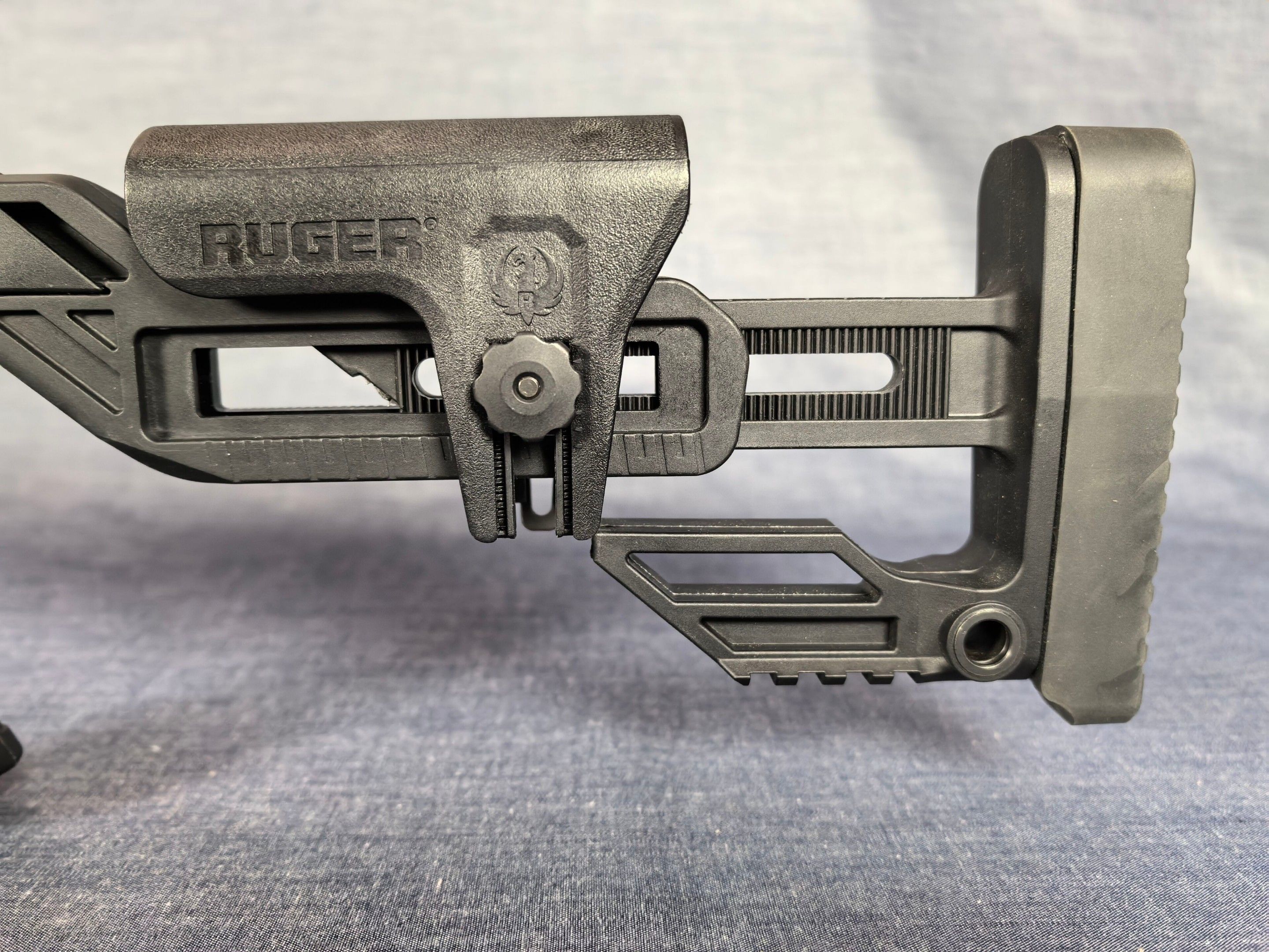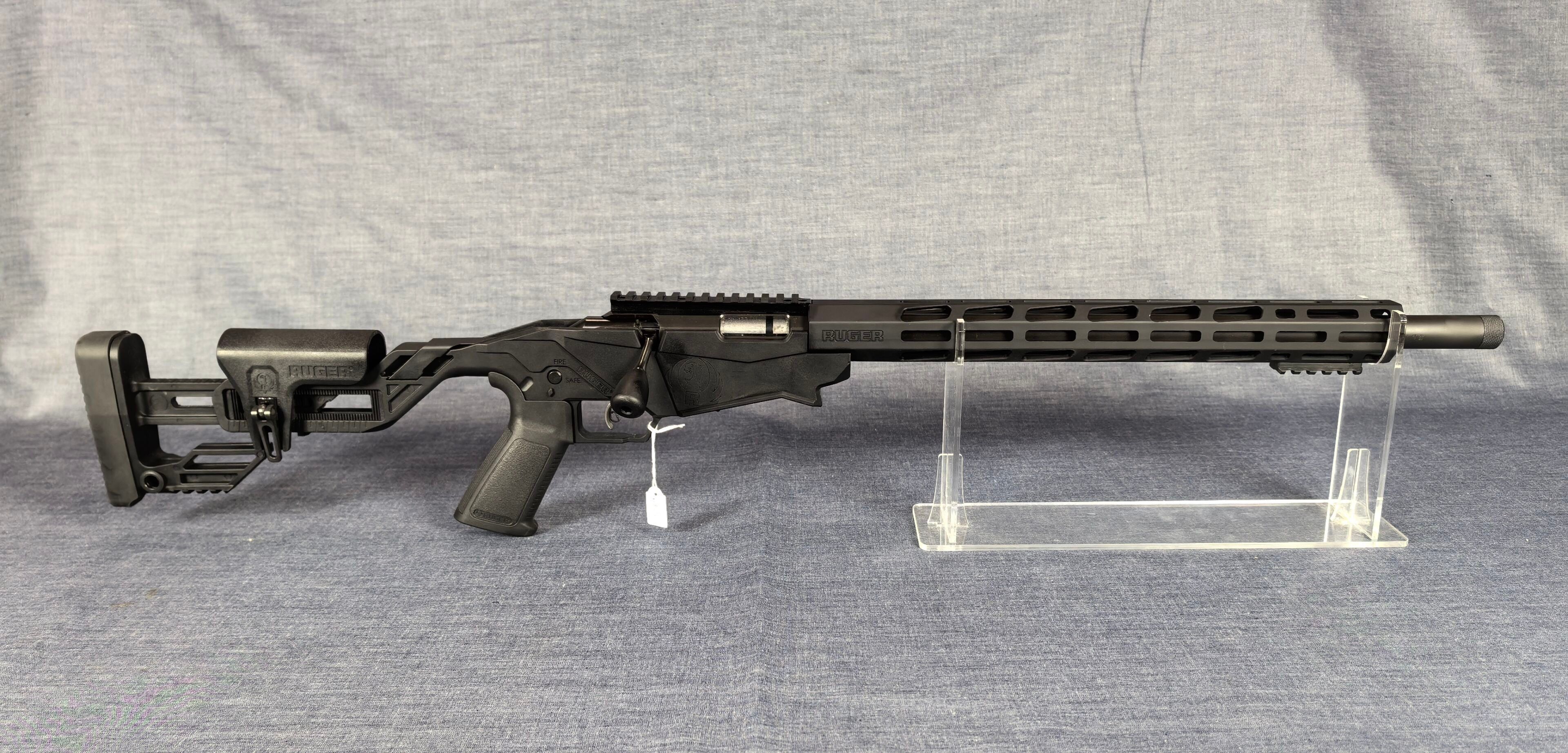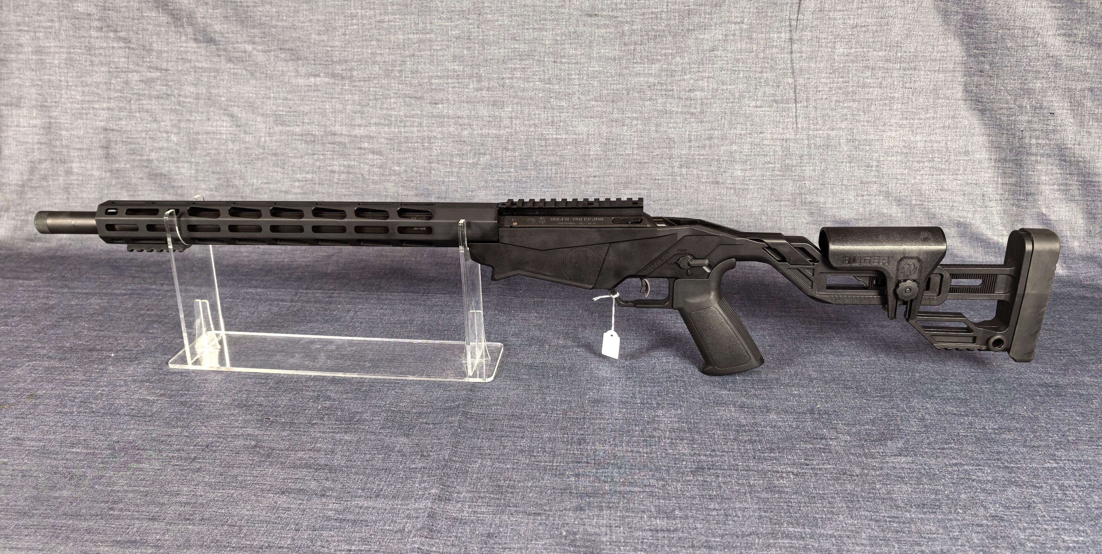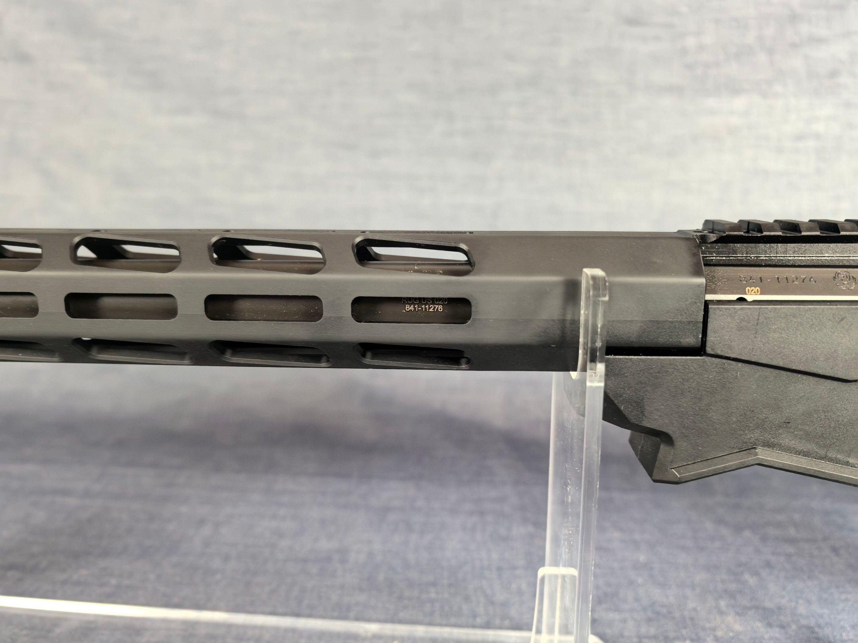[RUGER Model: PRECISION RIMFIR Cal.22 lr, 46cm heavy barrel, 1:16" rifling pitch, 1/2 X 28 silencer thread. AR-15 Tactical type stock and grip, ergonomic black, ultra light, adjustable in length and adjustable busk. Picatinny rail for scope mounting, Oversized breech lever, M-LOK MAGPUL lightweight handguard.