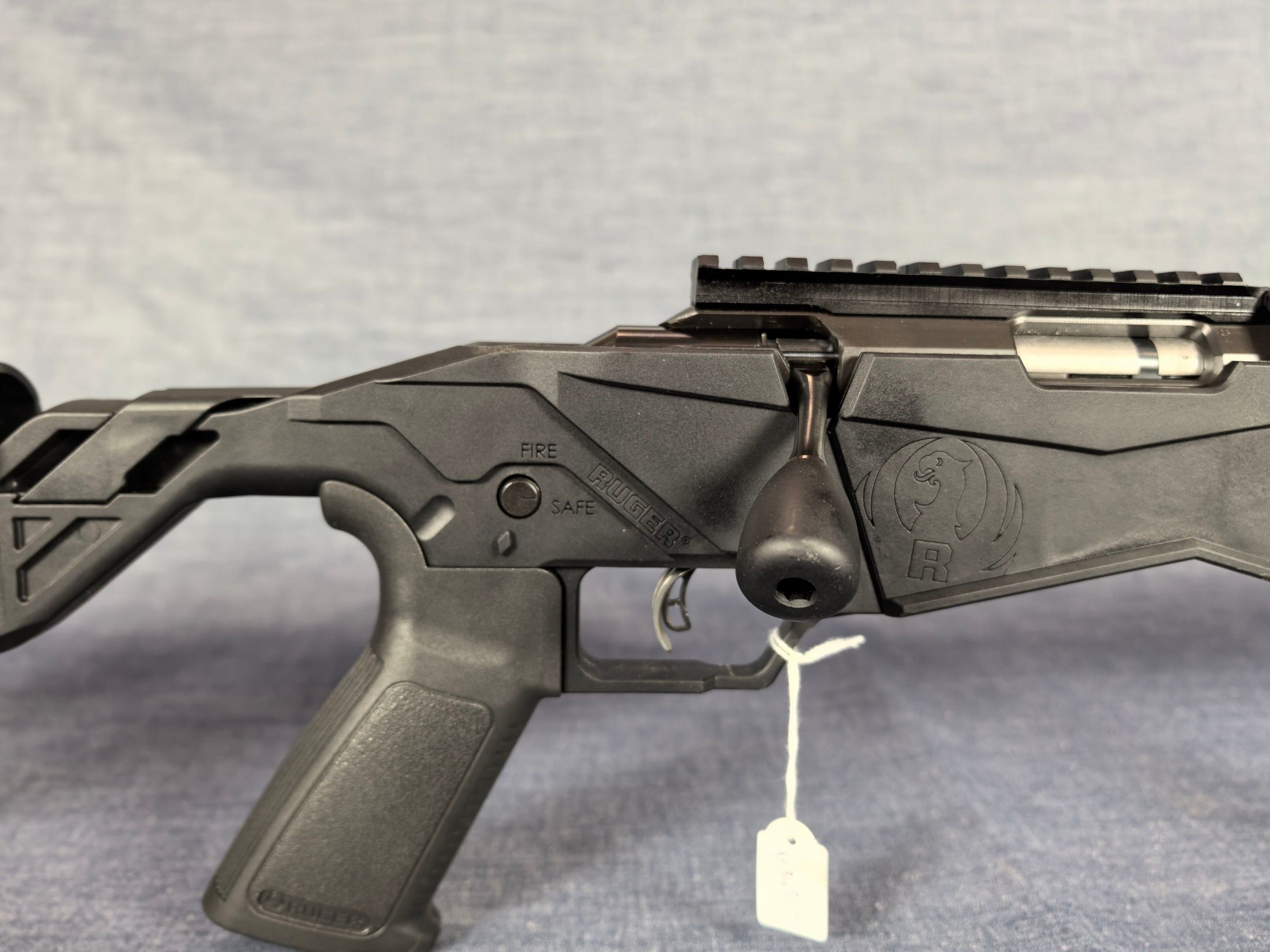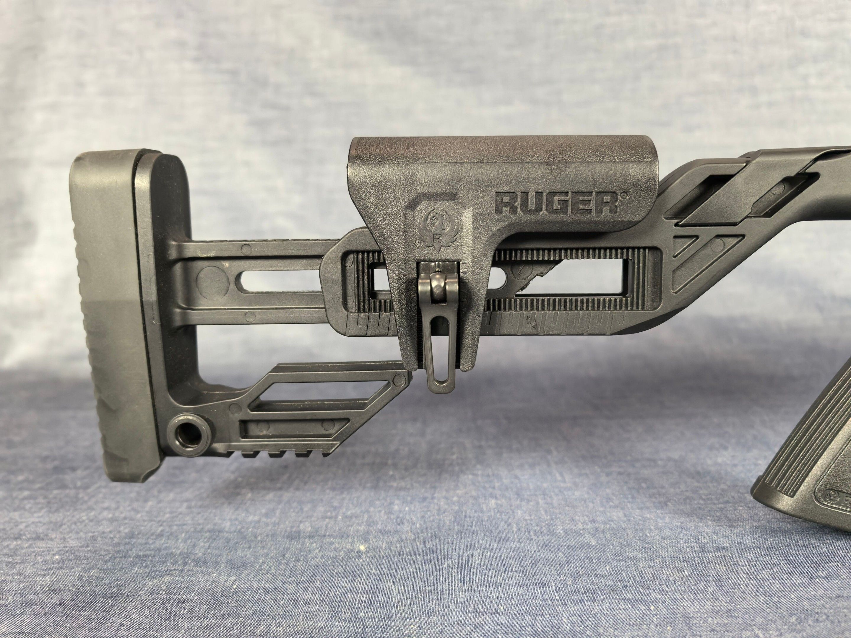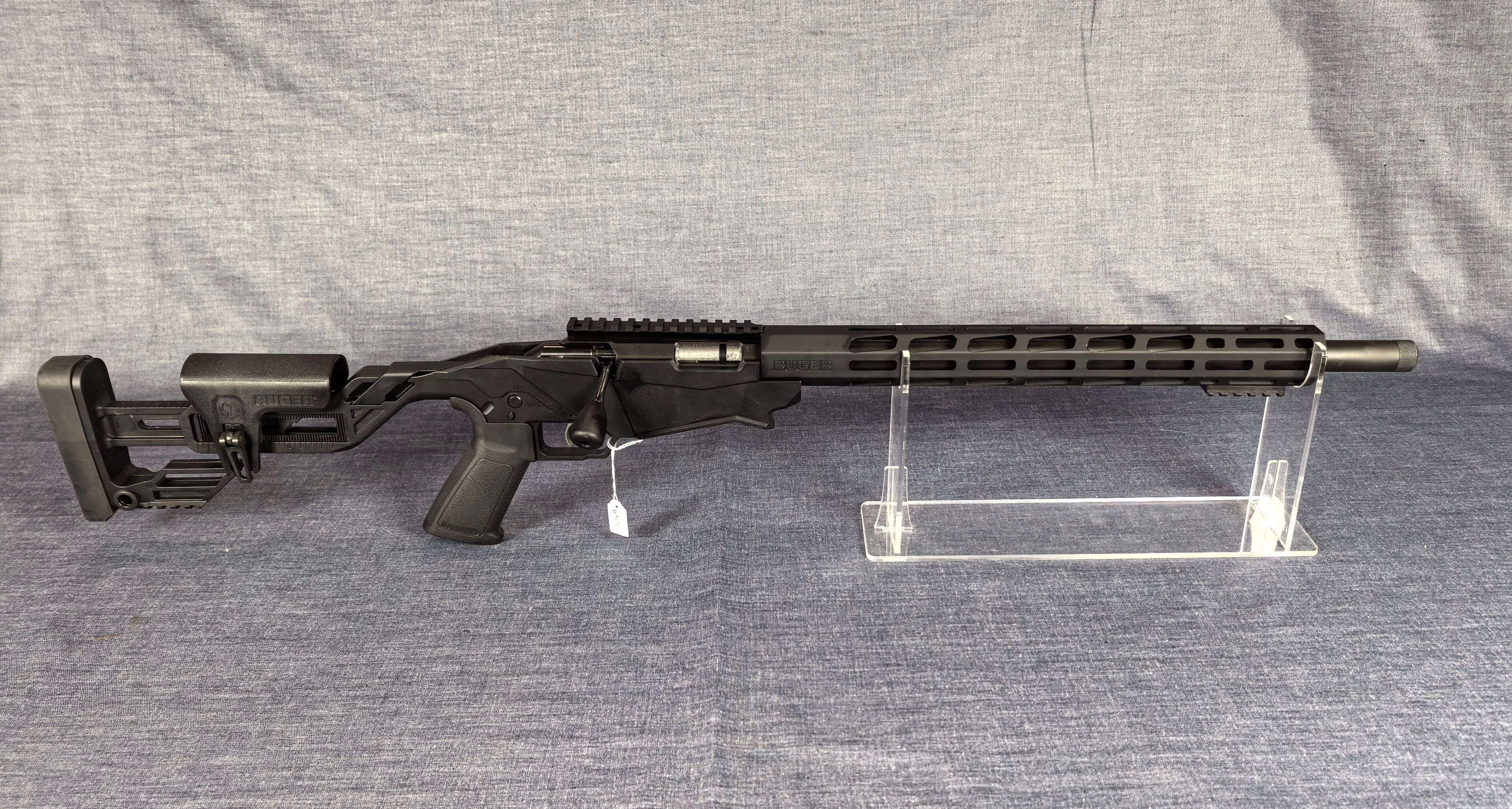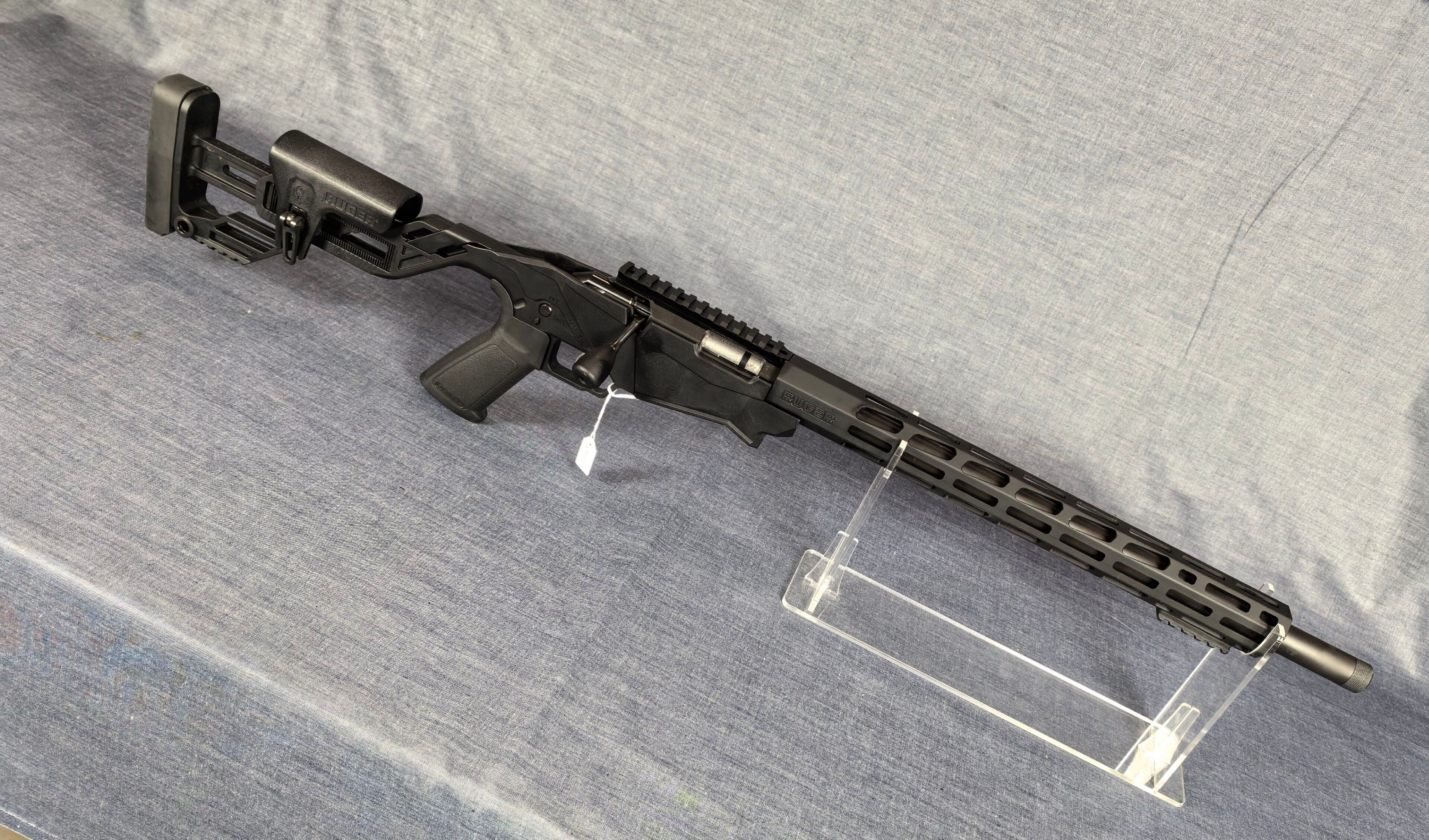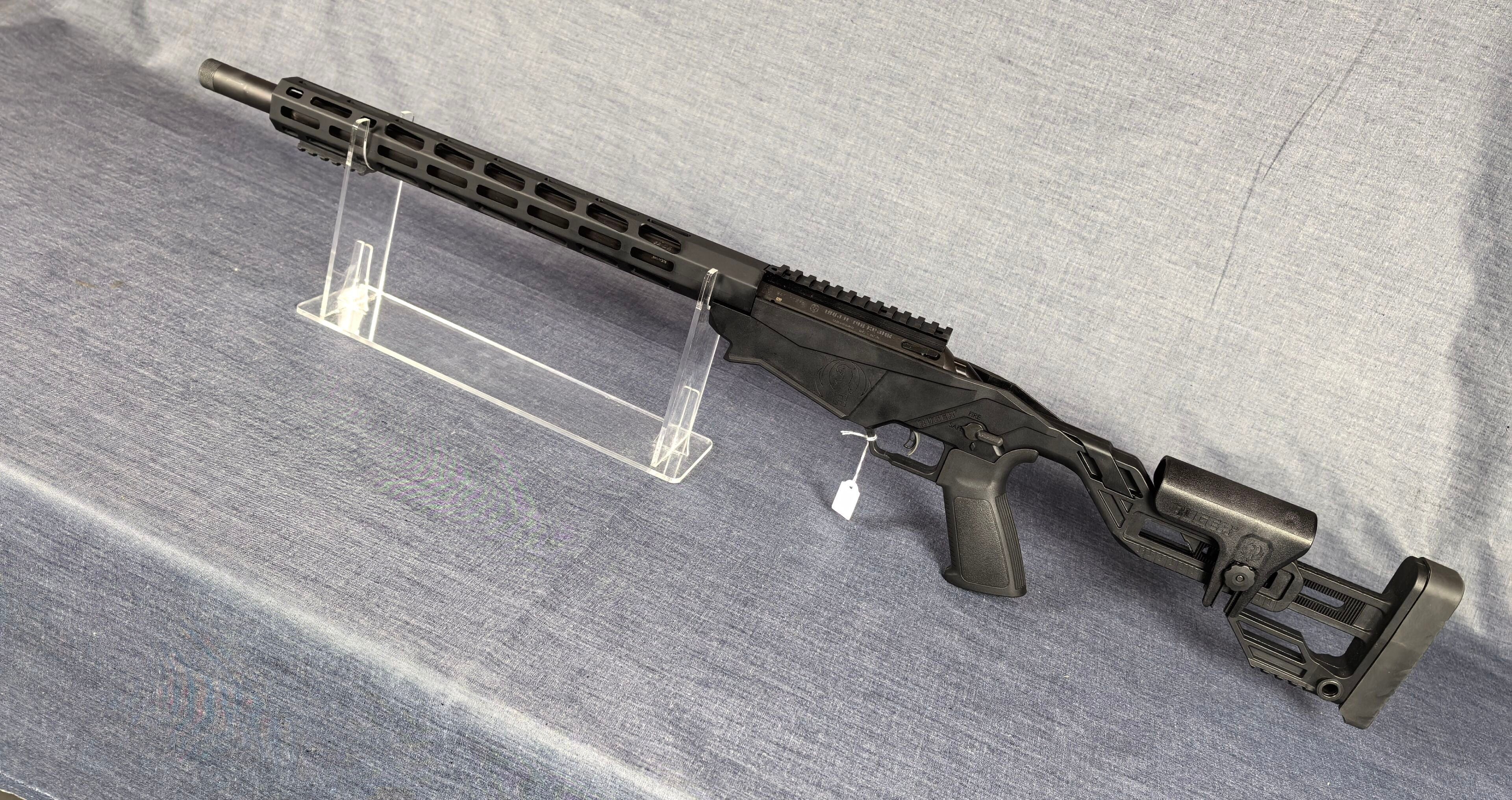 [RUGER Model: PRECISION RIMFIR Cal.22 lr, 46cm heavy barrel, 1:16" rifling pitch, 1/2 X 28 silencer thread. AR-15 Tactical type stock and grip, ergonomic black, ultra light, adjustable in length and adjustable busk. Picatinny rail for scope mounting, Oversized breech lever, M-LOK MAGPUL lightweight handguard.