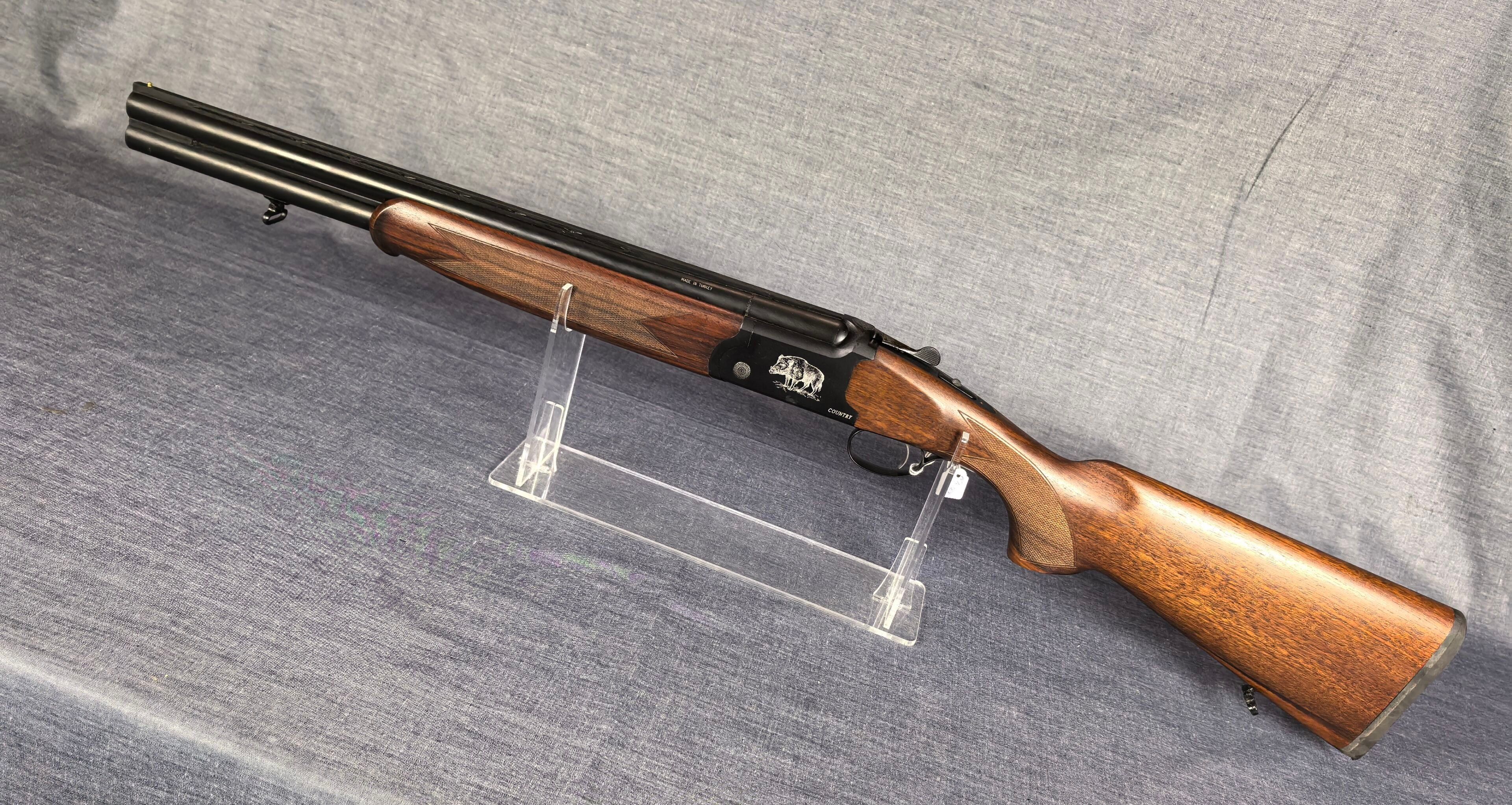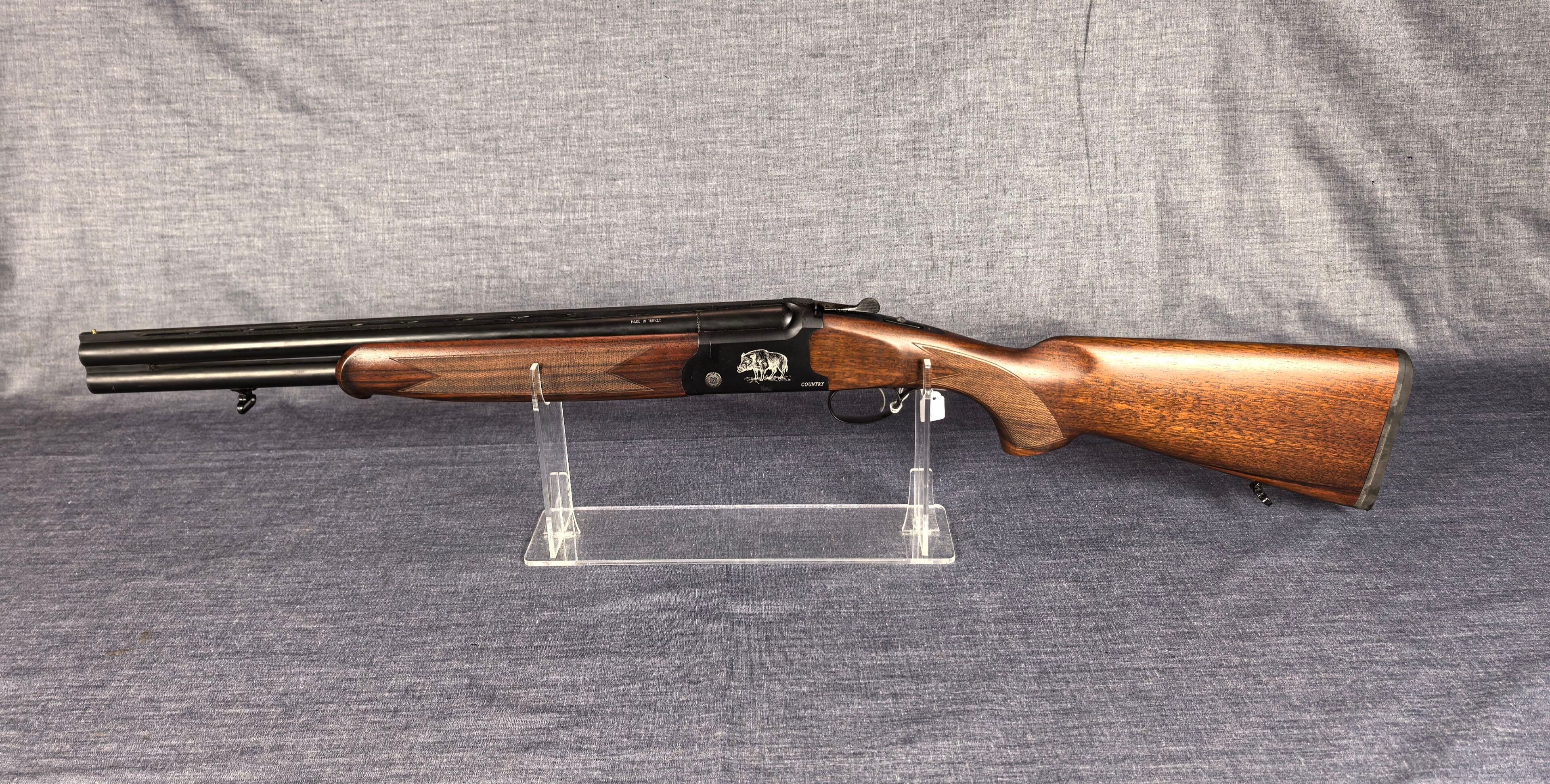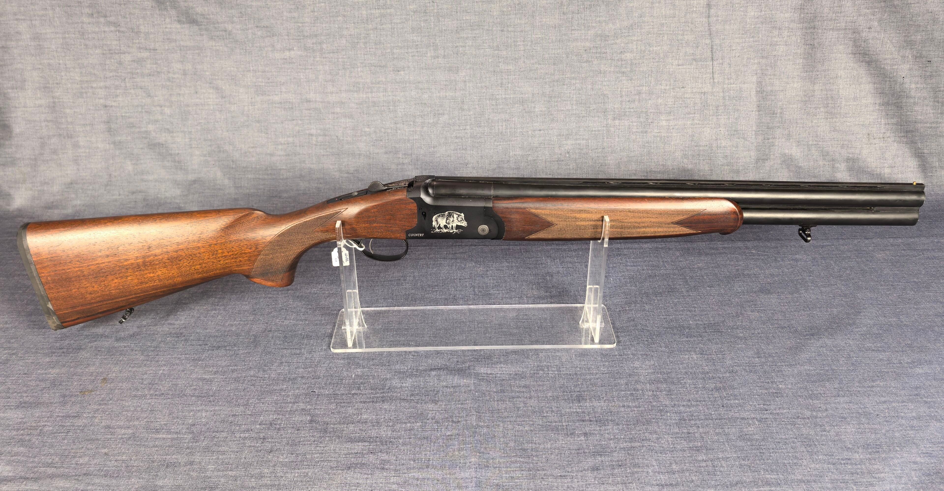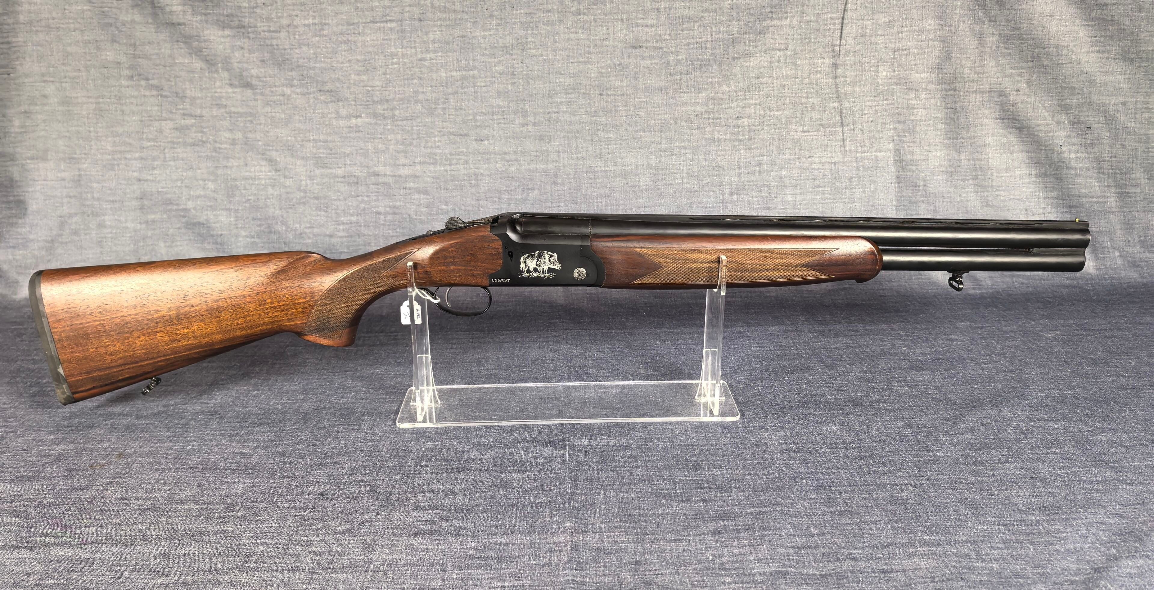 [Cat. C = Shooting/Hunting Licence] YILDIZ SLUG COUNTRY SUPERPOSED RIFLE / CAL. 12/76 - BARS 51 CM Very good condition mirrored barrels Ventilated band front sight Rocker / Rifle frame Alloy, black tempered with wild boar engraving Extractor Mono selective trigger Stock type Half pistol in Walnut N°113840 . N°138848. Category C -