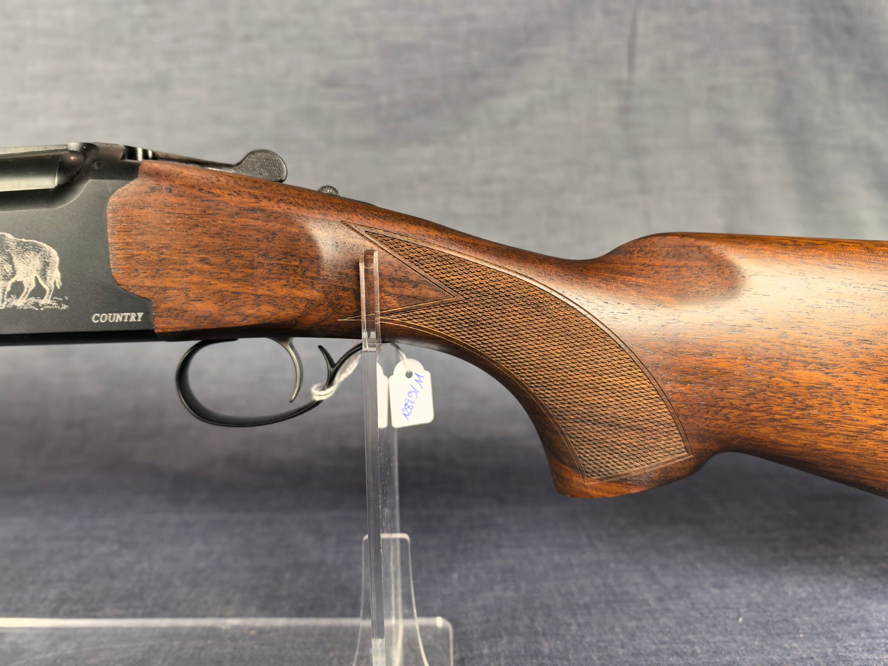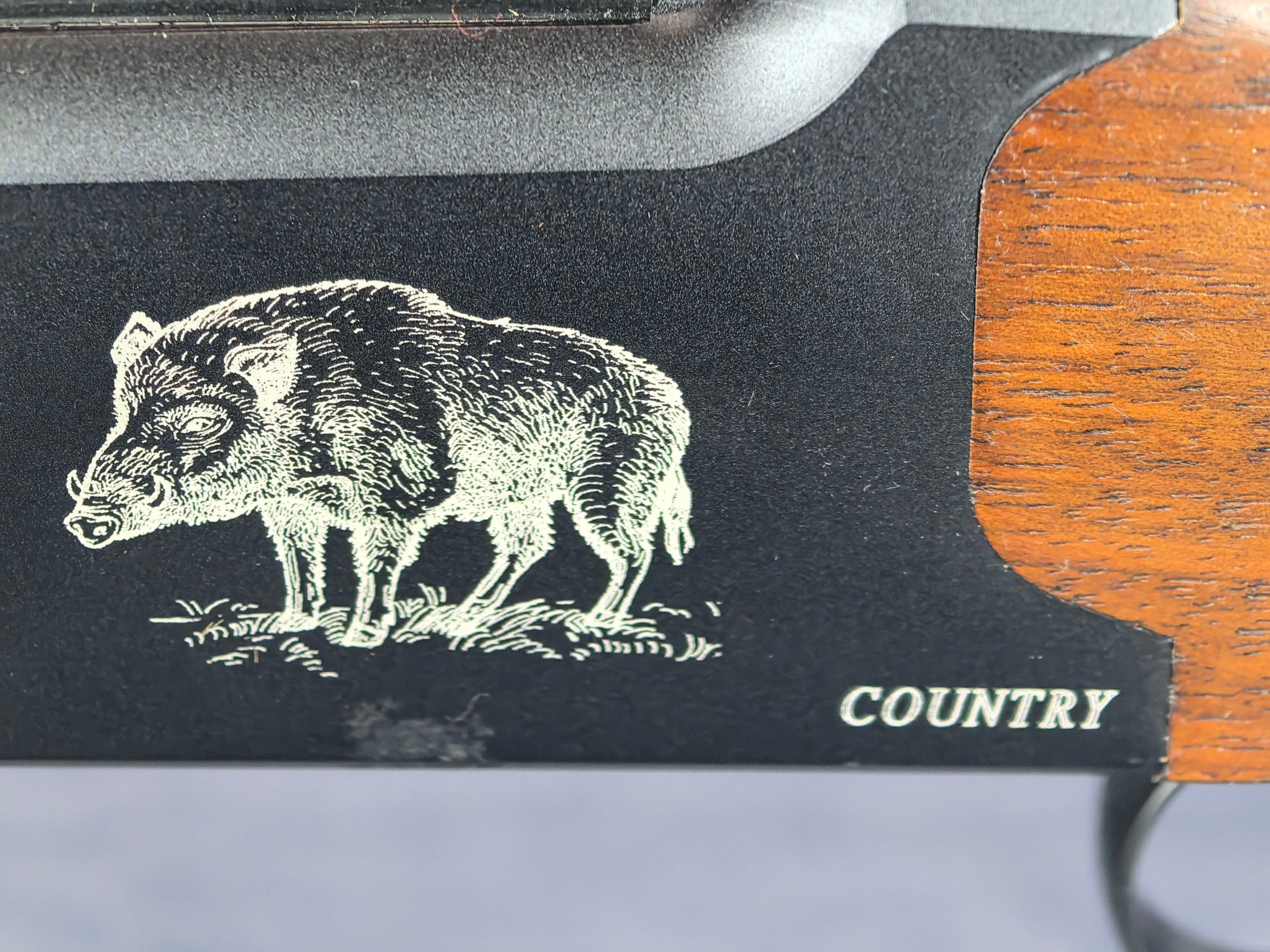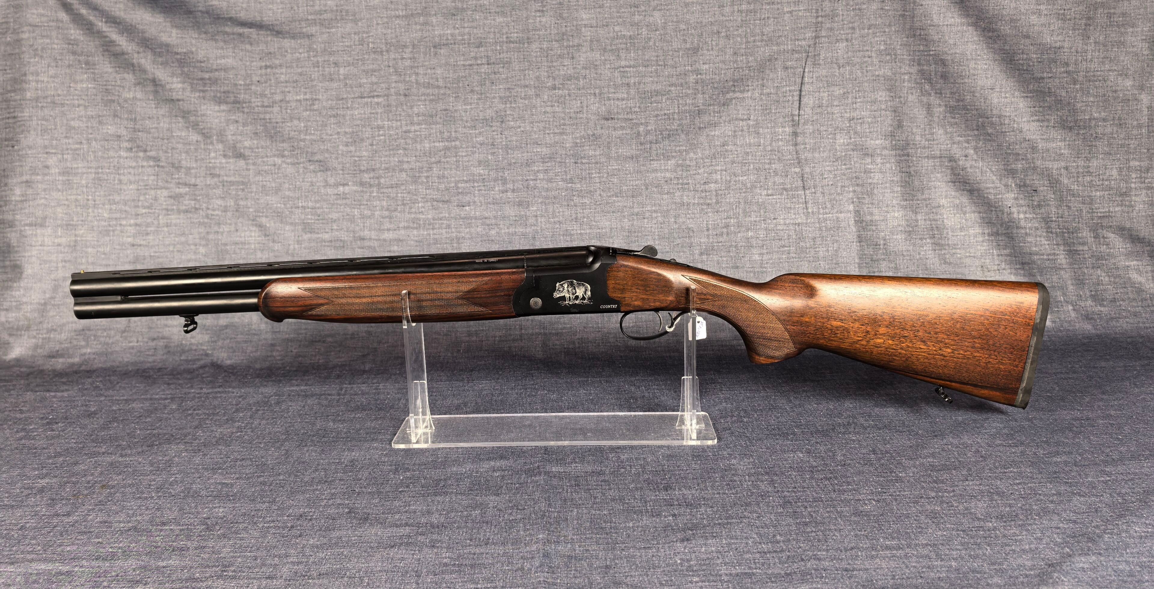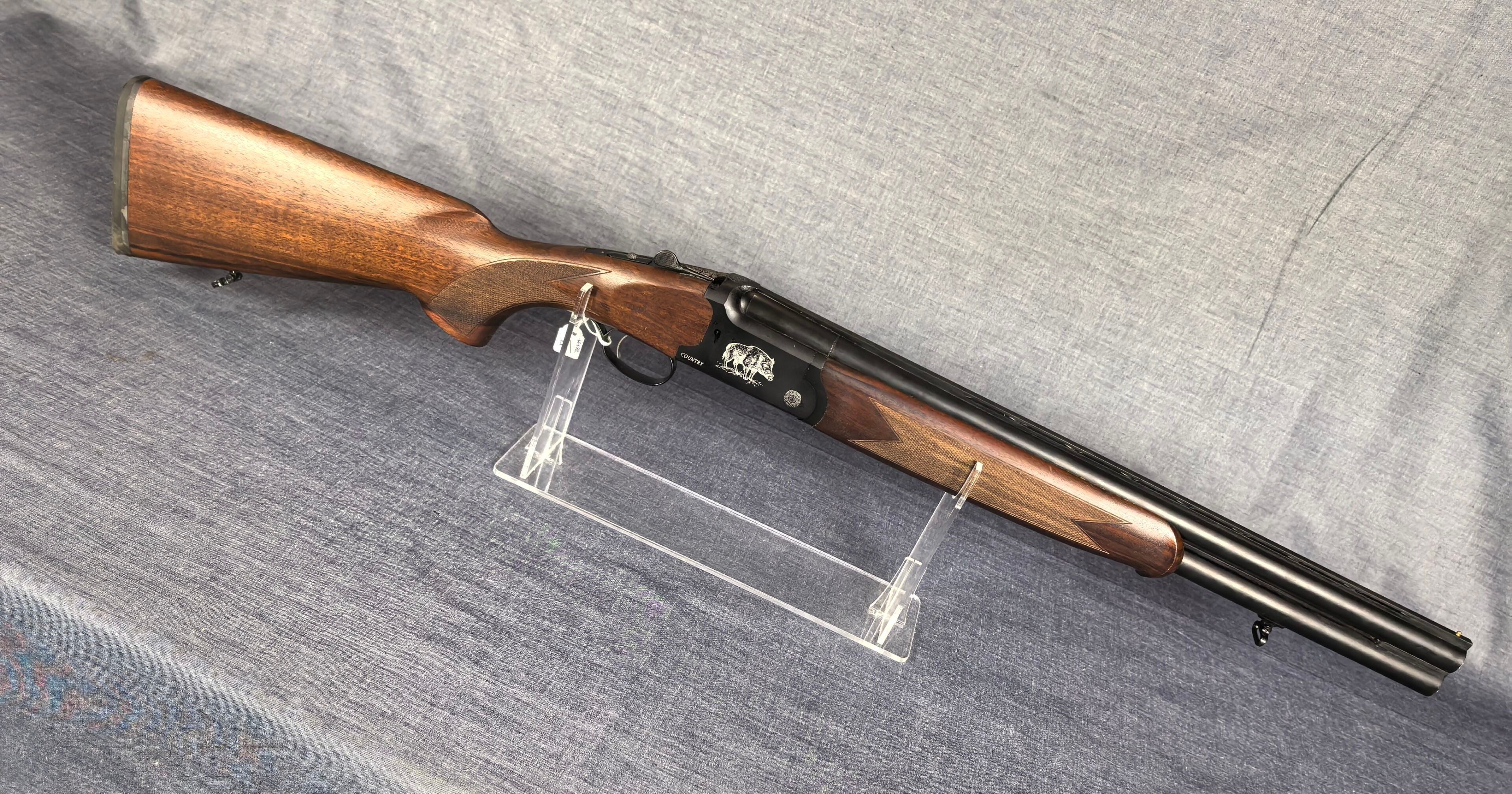 [Cat. C = Shooting/Hunting Licence] YILDIZ SLUG COUNTRY SUPERPOSED RIFLE / CAL. 12/76 - BARS 51 CM Very good condition mirrored barrels Ventilated band front sight Rocker / Rifle frame Alloy, black tempered with wild boar engraving Extractor Mono selective trigger Stock type Half pistol in Walnut N°113840 . N°138848. Category C -