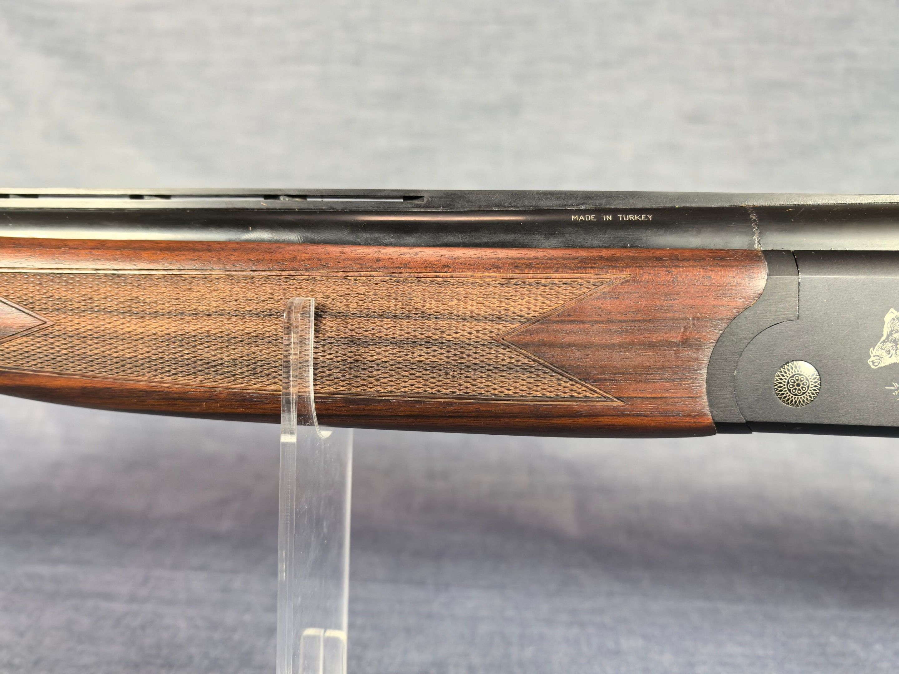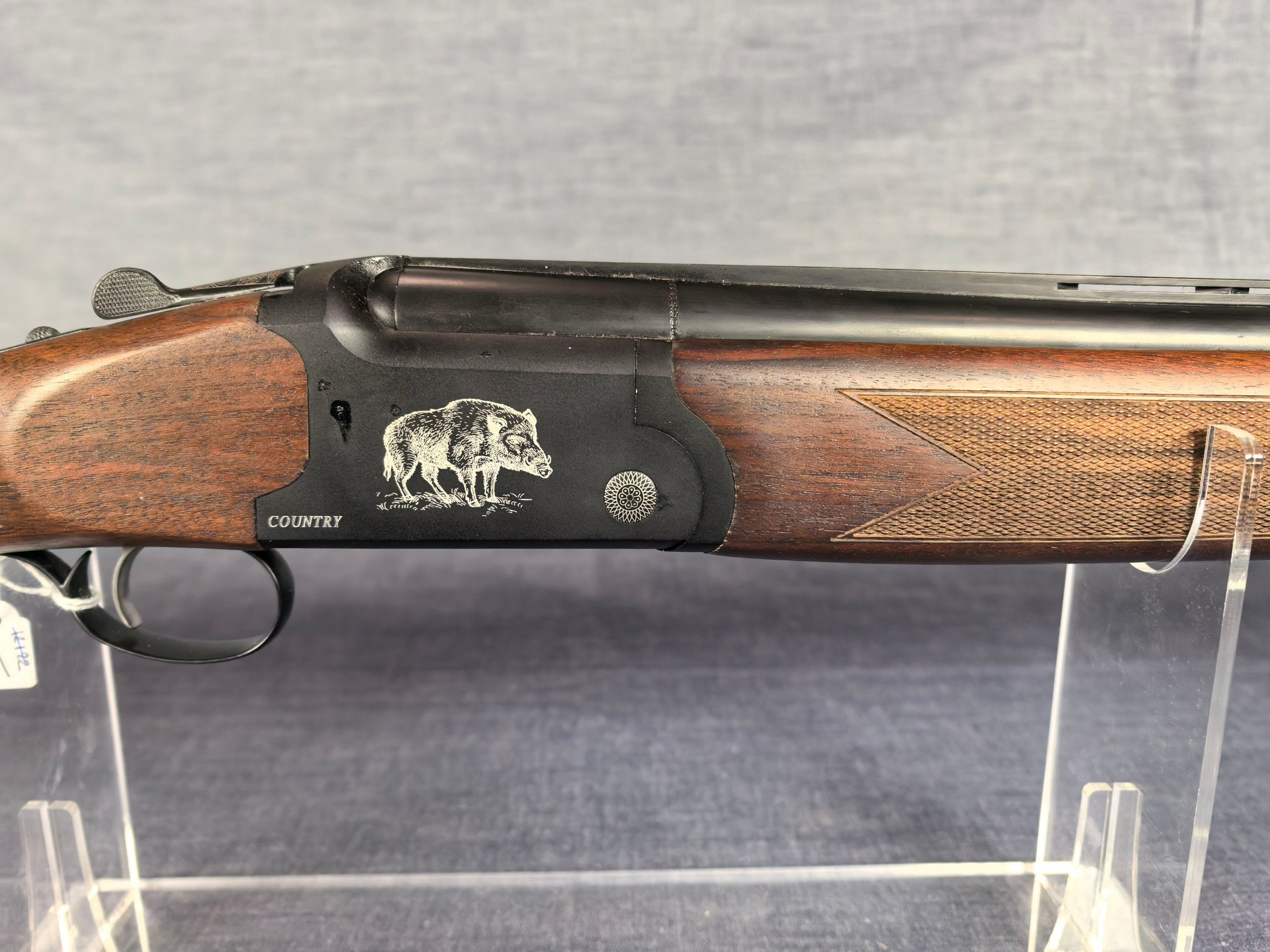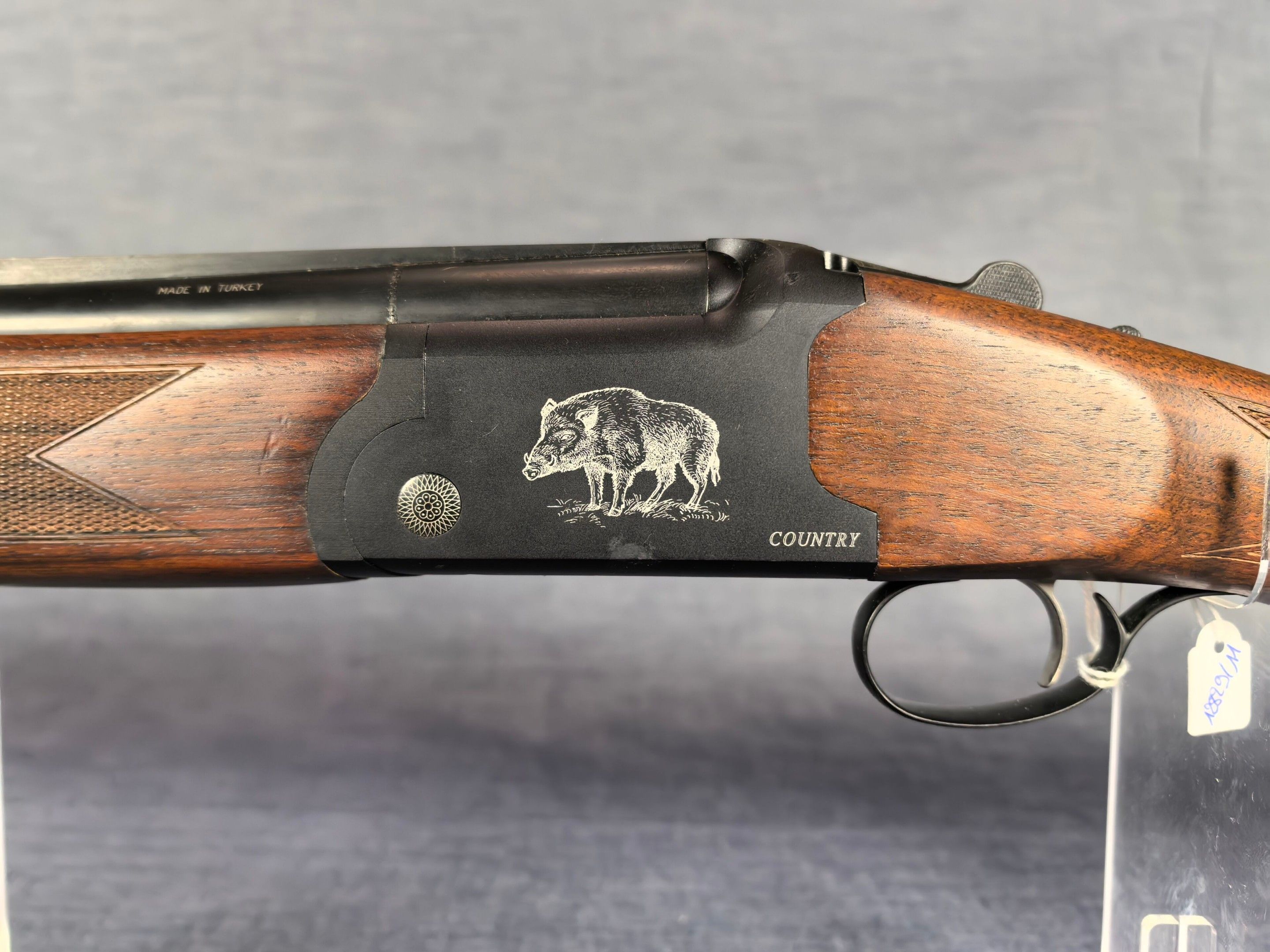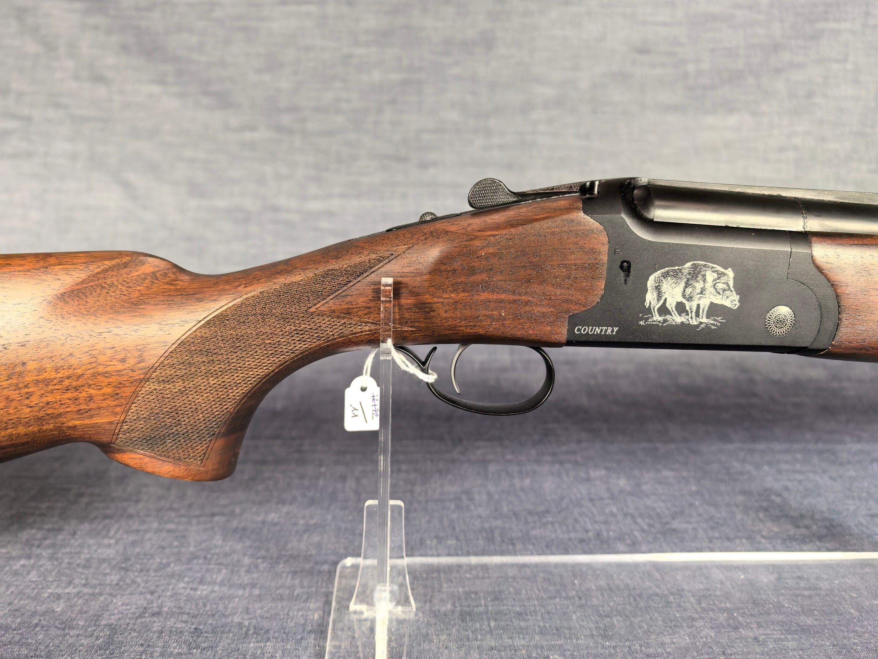 [Cat. C = Shooting/Hunting Licence] YILDIZ SLUG COUNTRY SUPERPOSED RIFLE / CAL. 12/76 - BARS 51 CM Very good condition mirrored barrels Ventilated band front sight Rocker / Rifle frame Alloy, black tempered with wild boar engraving Extractor Mono selective trigger Stock type Half pistol in Walnut N°113840 . N°138848. Category C -