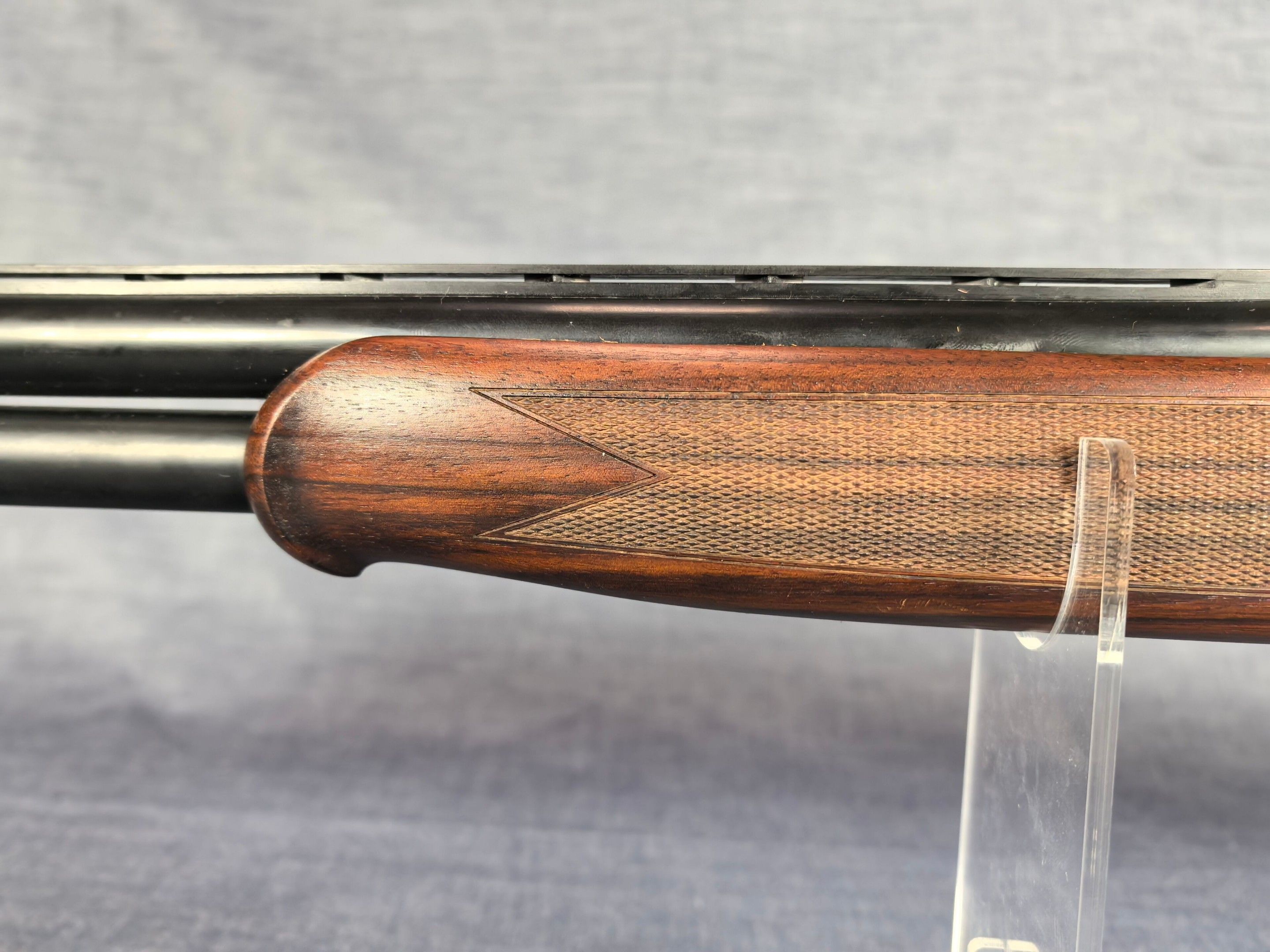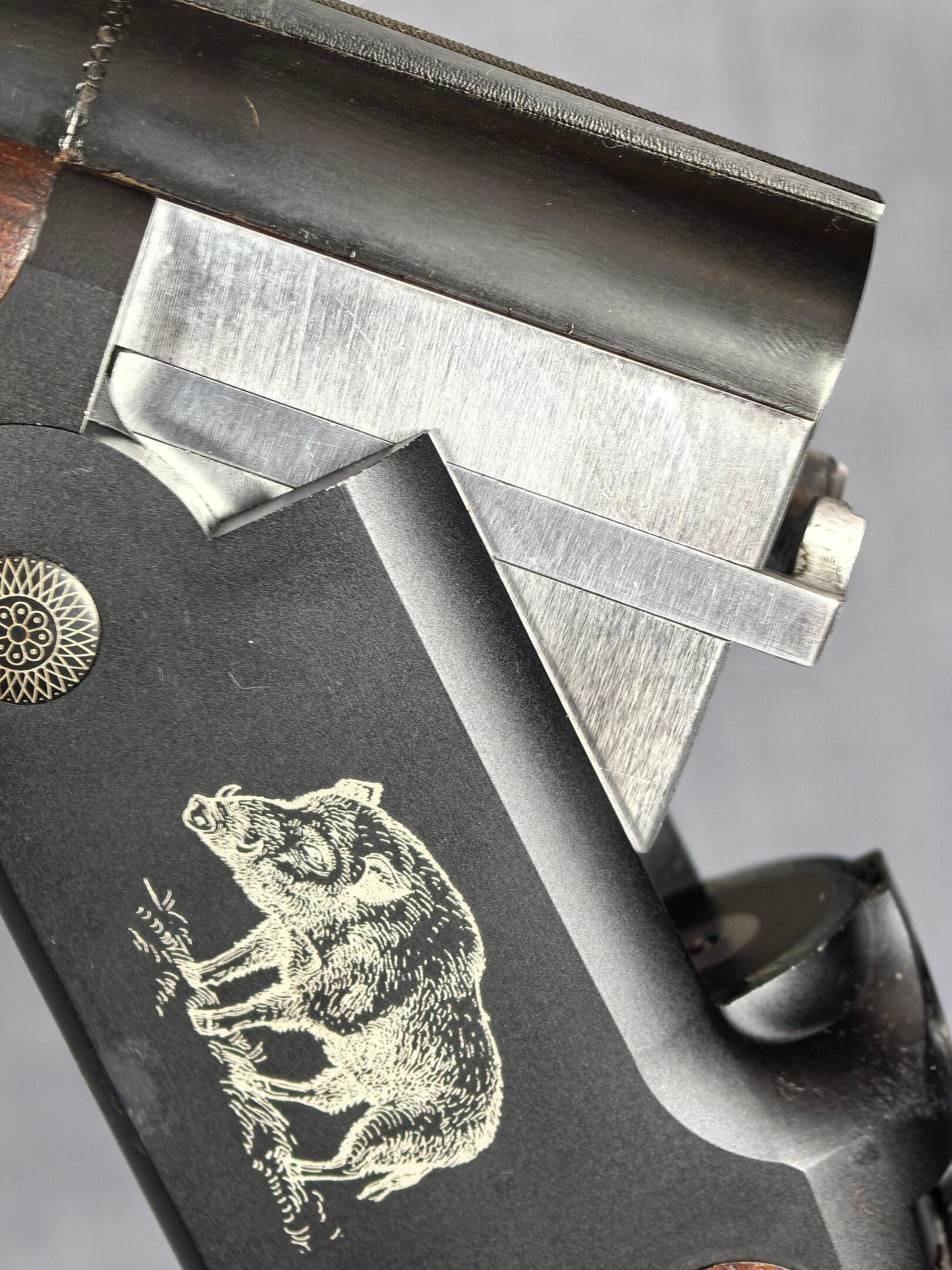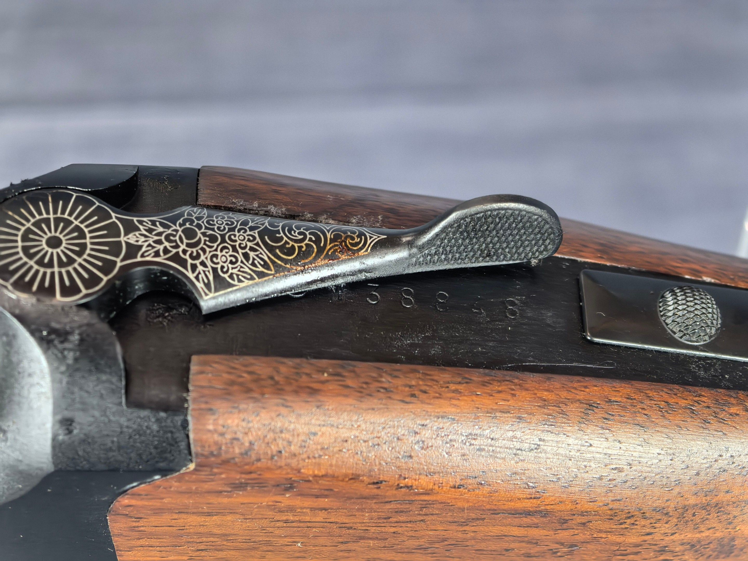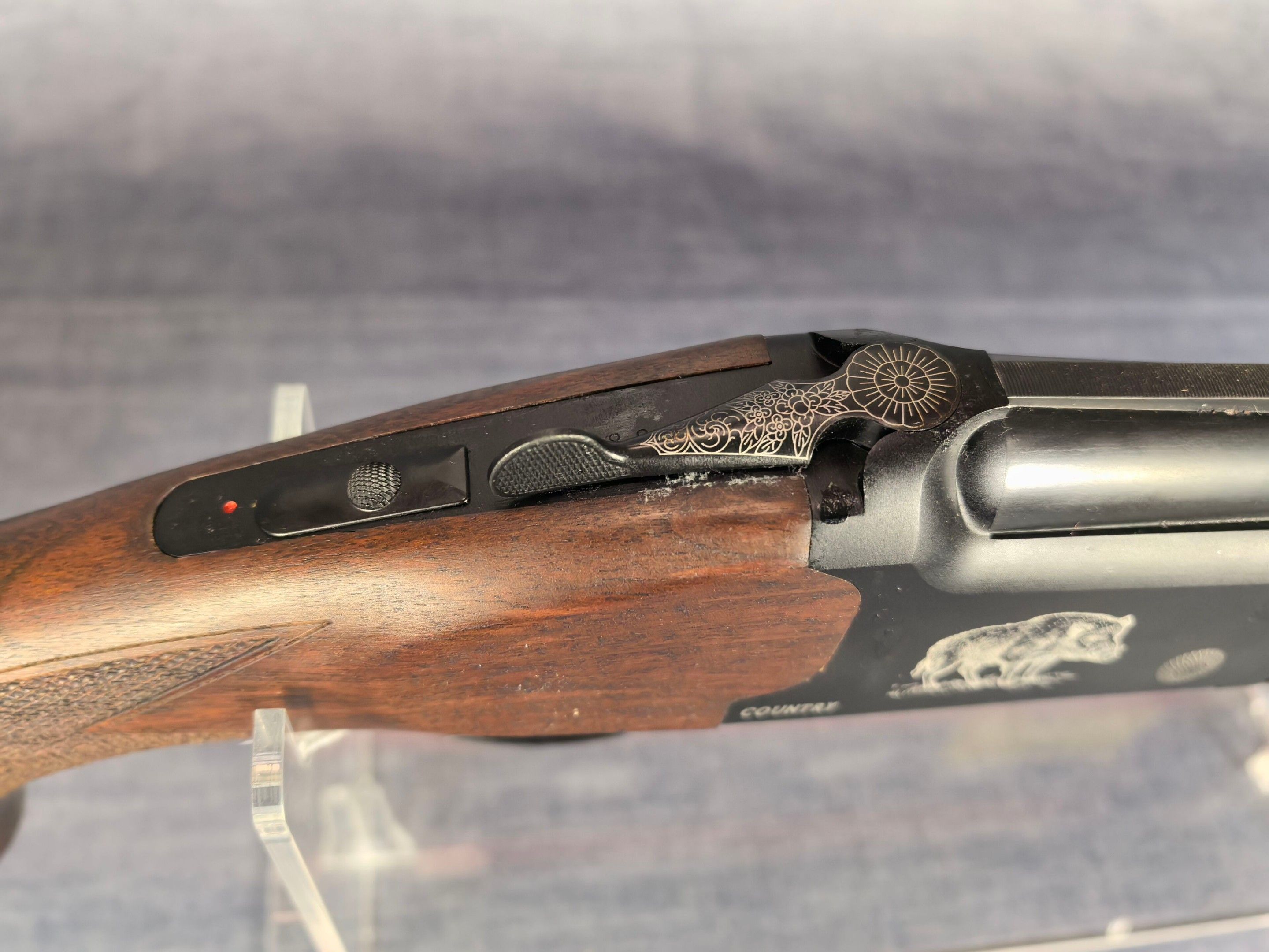 [Cat. C = Shooting/Hunting Licence] YILDIZ SLUG COUNTRY SUPERPOSED RIFLE / CAL. 12/76 - BARS 51 CM Very good condition mirrored barrels Ventilated band front sight Rocker / Rifle frame Alloy, black tempered with wild boar engraving Extractor Mono selective trigger Stock type Half pistol in Walnut N°113840 . N°138848. Category C -