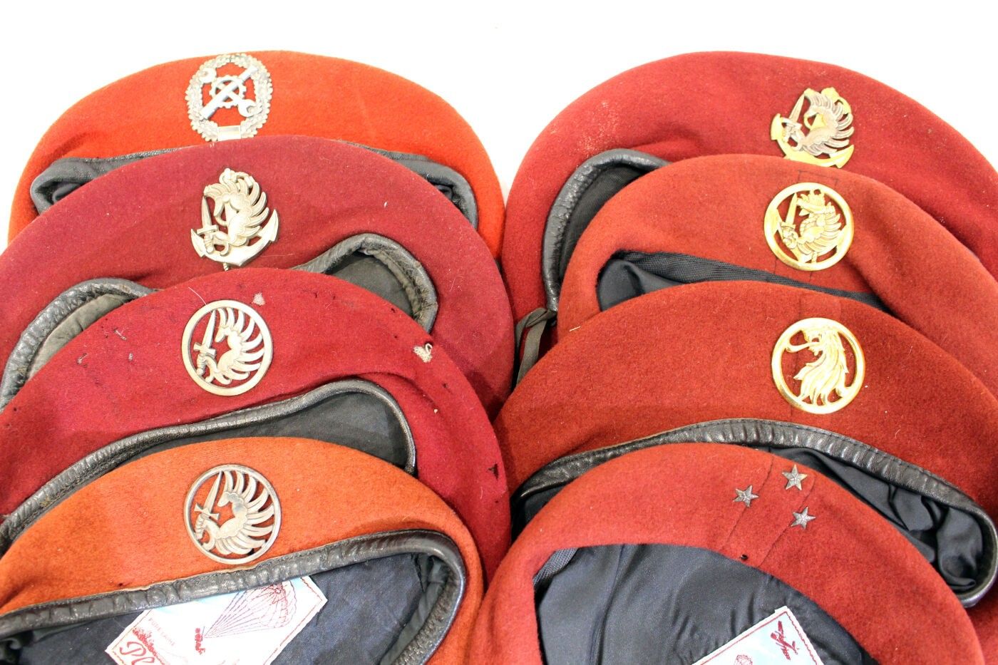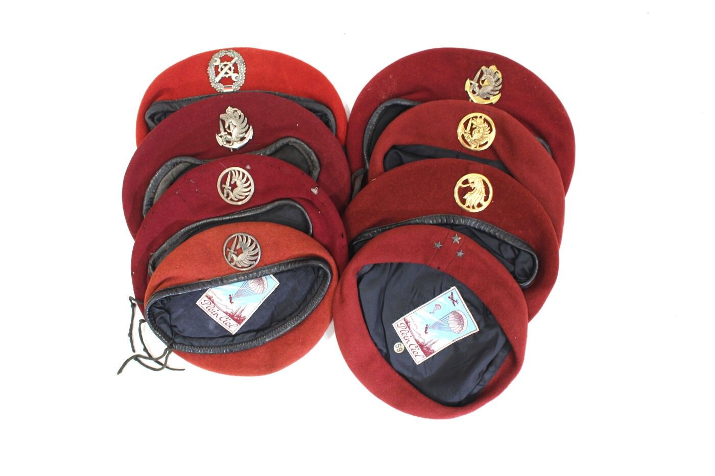 Set of 8 red berets, 1980 model: parachutist division general, military preparation, colonial parachutist, German artillery mechanic.