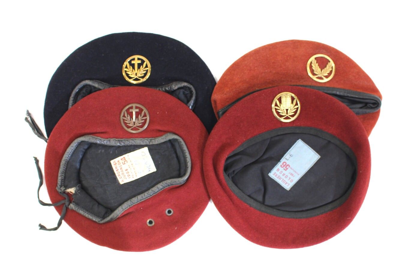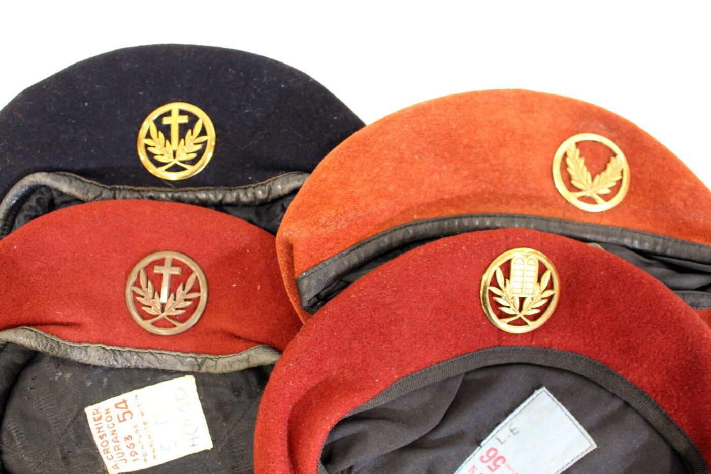 Set of 4 berets, 3 red, 1 blue: Catholic chaplain beret, parachute chaplain from 1962 to 1974, Protestant parachute chaplain, Jewish chaplain.