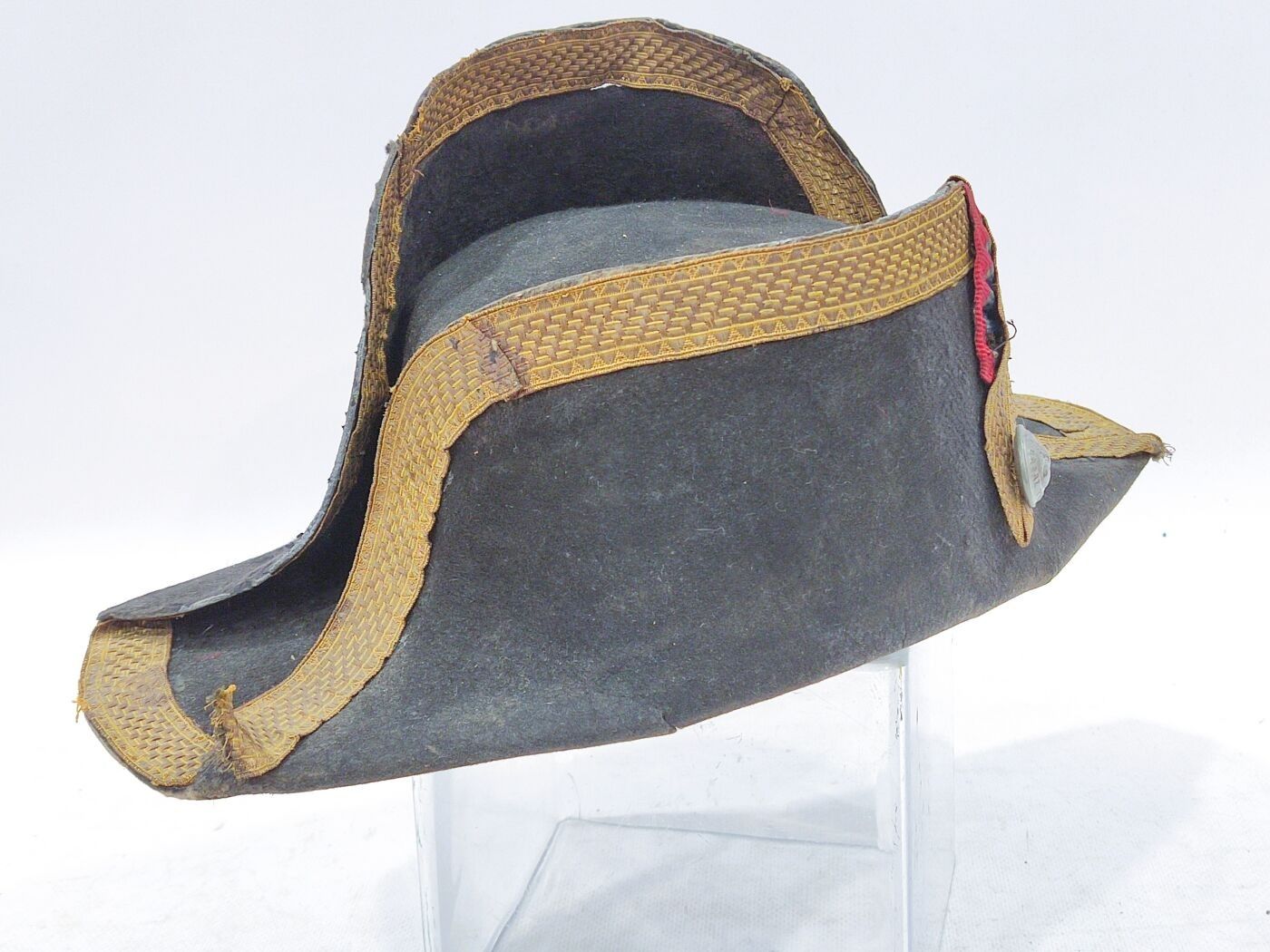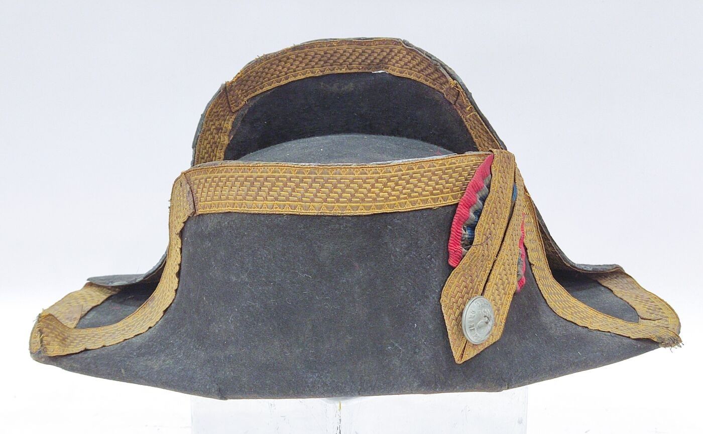 Gendarme's bicorne on the model 1892, marked on the button gendarmerie ordre public, marked inside Commerce de réception des effets, accepté, gendarmerie. Non-original gold braid, cockade and silver button with flaming grenade. ABE