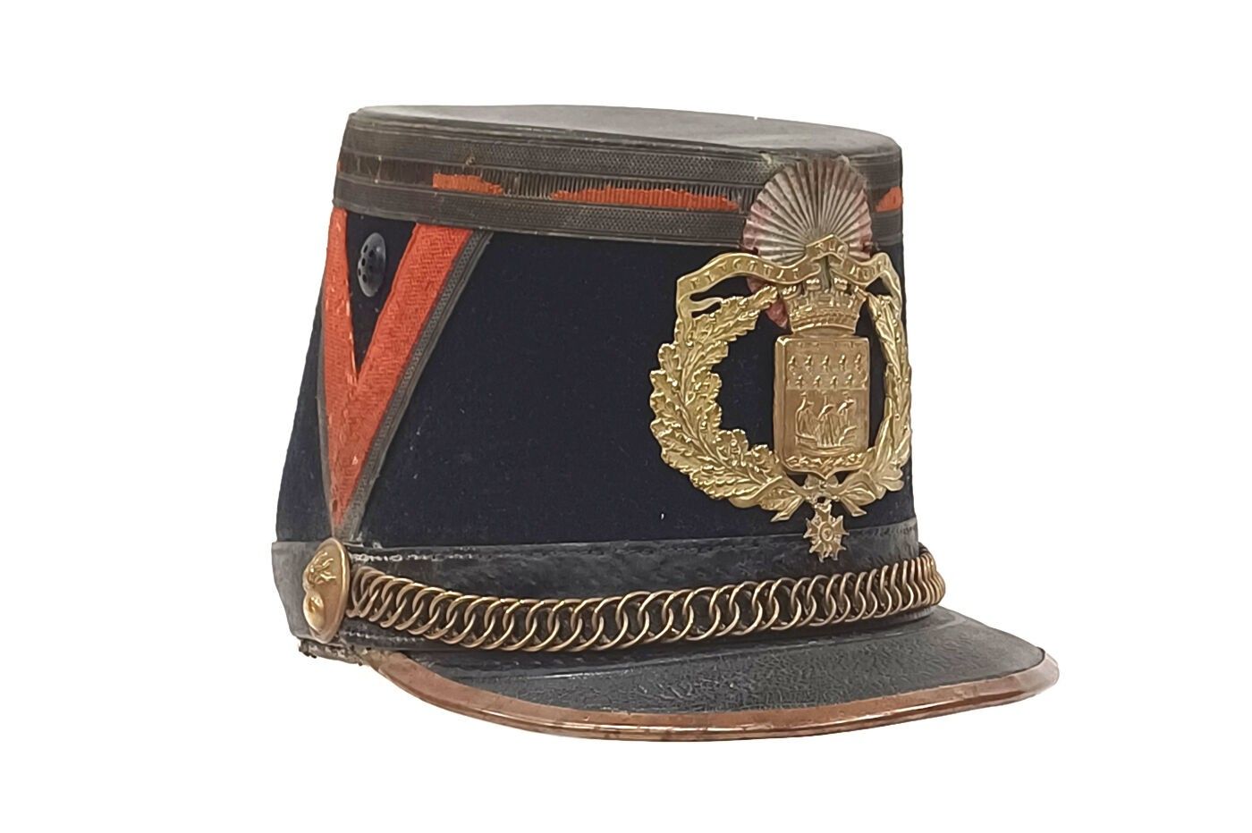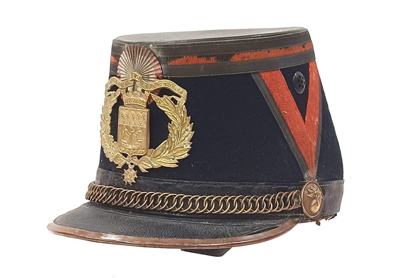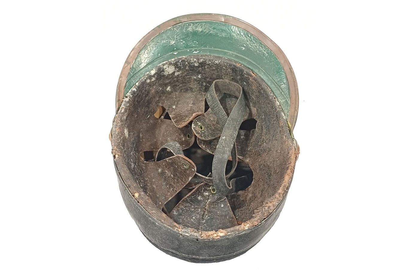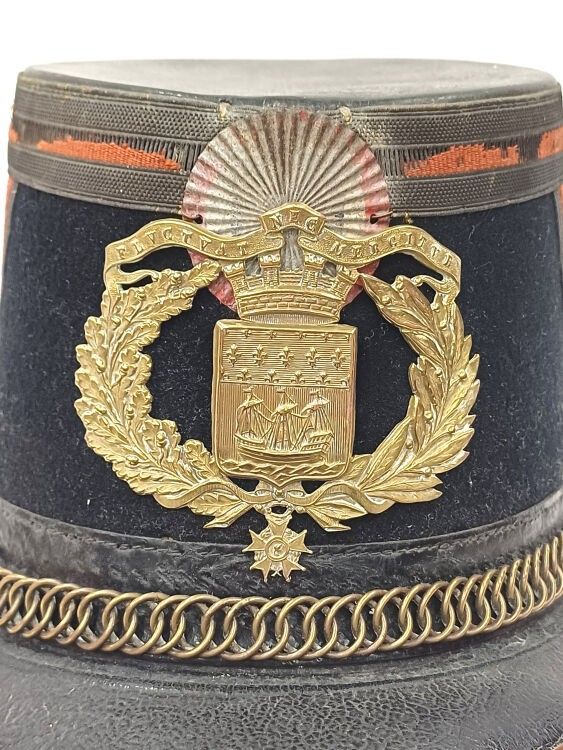 Republican Guard shako model 1907-1910, badge with the arms of Paris, Fluctuat Nec Mergitur, scarlet cloth missing, tricolour cockade, green visor. ABE