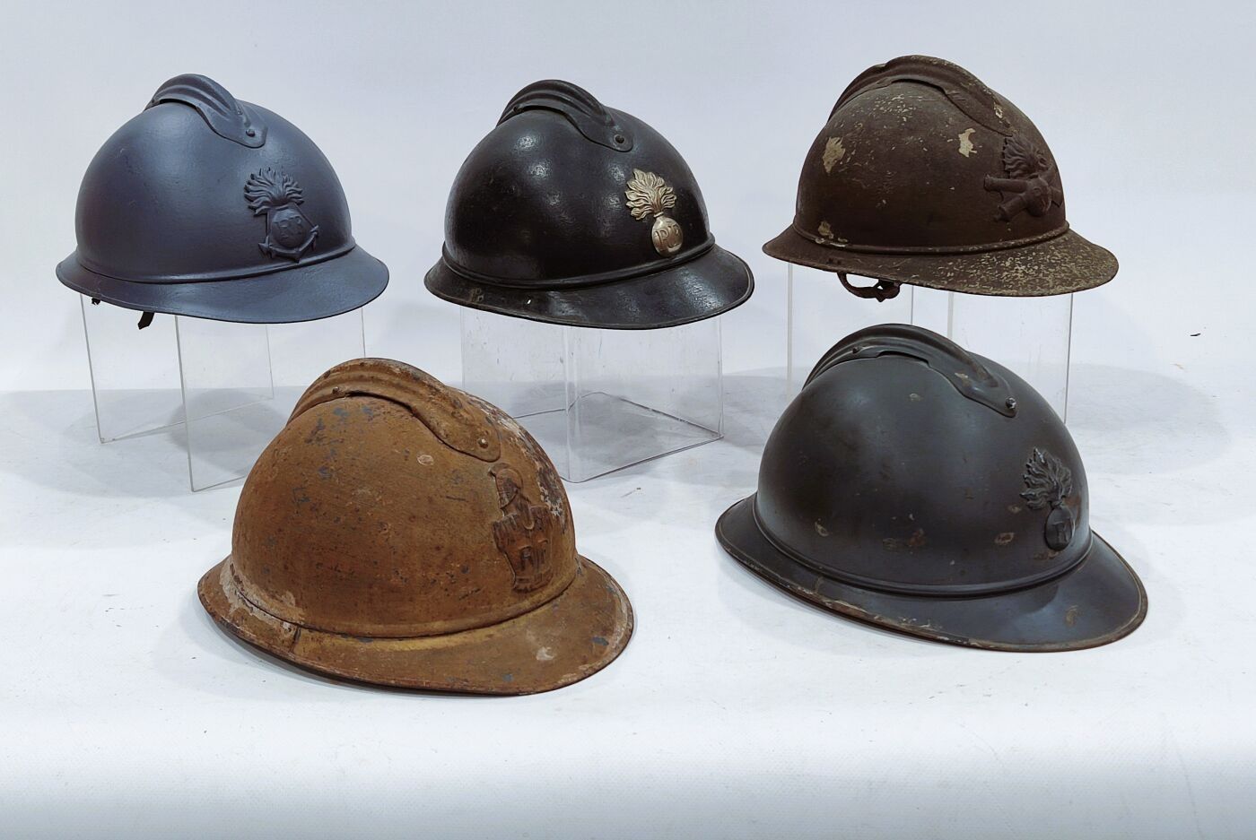 Set of 5 Adrian model 15 helmets in various colours, 4 with their internal caps. Insignia for colonial infantry (repainted), infantry, artillery and engineers, missing.