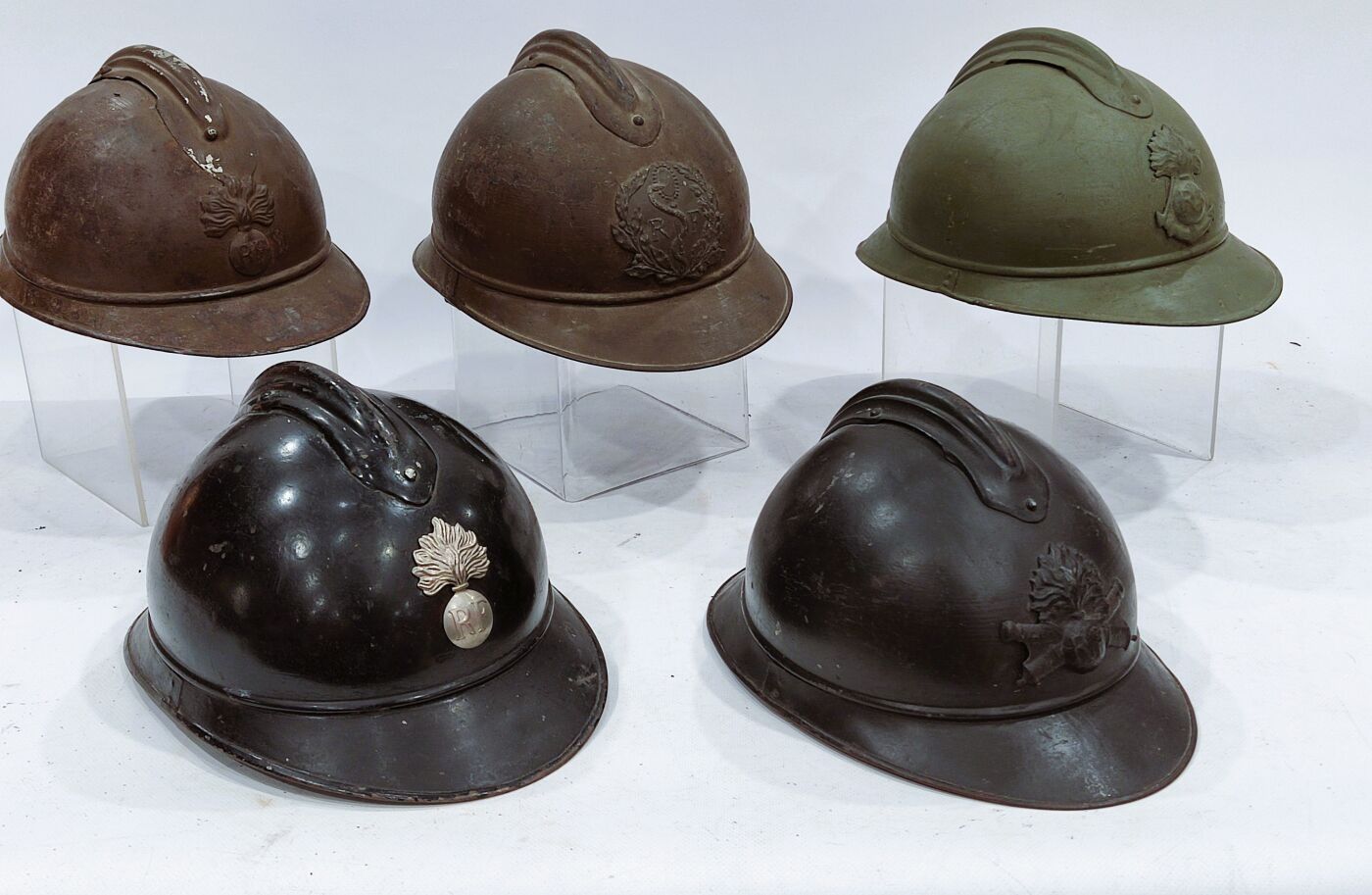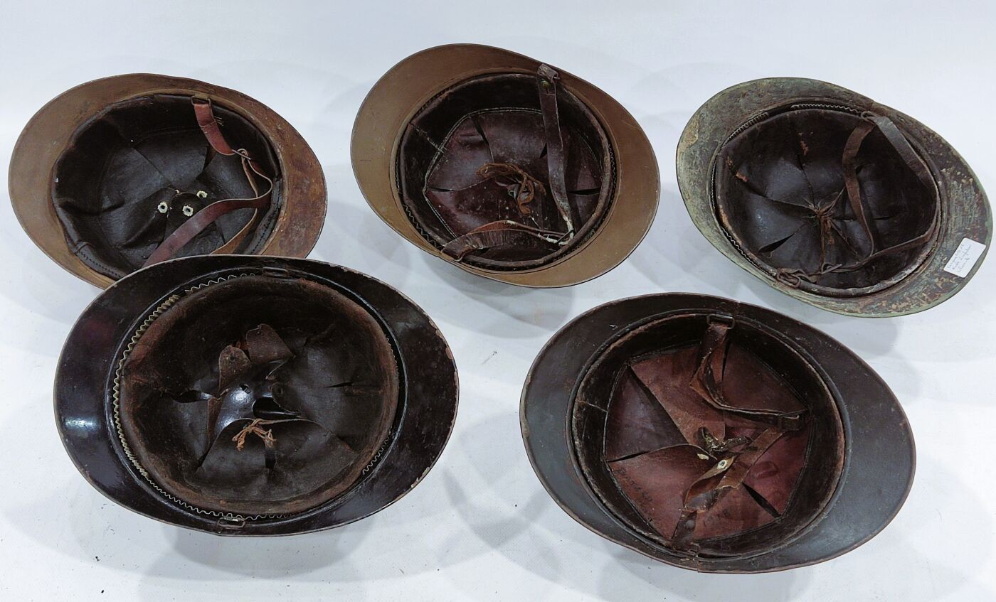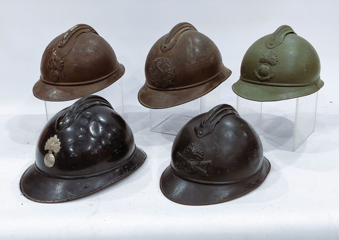 Set of 5 Adrian model 15 helmets in various colours with inner caps. Insignia for infantry, medical services, colonial infantry and artillery. Fair condition, missing.