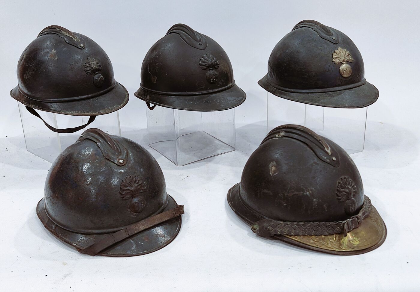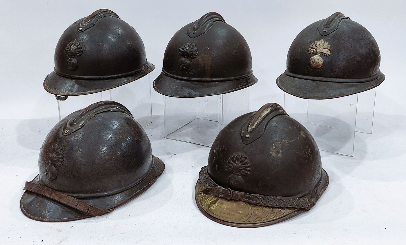 Set of 5 Adrian model 15 infantry helmets with inner caps. Flaming grenade insignia marked RF, one with plate and braided chinstrap. Fair condition, knocks, oxidation, missing parts.