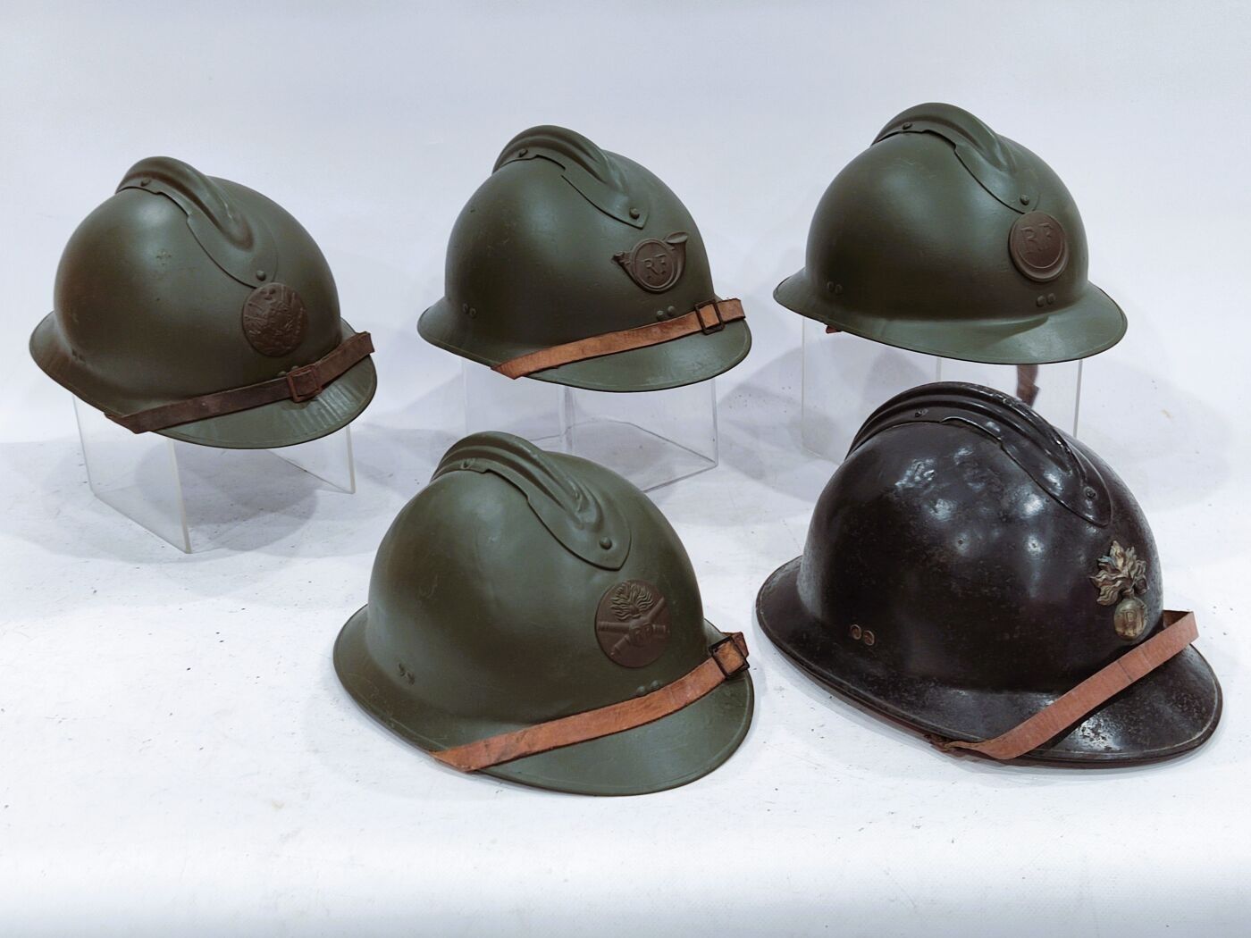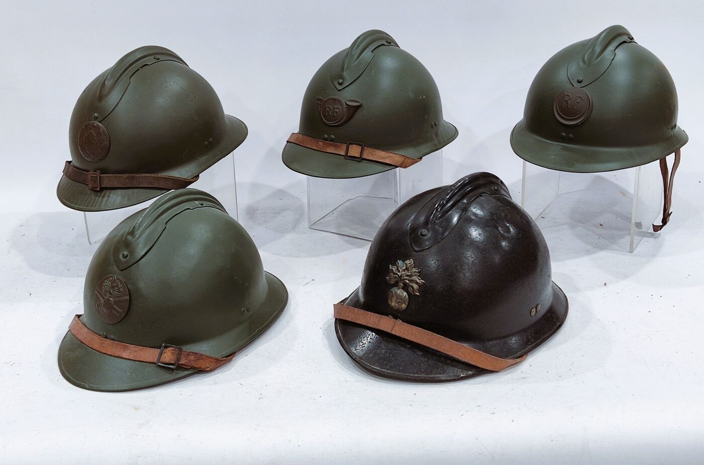 Set of 5 Adrian model 26 helmets, repainted, old and modern internal caps. Insignia for chasseur, zouave or tirailleur, artillery and miscellaneous, not guaranteed. Fairly good condition.